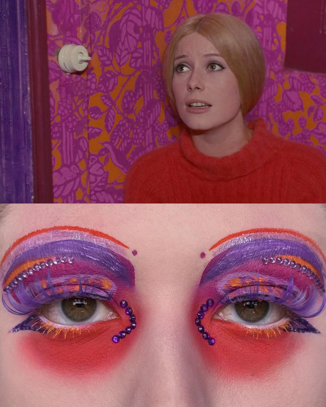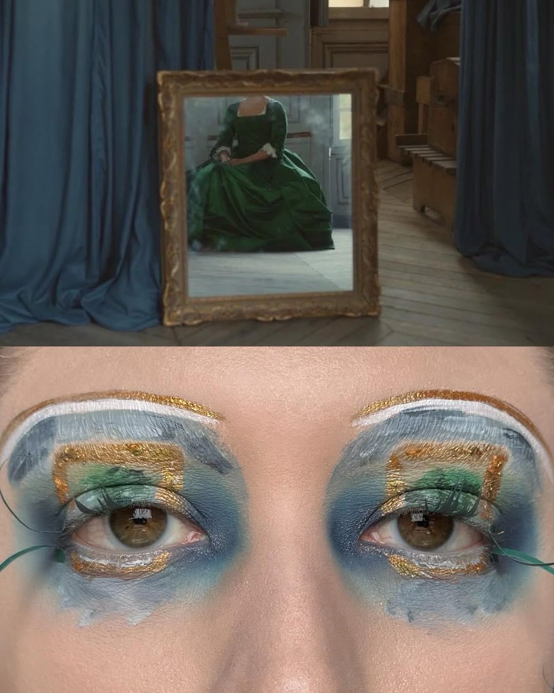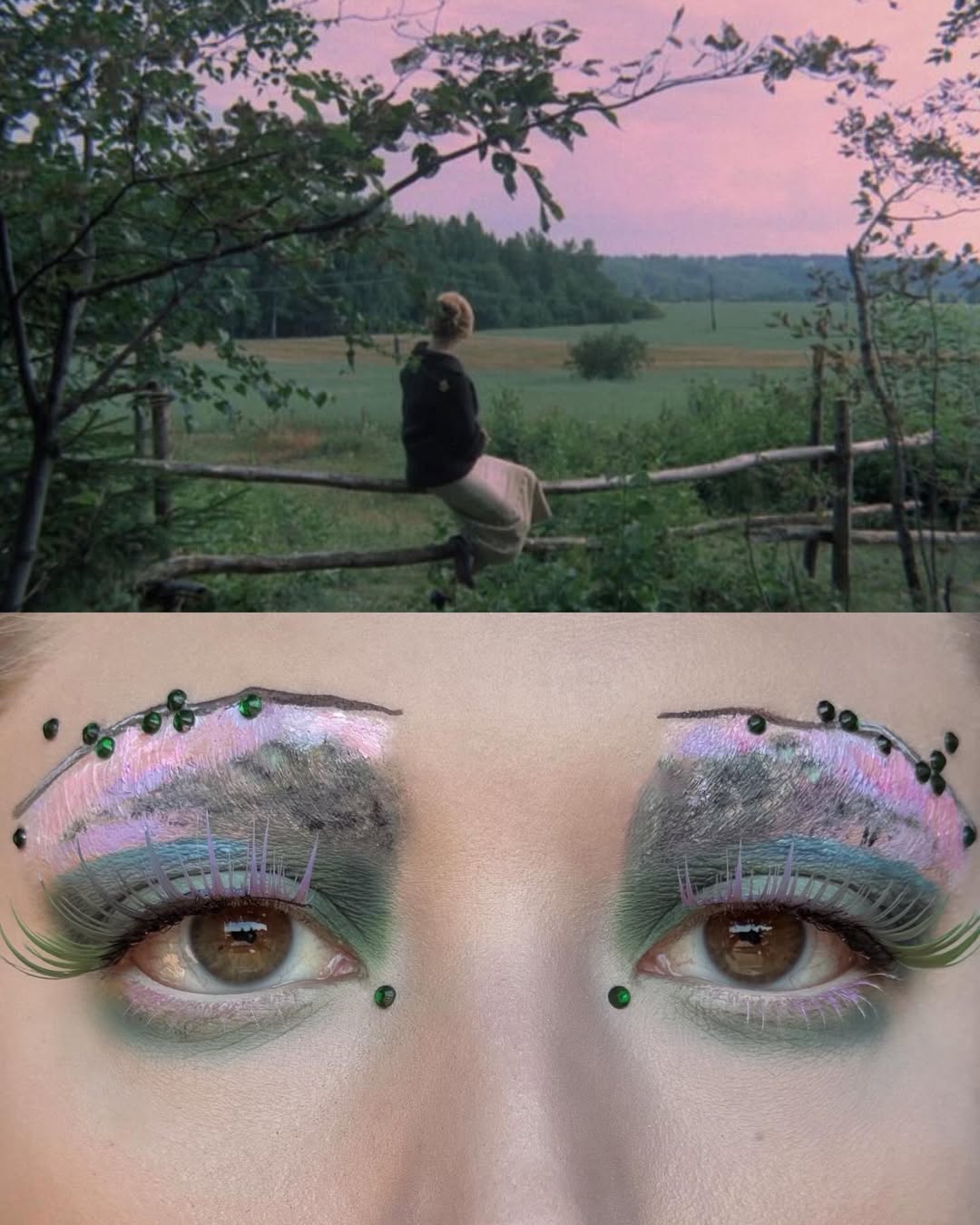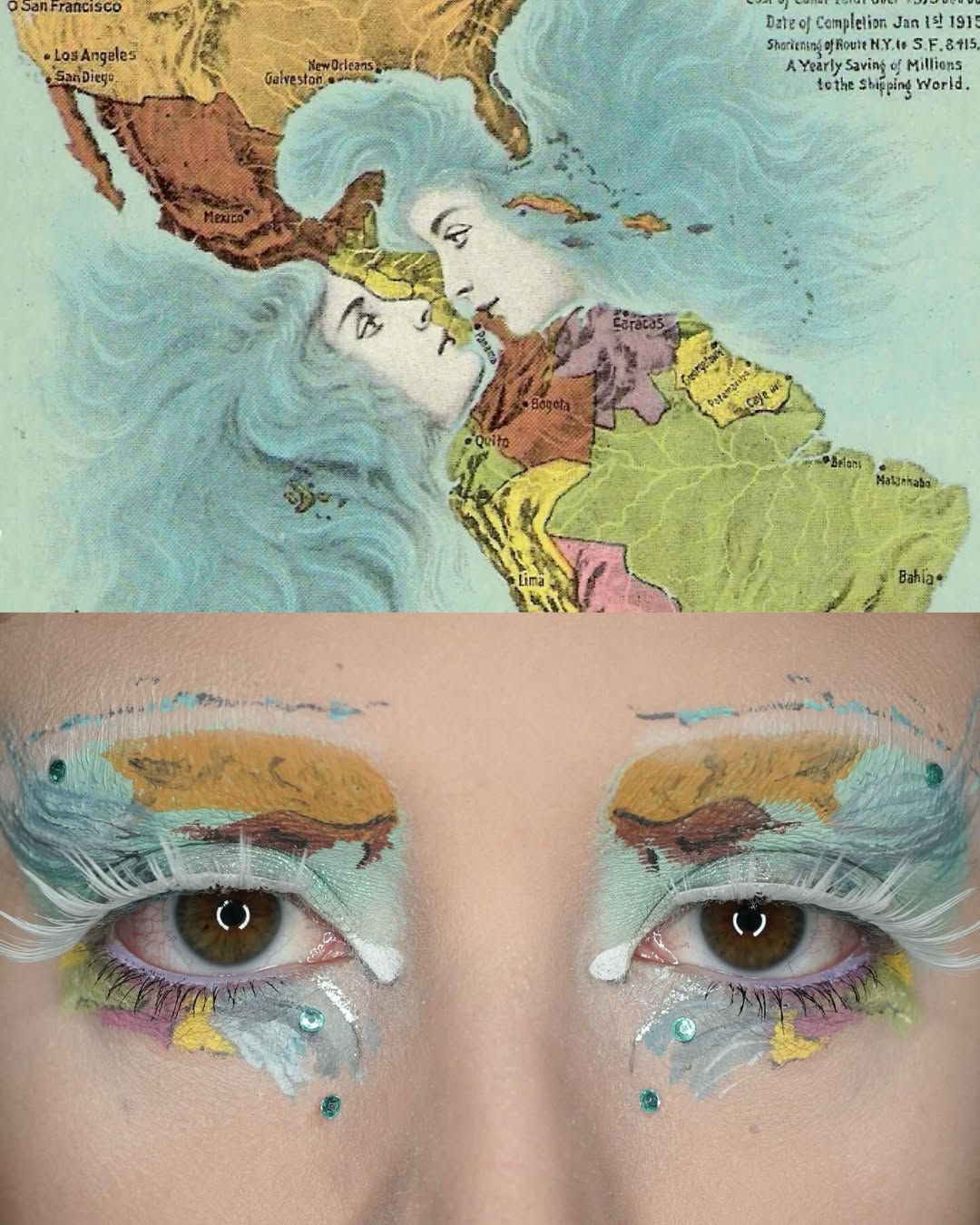 編輯自己私心最愛 Wes Anderson 的《Moonrise Kingdom》(月昇冒險王國 / 小學雞私奔記)這個妝容,橘色欄杆幻化為強烈線條感的眉與眼線,襯托著藍天白雲眼影,下眼瞼那一抹藍更是神來之筆,精準呼應欄杆間隙中透出的藍天,Emerald Vysions 不僅畫出了 Wes Anderson 標誌性的復古配色,更保留了對稱與精緻感,重現電影那種怪誕又魔幻的美學。