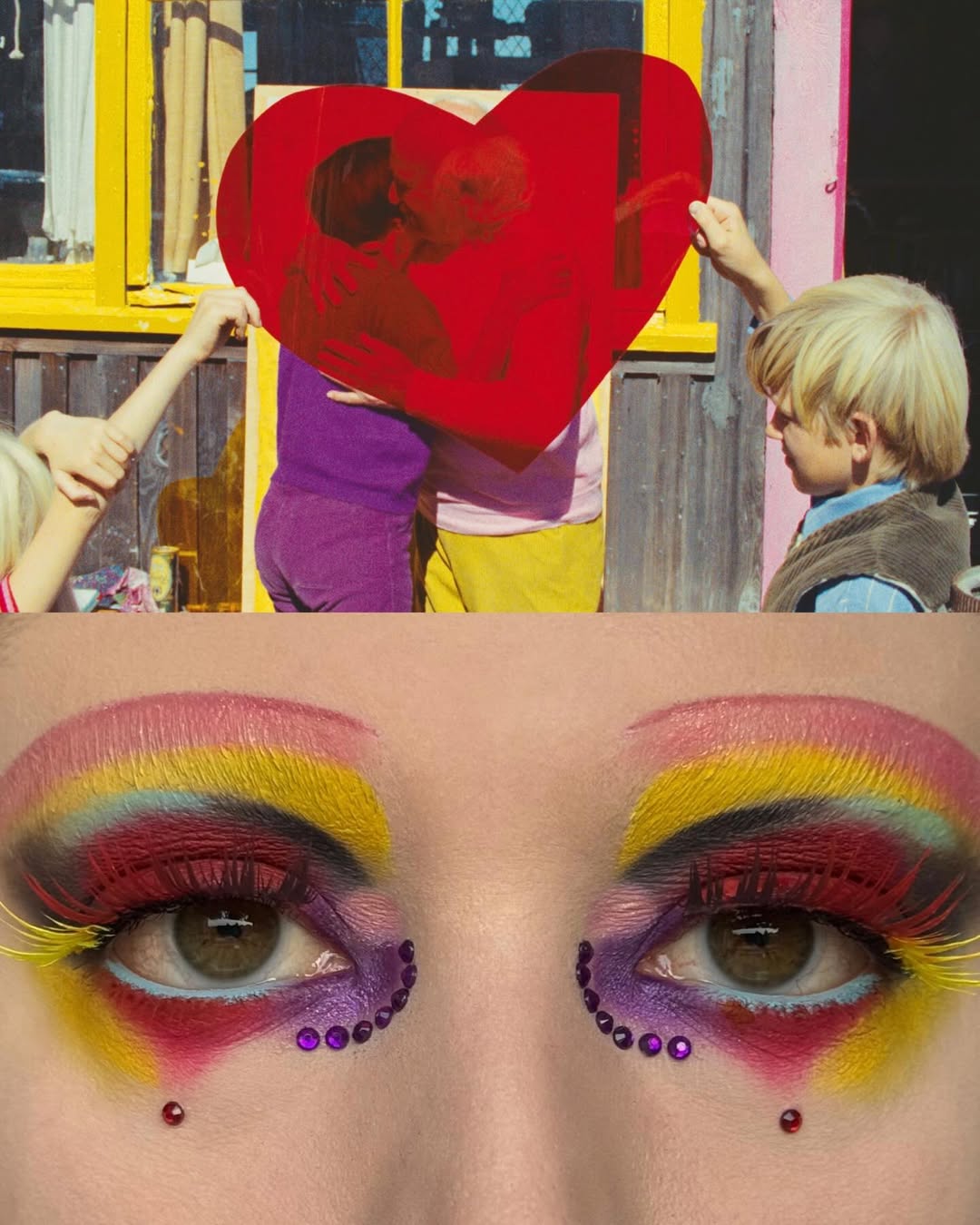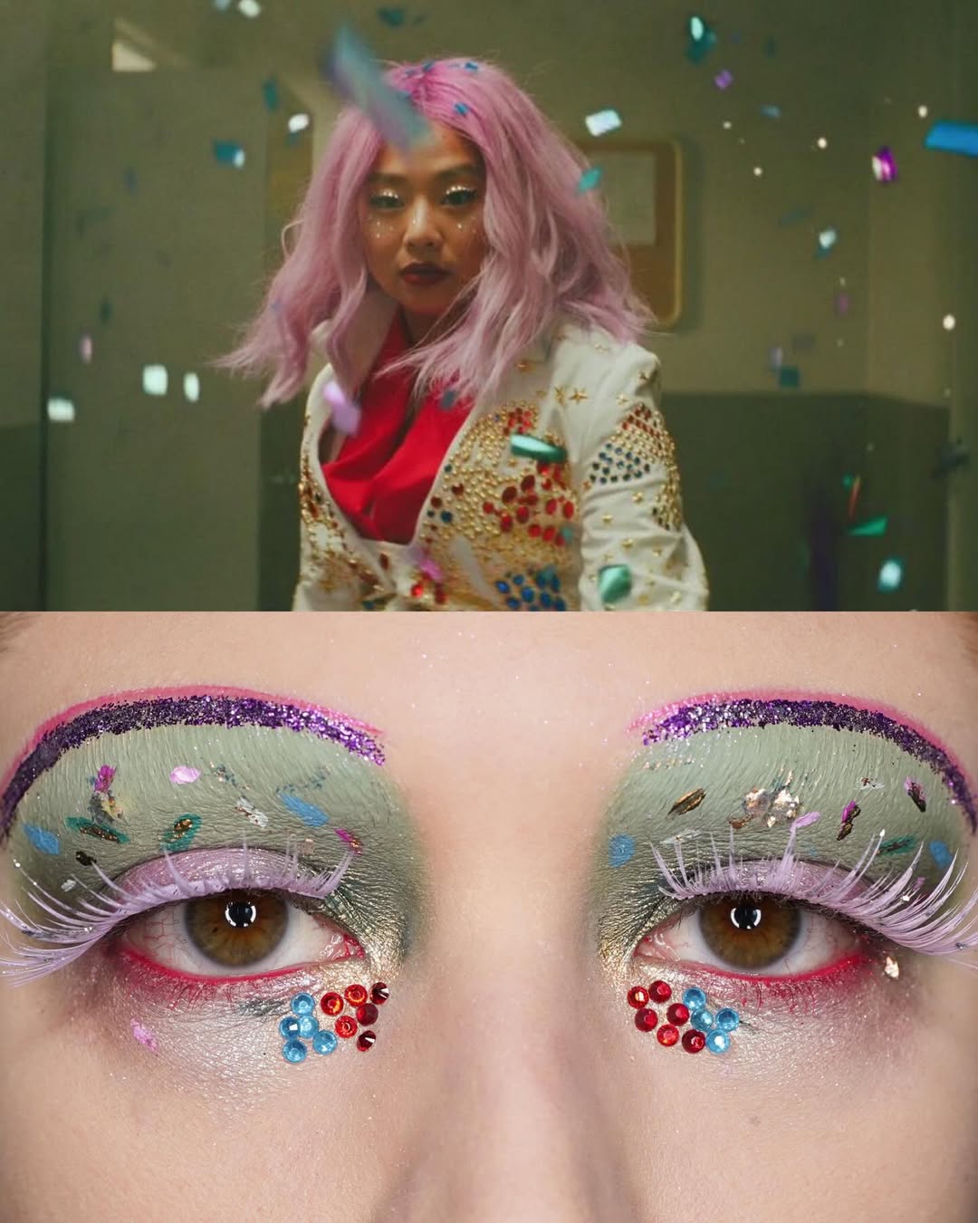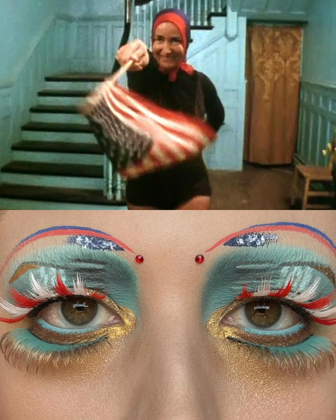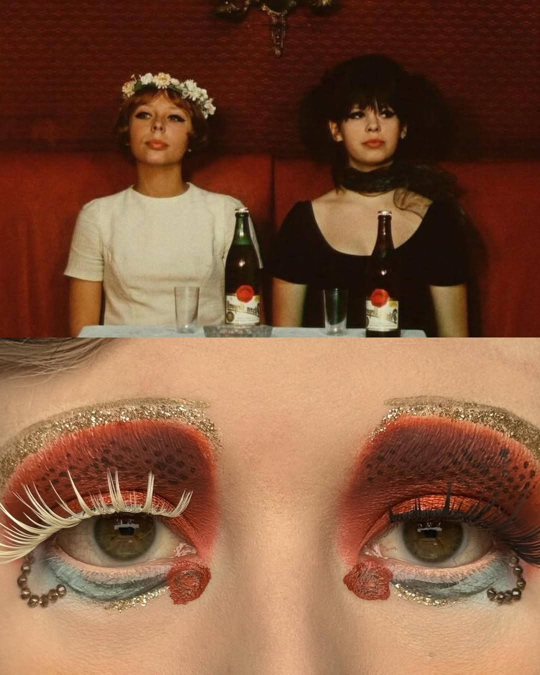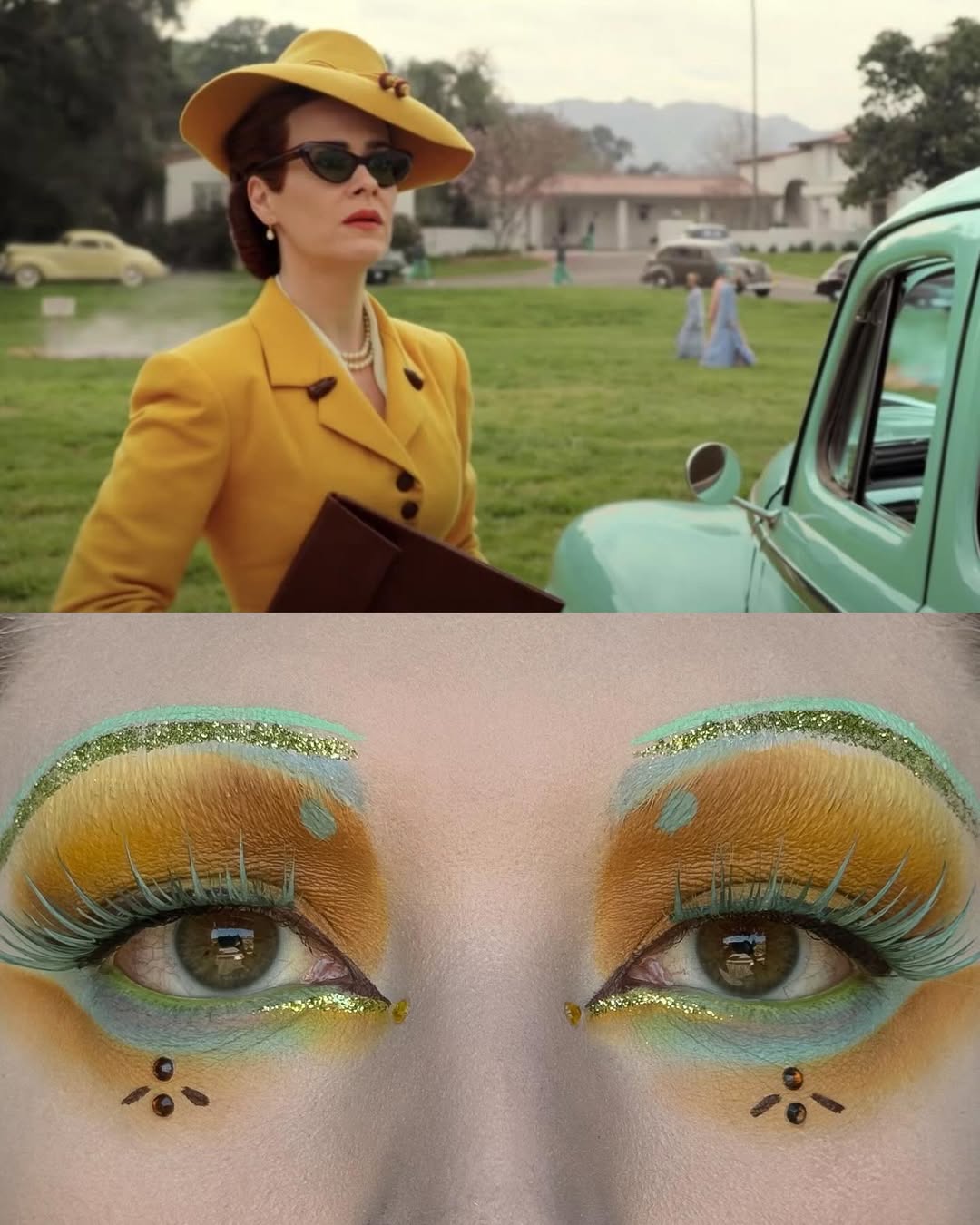編輯自己私心最愛 Wes Anderson 的《Moonrise Kingdom》(月昇冒險王國 / 小學雞私奔記)這個妝容,橘色欄杆幻化為強烈線條感的眉與眼線,襯托著藍天白雲眼影,下眼瞼那一抹藍更是神來之筆,精準呼應欄杆間隙中透出的藍天,Emerald Vysions 不僅畫出了 Wes Anderson 標誌性的復古配色,更保留了對稱與精緻感,重現電影那種怪誕又魔幻的美學。