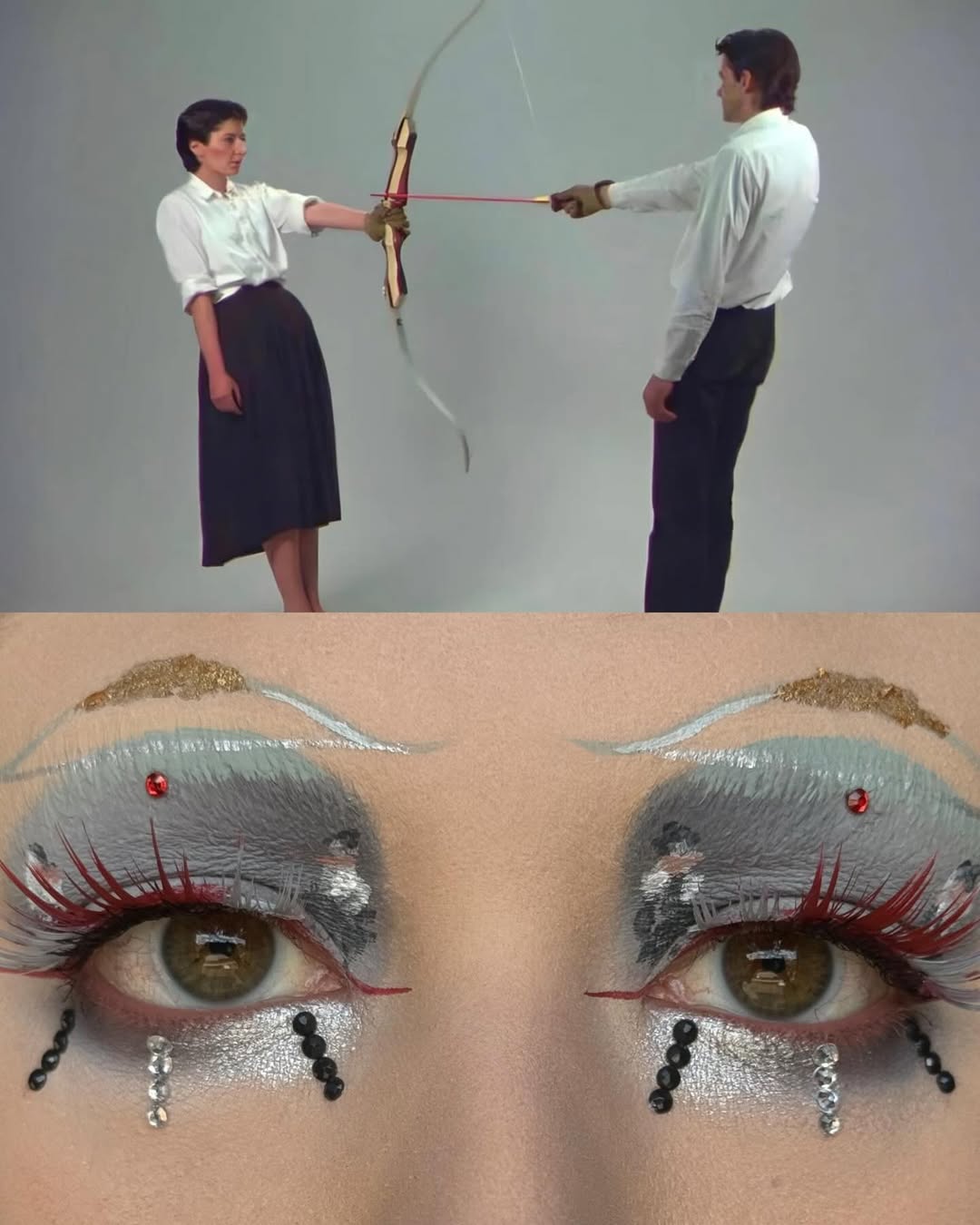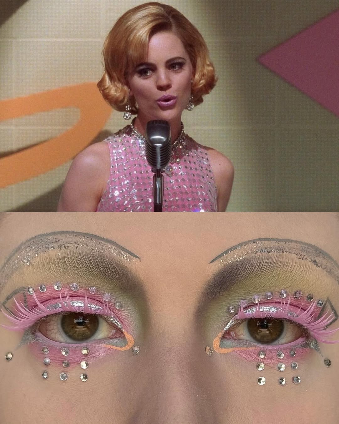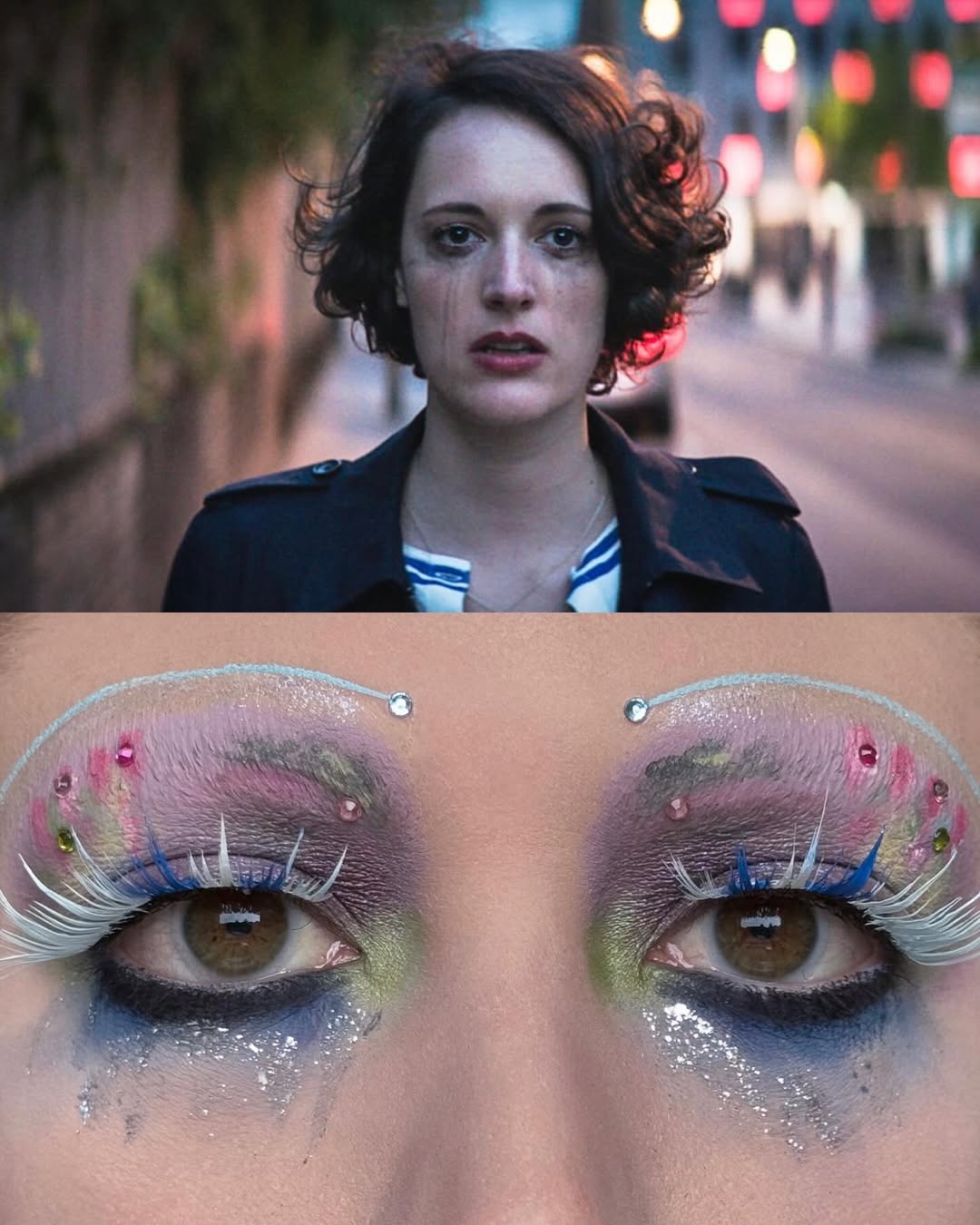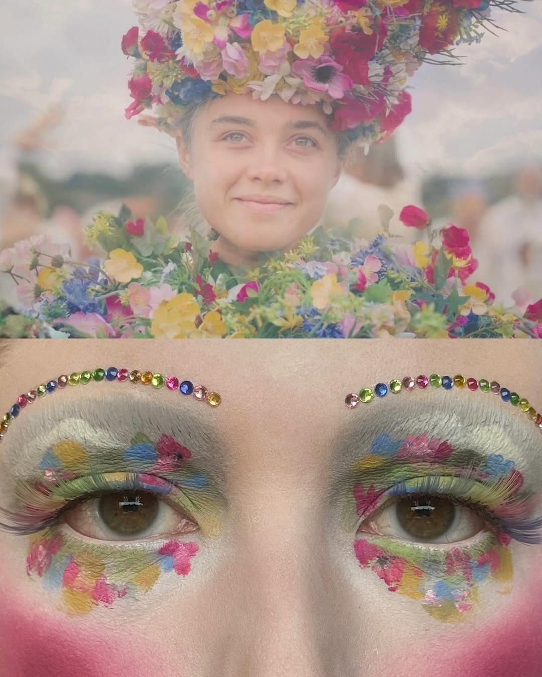 編輯自己私心最愛 Wes Anderson 的《Moonrise Kingdom》(月昇冒險王國 / 小學雞私奔記)這個妝容,橘色欄杆幻化為強烈線條感的眉與眼線,襯托著藍天白雲眼影,下眼瞼那一抹藍更是神來之筆,精準呼應欄杆間隙中透出的藍天,Emerald Vysions 不僅畫出了 Wes Anderson 標誌性的復古配色,更保留了對稱與精緻感,重現電影那種怪誕又魔幻的美學。