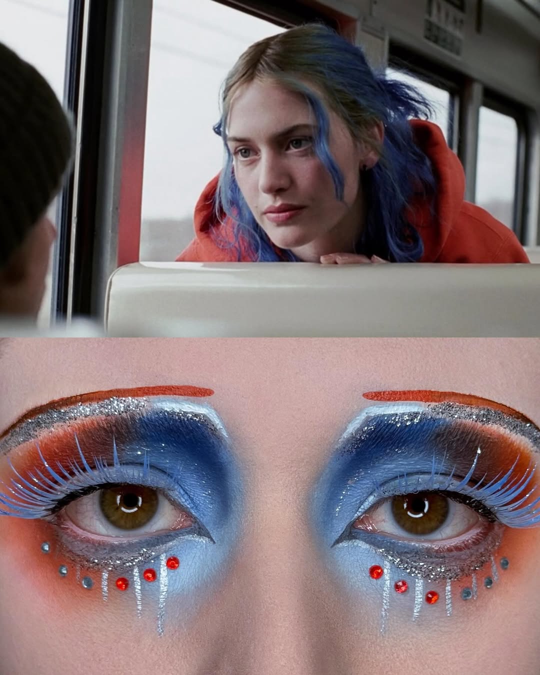 《Eternal Sunshine of the Spotless Mind》(王牌冤家)的妝容,Emerald Vysions 則選擇了男女主角初次相遇的畫面,妝容巧妙運用湛藍與橘色,呼應自由奔放的藍色頭髮和橘色帽 T。