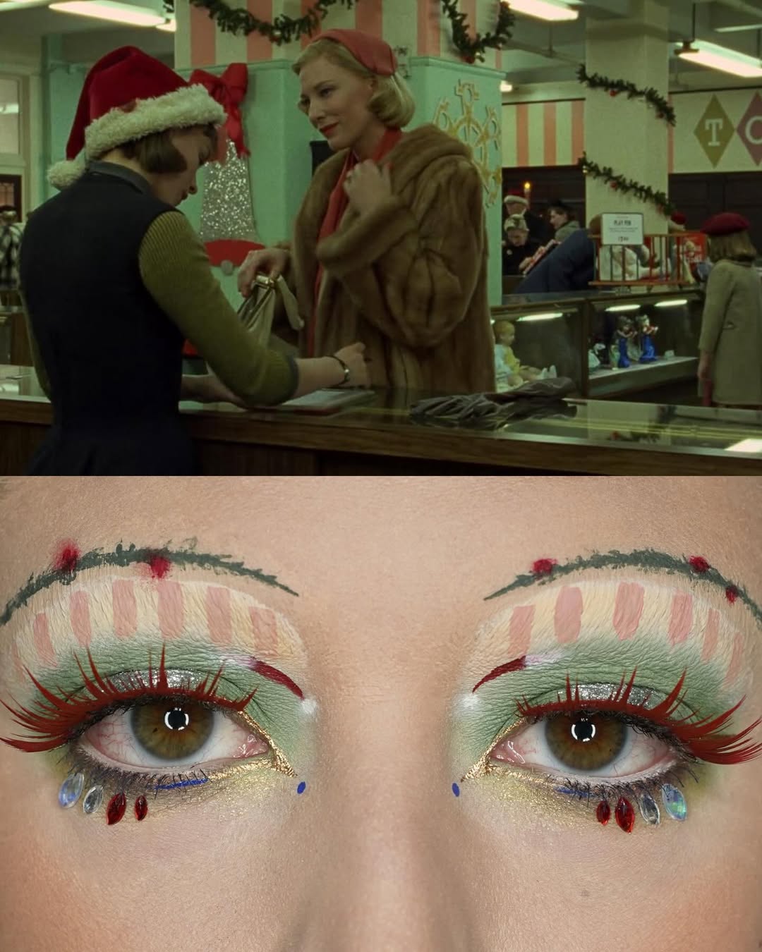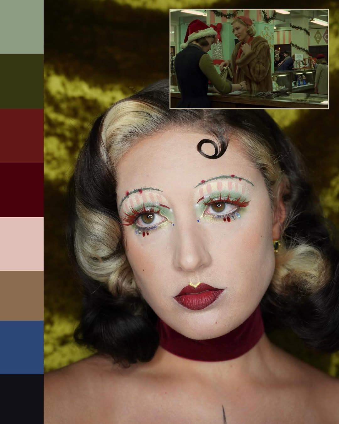 最初會注意到 Emerald Vysions,就是因為一系列以電影為創作核心的妝容作品,她以電影畫面為靈感,將經典畫面透過彩妝解構,幻化作色彩,一筆一筆運用色彩與線條重現在臉龐上,比如靈感來自經典電影《Carol》(因為愛你 / 卡露的情人)的妝容,她就採用綠色調與紅唇帶來強烈對比。