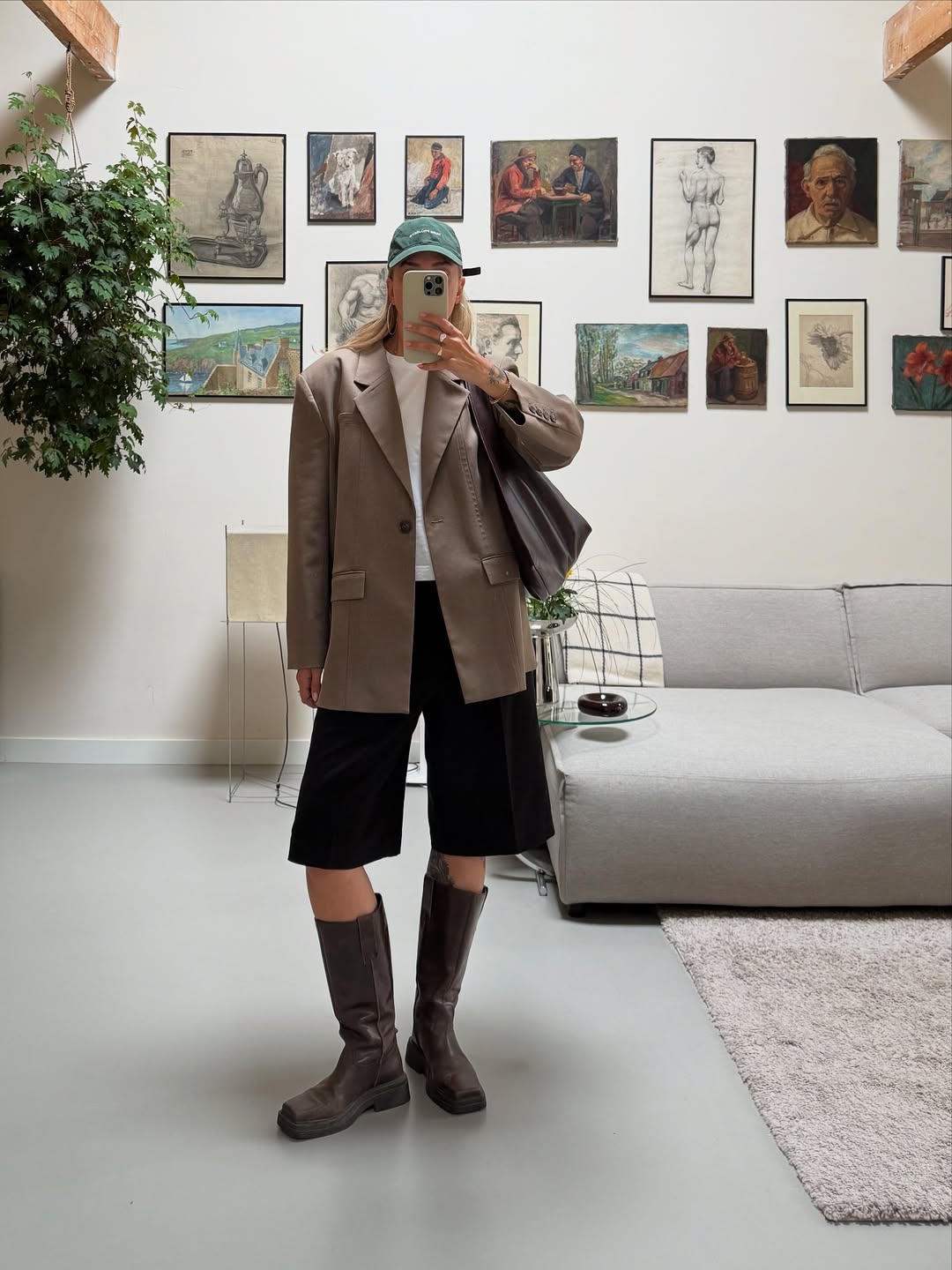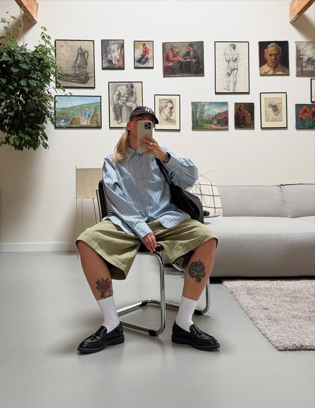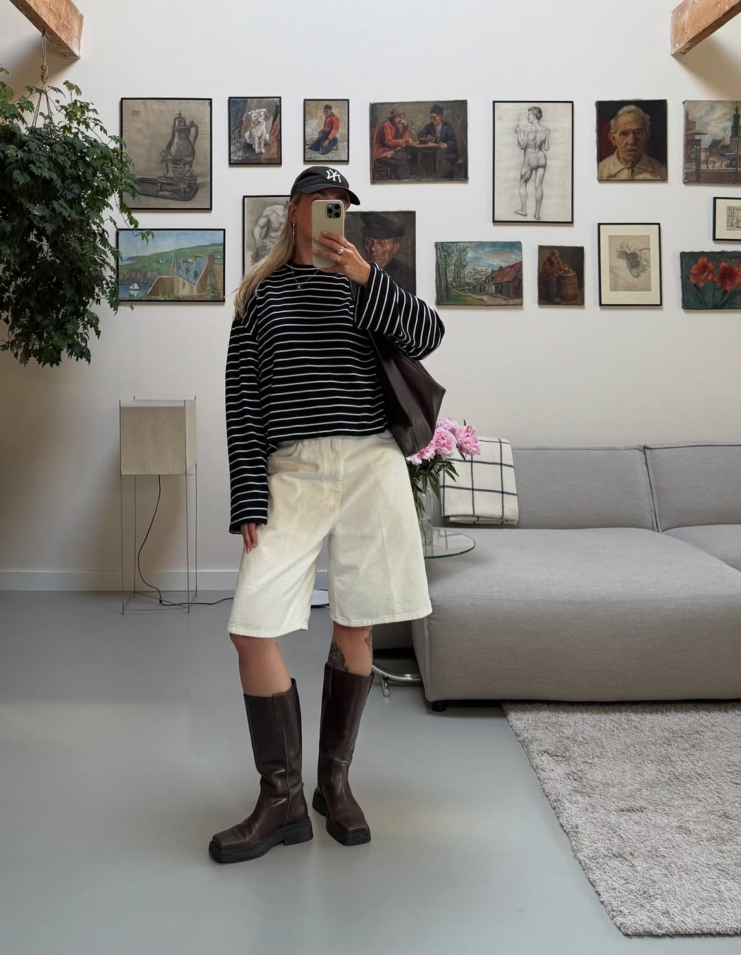 她的穿搭簡約耐看,不太會疊穿或選擇過於流行性的單品,像是寬鬆的條紋上衣搭配百慕達短褲,下身來一雙長靴就很好看,想更隨性一點,戴上鴨舌帽,來顆大尺寸的單肩包就可以帥帥出門去。