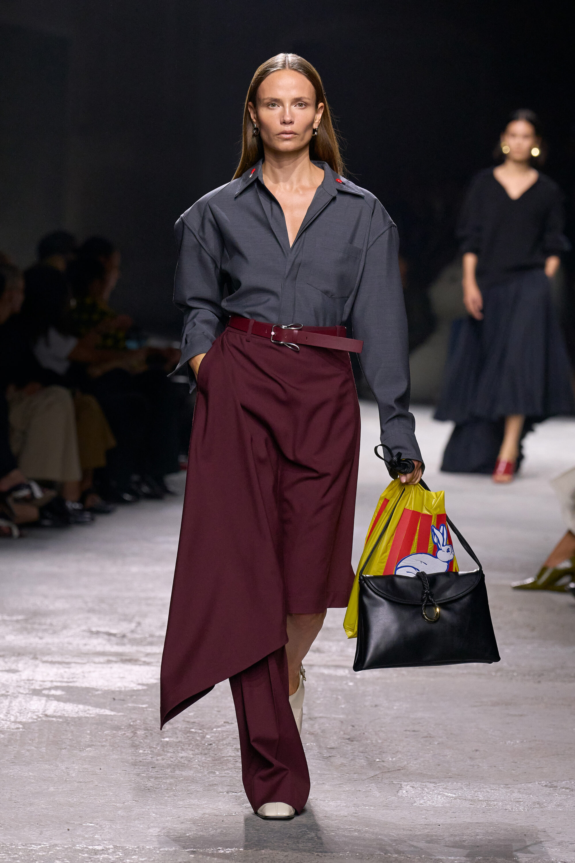 還有 Bottega Veneta 2025 春夏秀場,我們見到了更隨性寬鬆的 Geek Chic,模特兒穿上過於寬大的服飾,彷彿小孩偷穿大人衣服的姿態。打破了既定框架下的成人形象與精緻感,知性的正裝因此增添了隨性與玩樂的自由氣息。