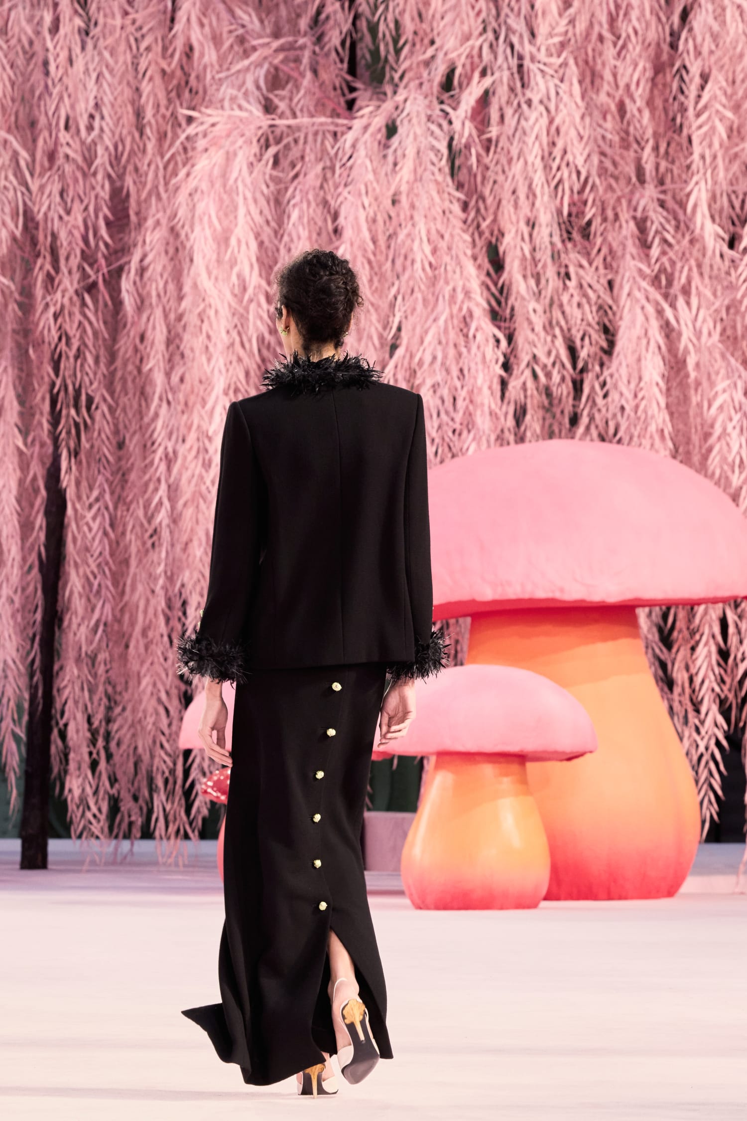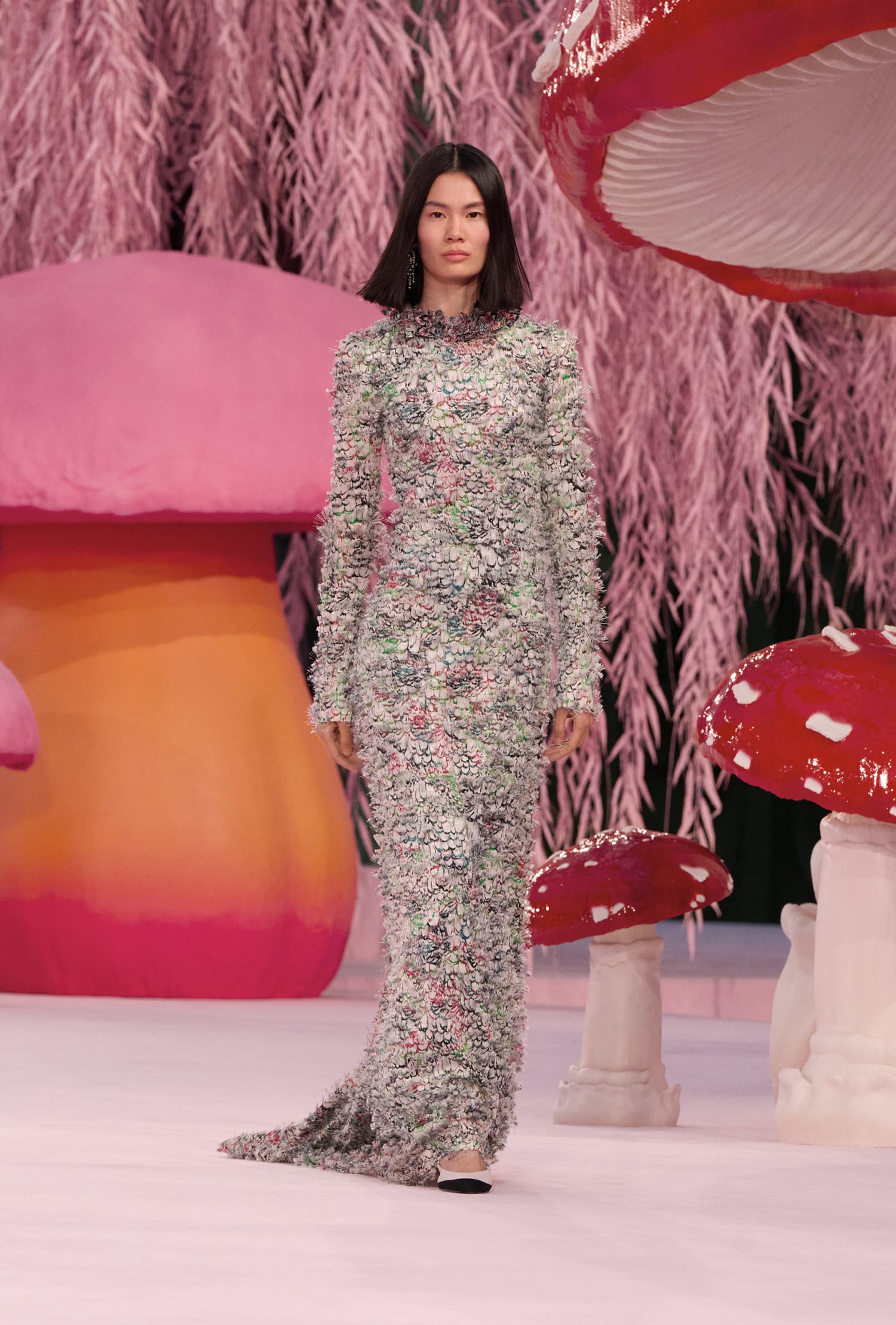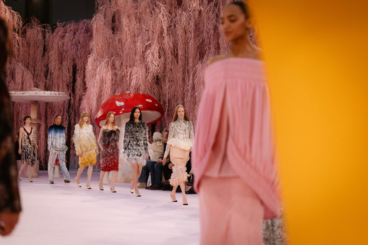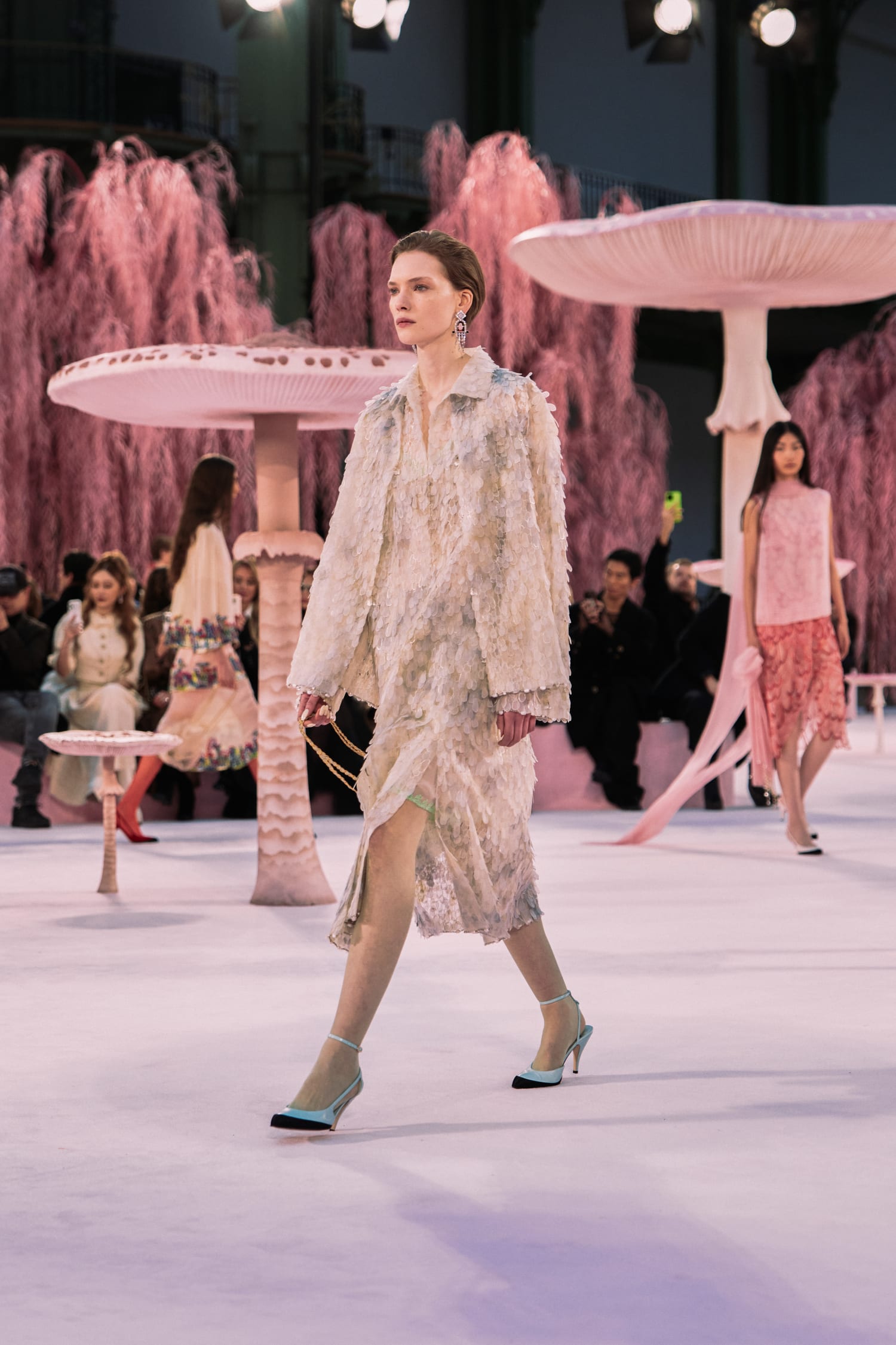 那些秀前預告動畫裡的鳥兒,在飛過 Gabrielle Chanel 寓所鏡梯、飛過品牌工坊後,最後飛抵巴黎大皇宮,棲息在一片粉紅垂柳和蘑菇組成的森林裡。