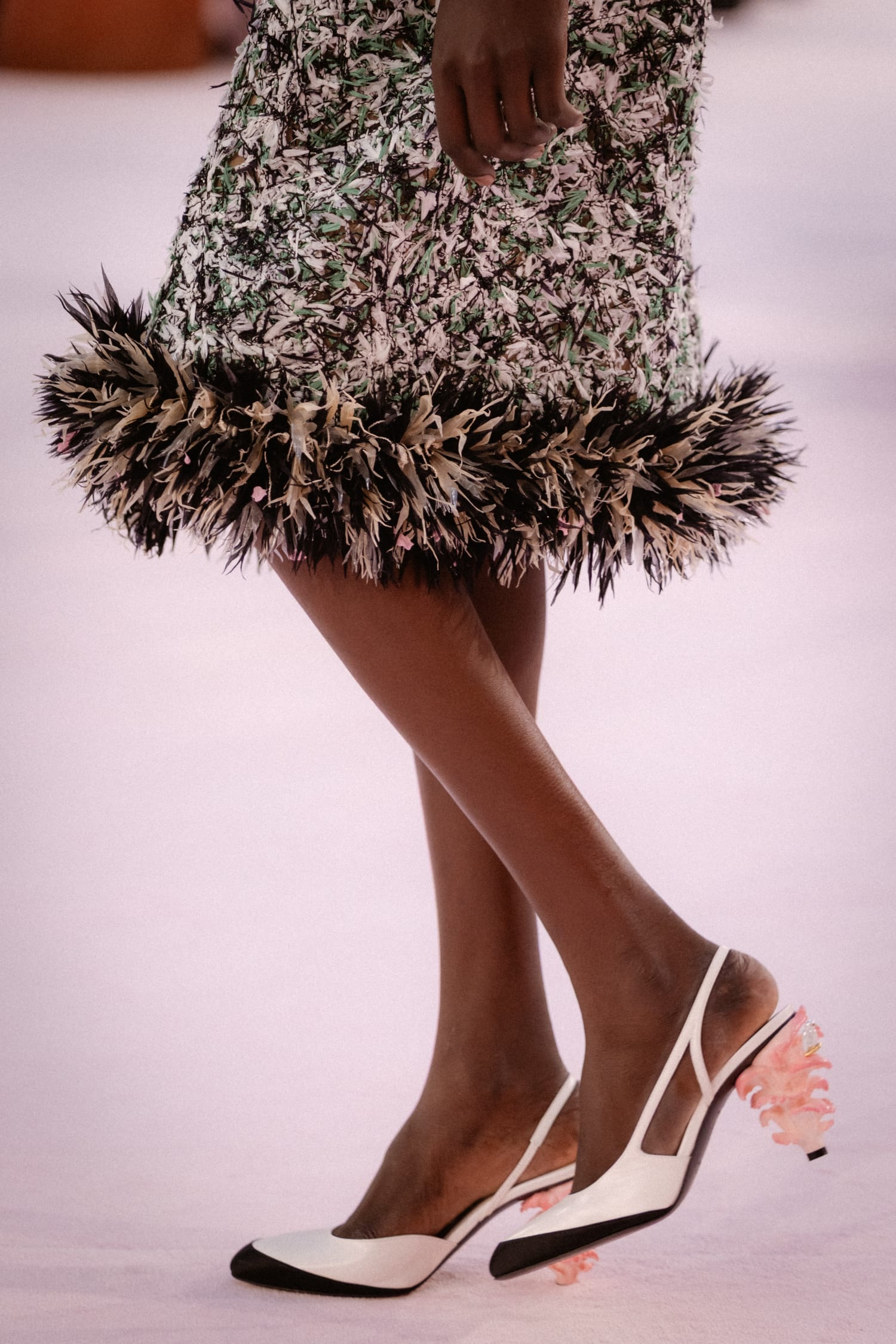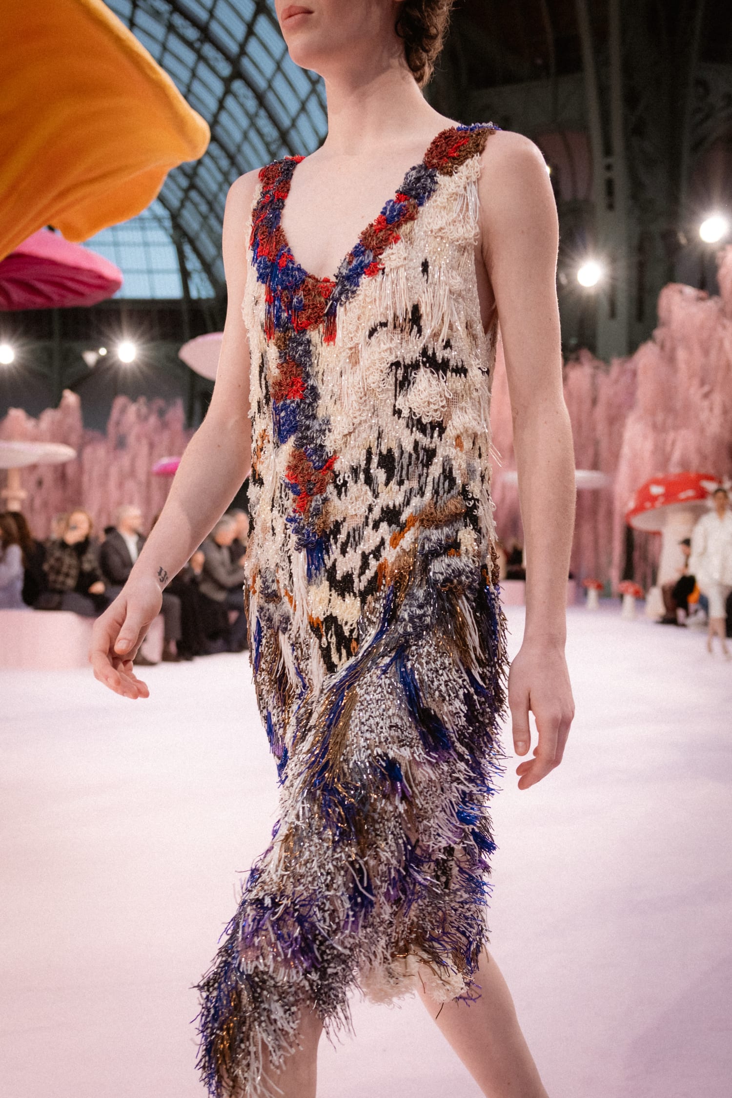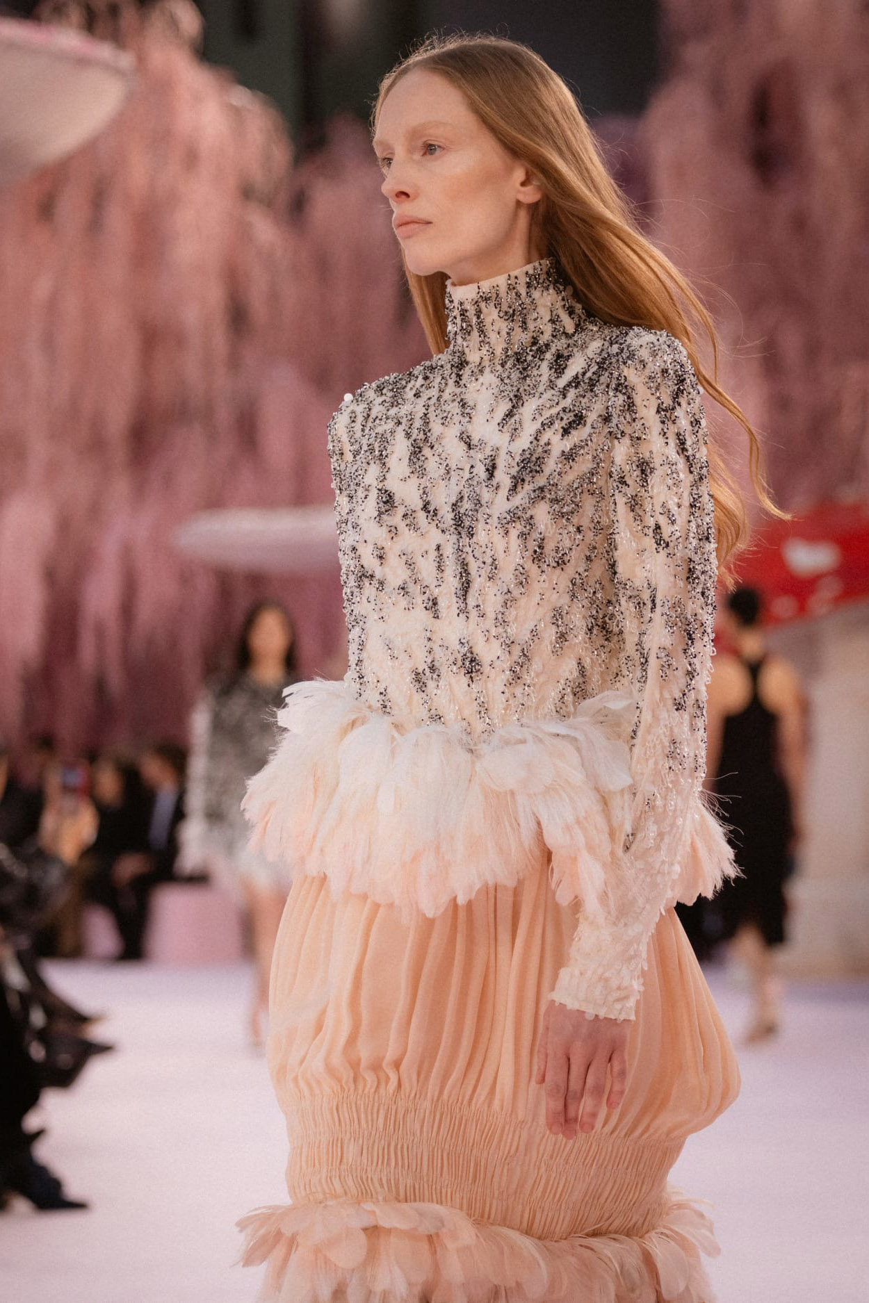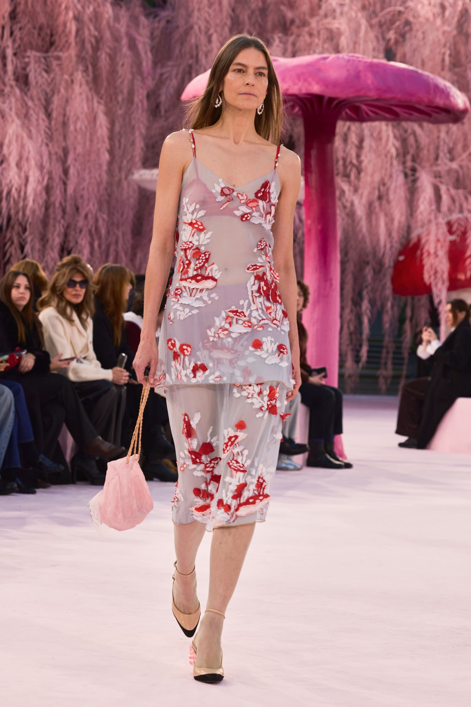 那些秀前預告動畫裡的鳥兒,在飛過 Gabrielle Chanel 寓所鏡梯、飛過品牌工坊後,最後飛抵巴黎大皇宮,棲息在一片粉紅垂柳和蘑菇組成的森林裡。