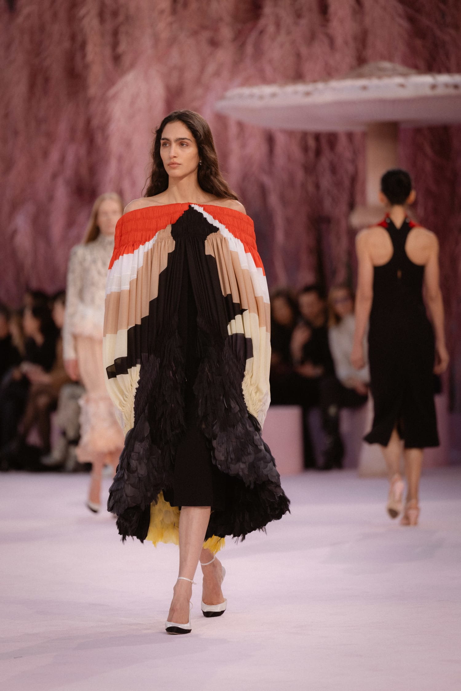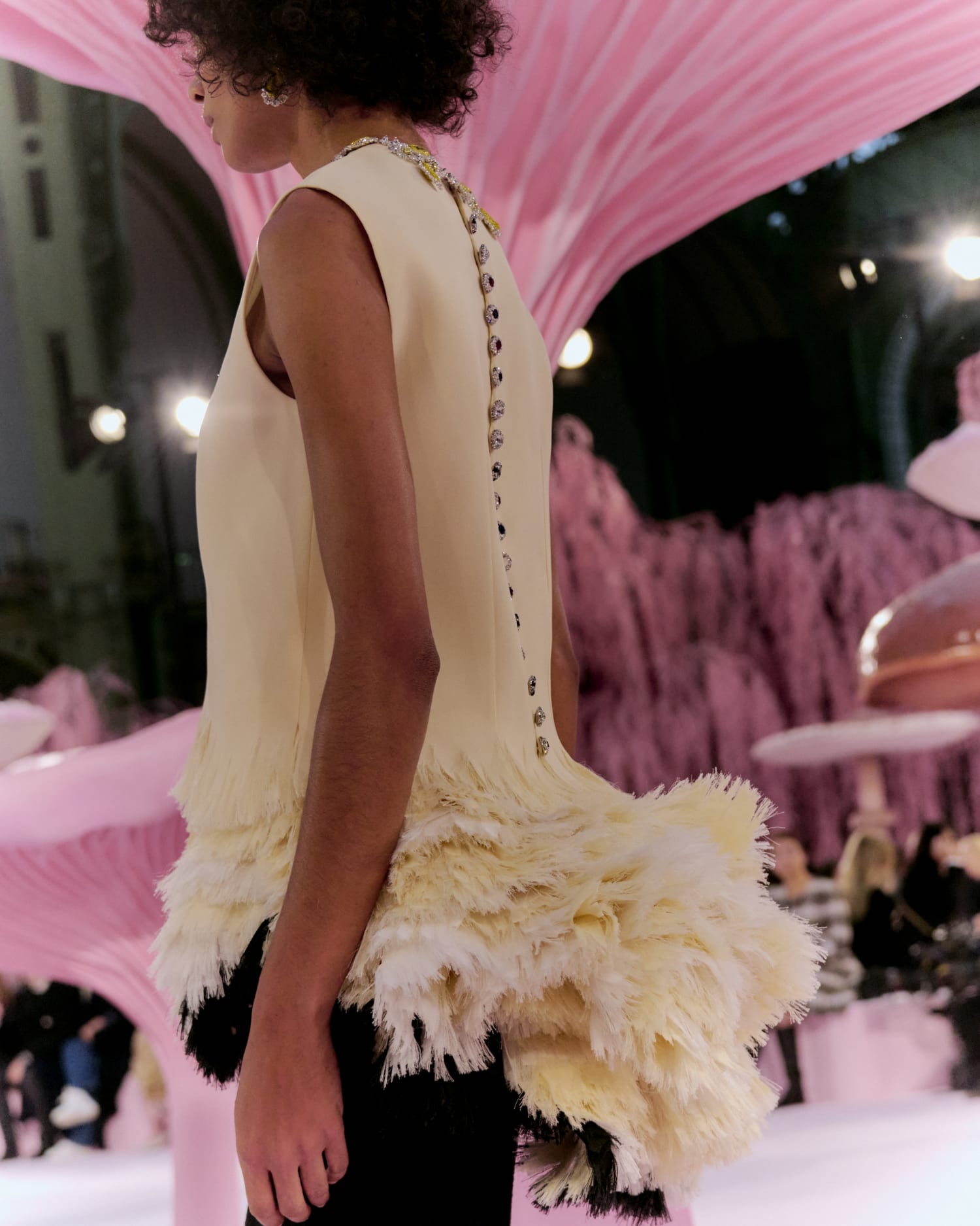 羽毛的元素以豐富多元的方式融入設計中。一件黃色薄紗洋裝,由細小的黑色珠飾模擬出羽毛樣貌;五顏六色的紗,經由扭轉和抓皺呈現出羽翼的立體層次;還有遍佈裙身的流蘇,形塑出孔雀羽毛般的效果;最後壓軸出場的新娘禮服,佈滿閃耀的珍珠母貝薄片,猶如羽毛層層疊疊…,Matthieu Blazy 對布料與複雜工藝的精準掌握,使想像化作可被穿著的詩意。