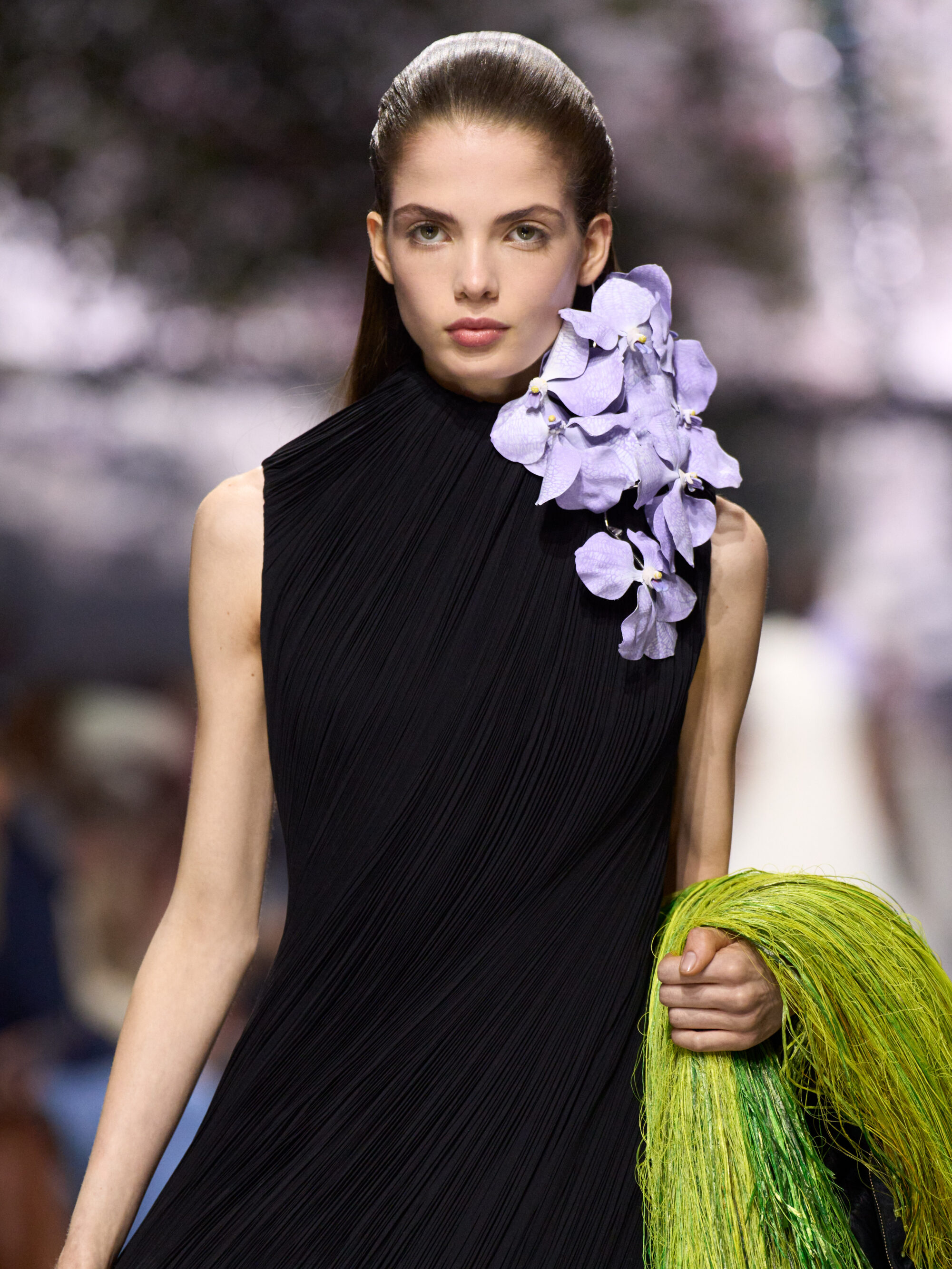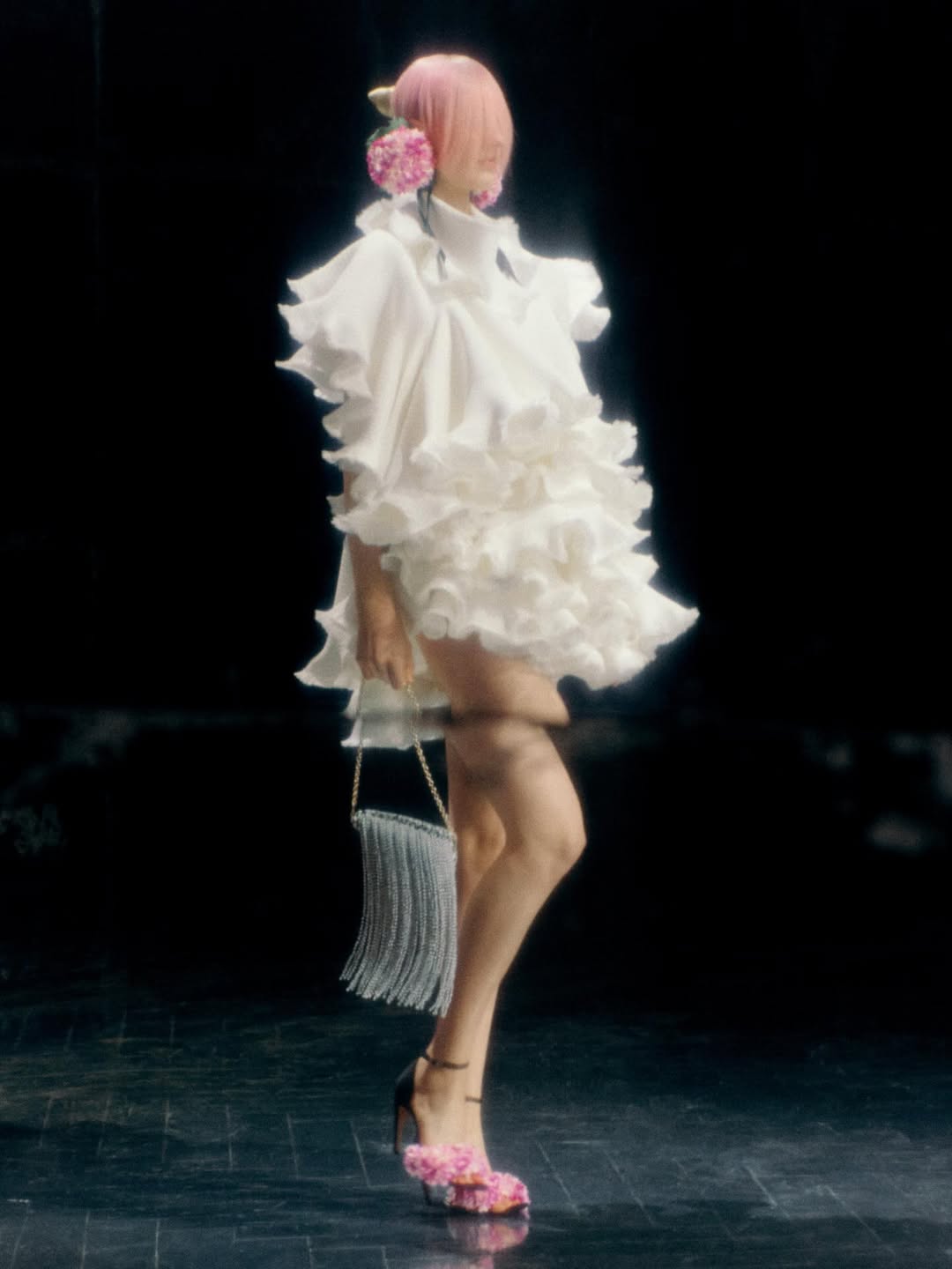 Dior 豐富的檔案庫成為了 Jonathan Anderson 重要的設計語言。除了花卉,我們還能看見設計簡約的黑色 Bar Jacket,帶有 Raf Simons 式的克制與鋒利;幾套斜裁的美麗禮服,則讓人聯想 John Galliano 時期的華麗奢華;當然,還有創辦人 Christian Dior 的經典廓形,包含 Junon 裙的層疊裙擺 、Cyclone 的褶皺設計等,以及 1949 年那件 Miss Dior Dress,也被轉化成一套綴滿粉色仙客來花瓣的裙子。