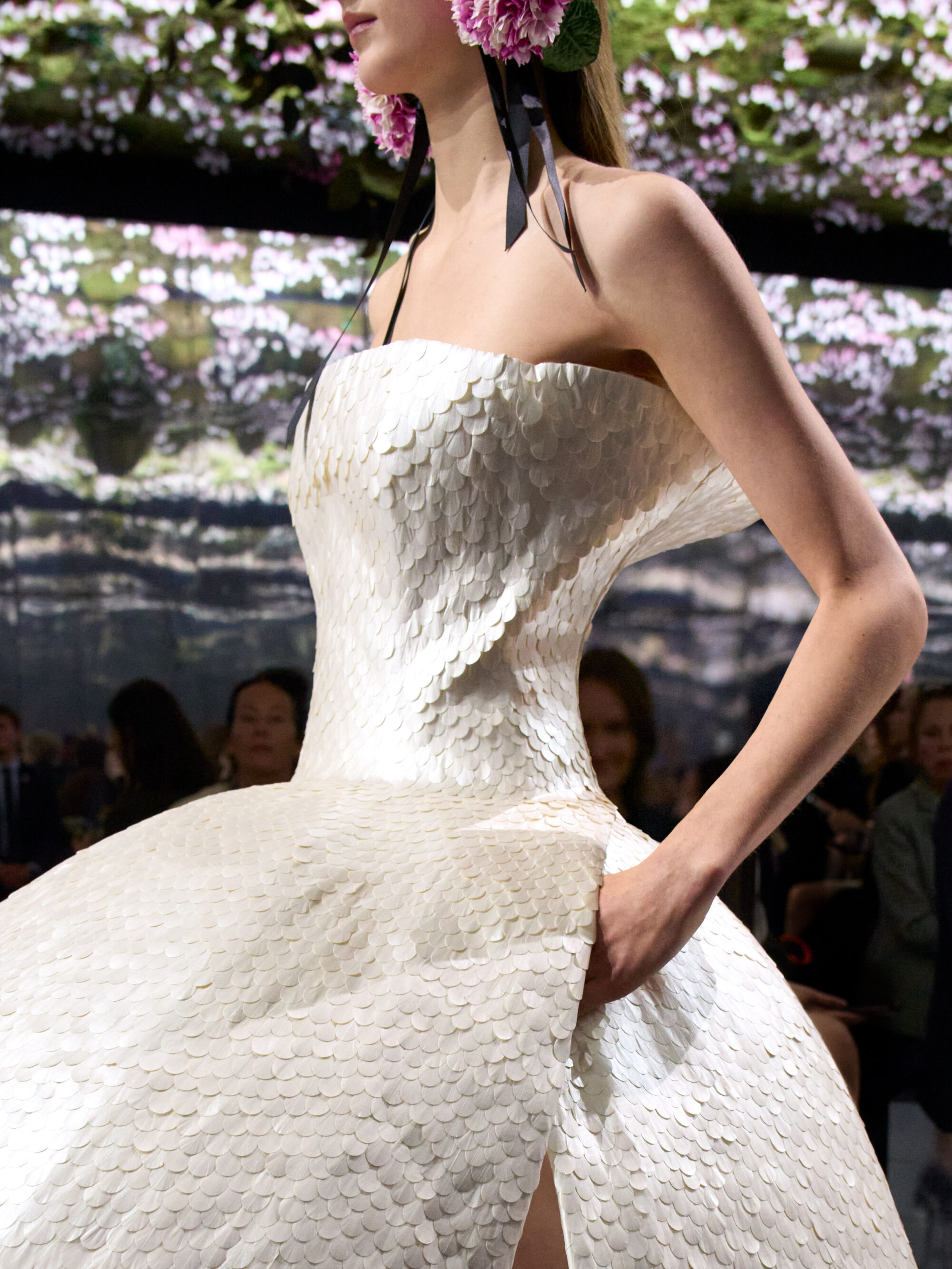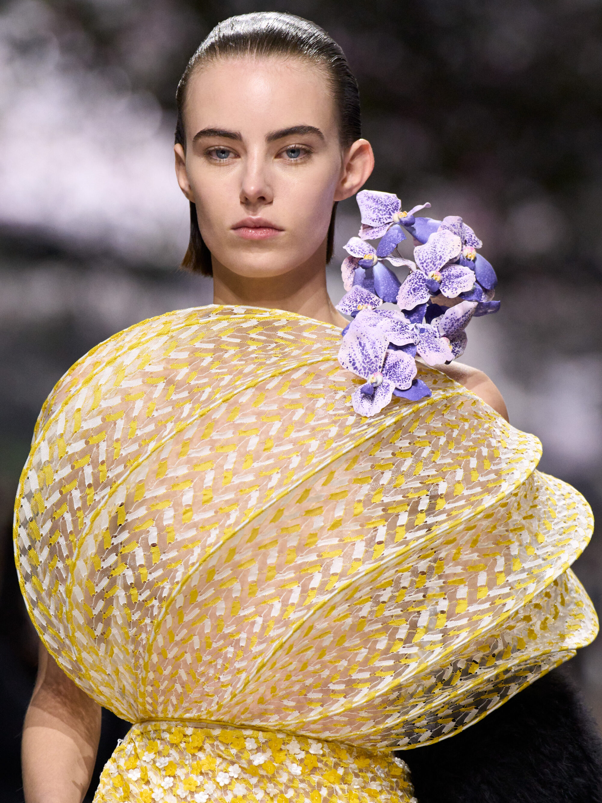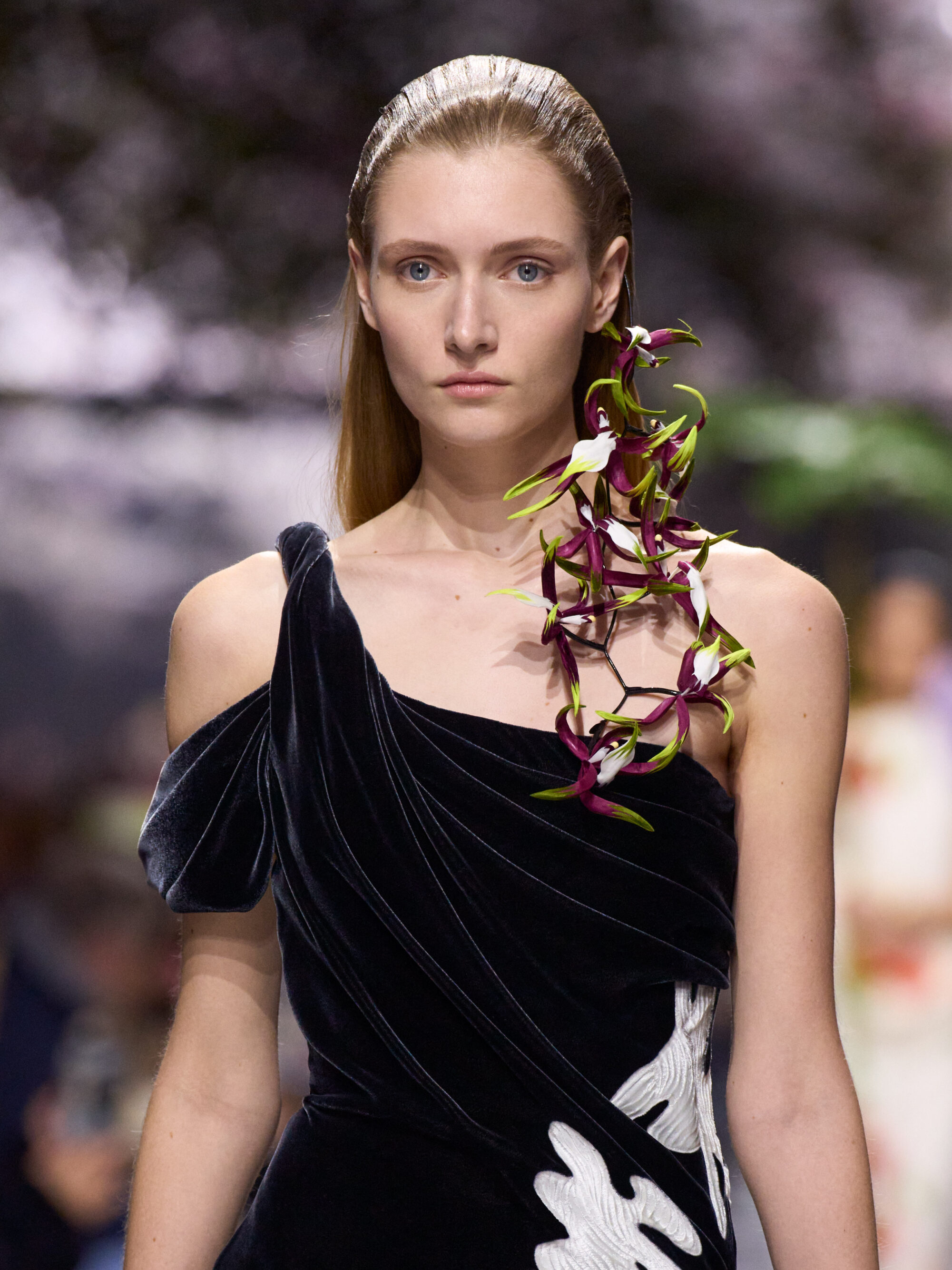 同樣在羅丹美術館,同樣讓模特兒從花中走來,我想起了 Dior 2010 秋冬高級訂製服系列,John Galliano 用一整個系列來訴說對花卉的狂熱,他從攝影師 Nick Knight 和 Irving Penn 的花卉靜物攝影,以及溫室植物獲取靈感,結合 Christian Dior 在 1950 年代創造,強調胸部與腰部線條、外形似鬱金香花苞的 Tulip-Line(鬱金香廓型),讓服裝如倒置的花朵般盛開,從色彩、葉片、羽毛、褶皺、荷葉邊等裝飾,到用包裹花藝的透明彩膜當作頭飾,每個細節都完美呈現花朵的曼妙姿態。