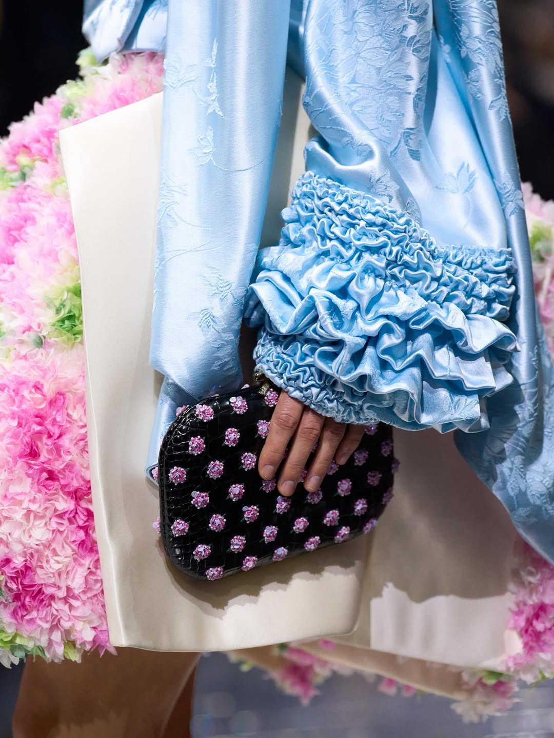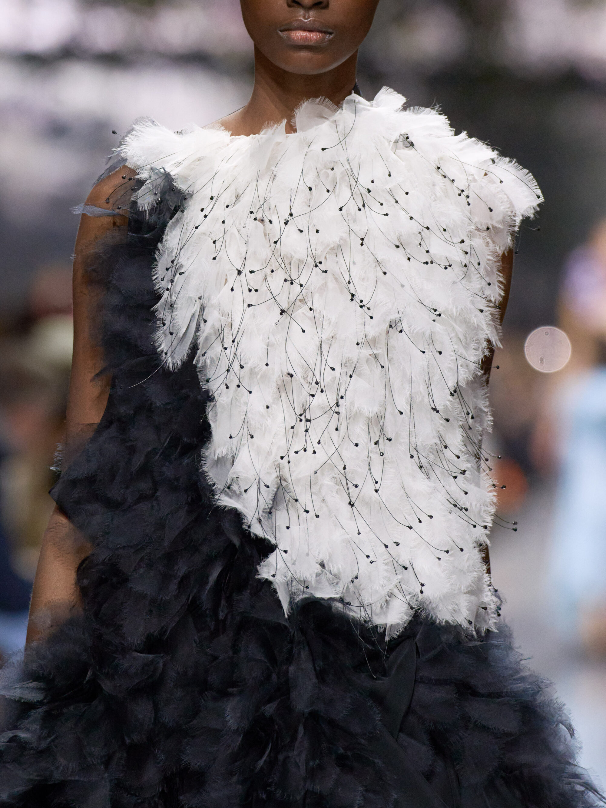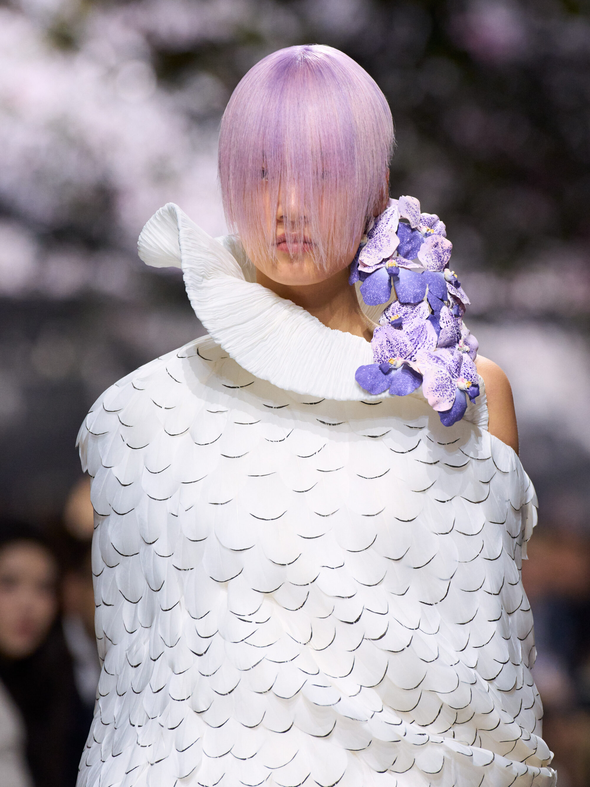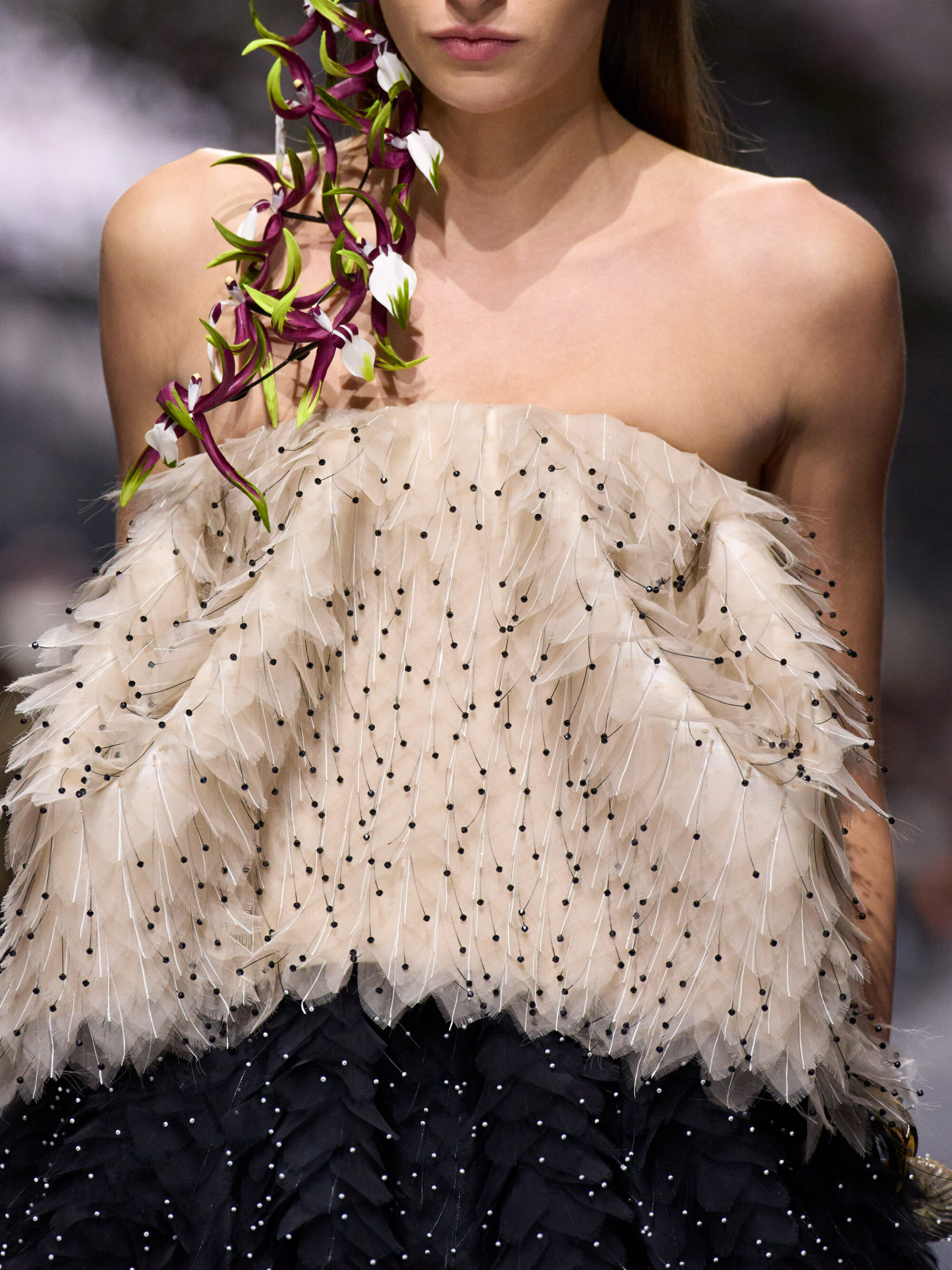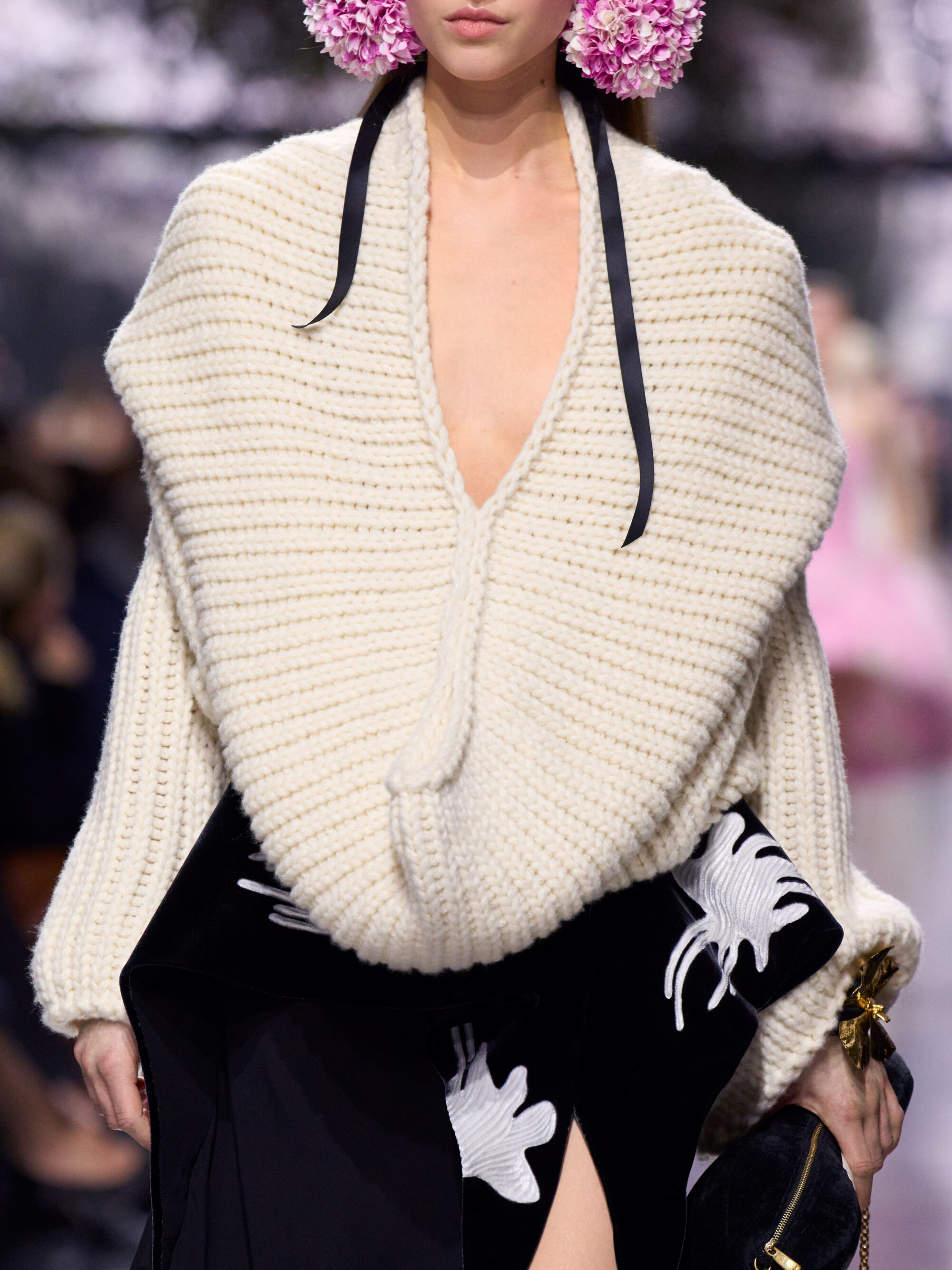 Dior 訂製工匠的匠心技藝,被實踐在以輕盈絲料剪裁而成,或以精密刺繡微型化呈現的寫實花卉上,還有層疊如羽毛的碎雪紗與歐根紗、覆以網紗的氣球裙,以及首次在 Dior 訂製服亮相的手工塑型包款,和奇趣的瓢蟲包款;甚至,Jonathan Anderson 還將針織布料帶至高級訂製服的舞台,透過不同製作方式促進他的實驗。