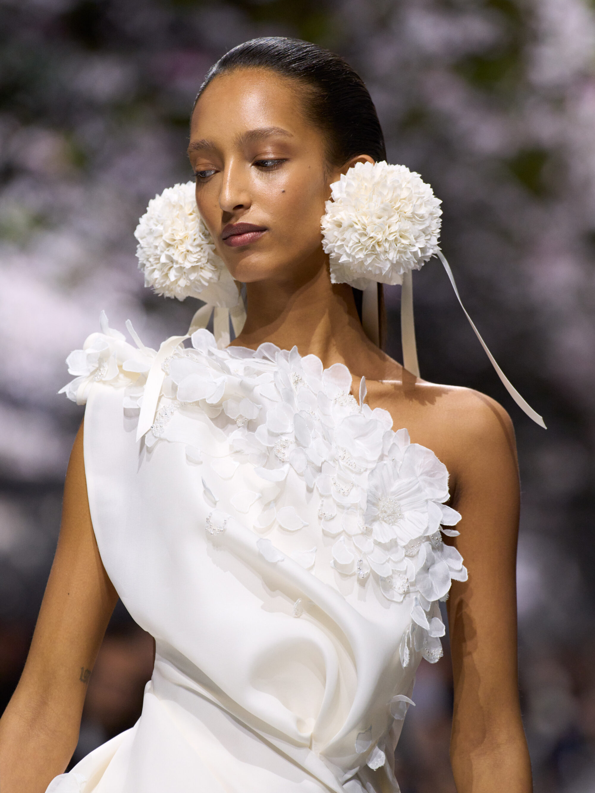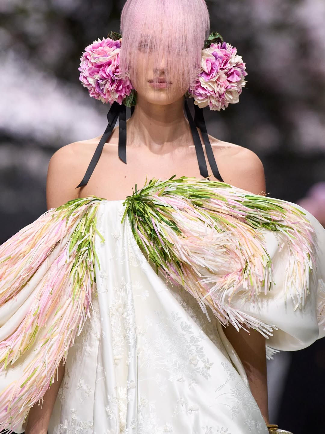 於是,那束 John Galliano 在 Jonathan Anderson 發布 Dior 首秀前贈予,綁著黑色緞帶的仙客來花束,成為了他創作高級訂製服的起點,從邀請函到秀場裝置,再到模特兒耳畔搖曳的大型耳飾,以及服裝上的廓形及細節裝飾,花卉貫穿了整個 Dior 2026 春夏高級訂製服系列,在 Jonathan Anderson 手中以千姿百態盛開於伸展台上。
