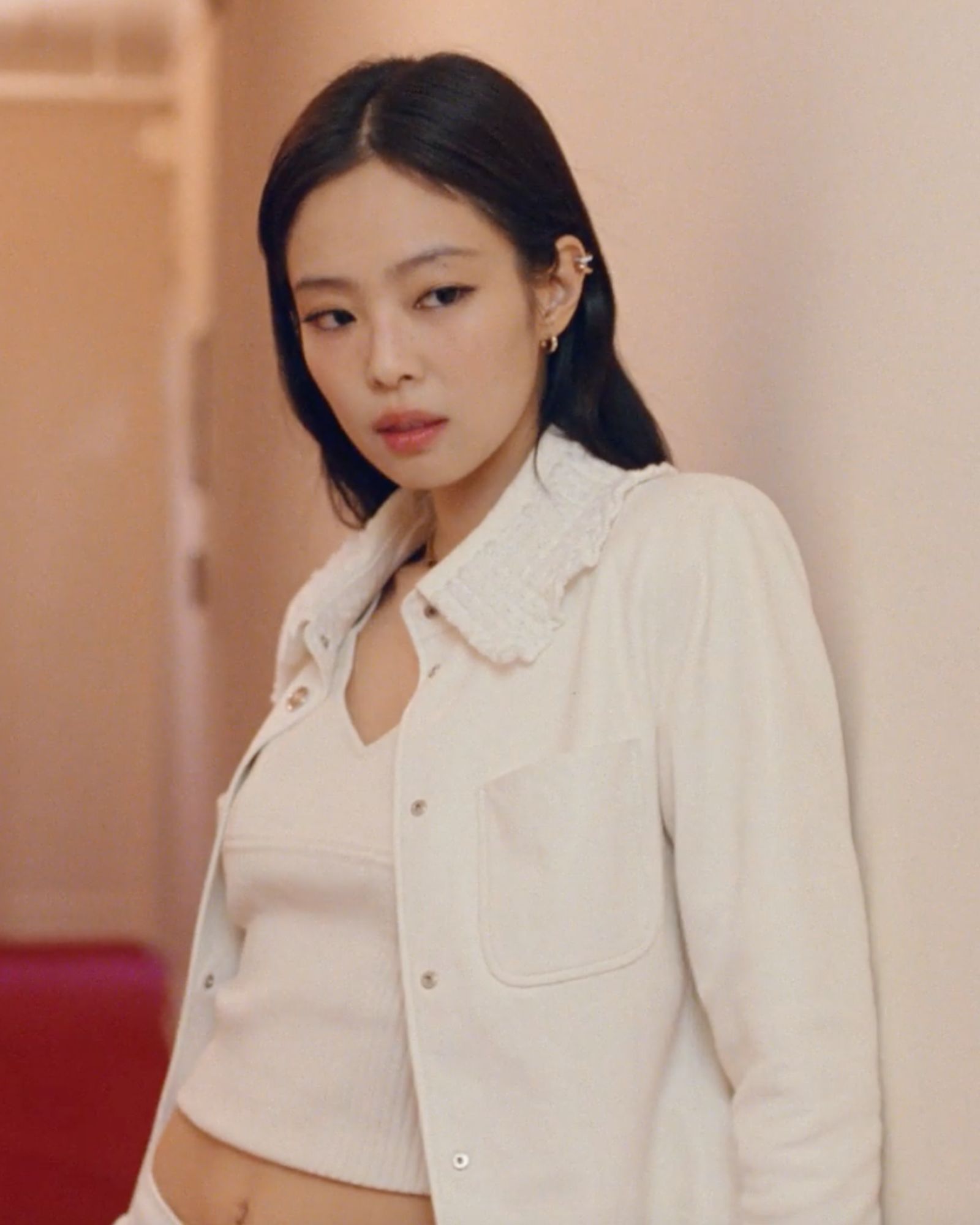 廣告中 Jennie 穿起帥氣的白色褲裝,搭配 Coco Crush 戒指、耳環,以及完美貼合於頸項的柔軟短項鍊,這款短項鍊也在前幾日 Jennie 的私服造型中出現,可見 Jennie 有多喜愛它。