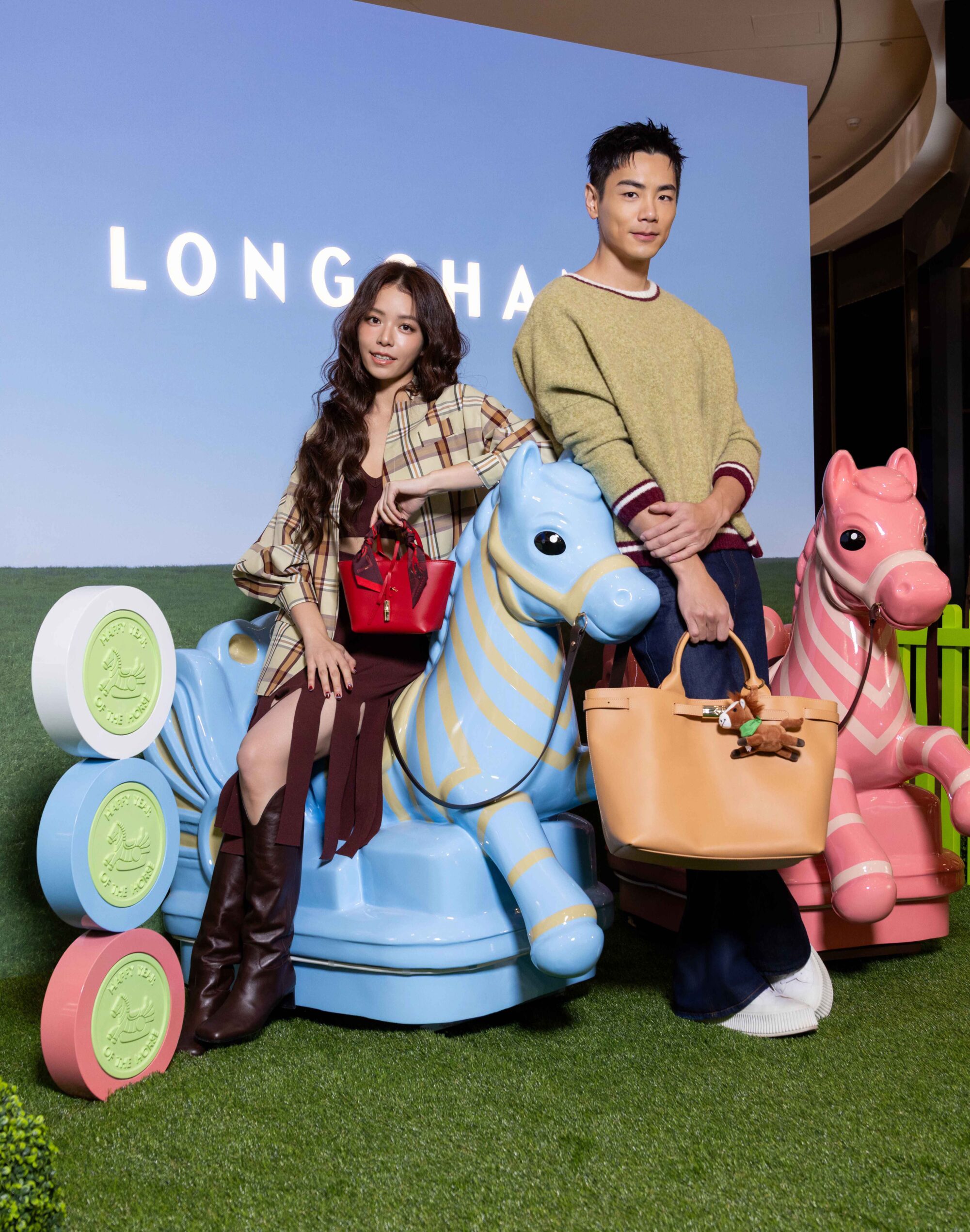 不只推出馬年限定系列,Longchamp 也同步帶來新春限定活動和快閃裝置,同樣以奔馬意象為靈感,將台北 101 精品店打造成一座搖搖馬樂園,並在活動揭幕當天邀來宋芸樺與禾浩辰出席,一同踏入繽紛奔馳的幻想世界。