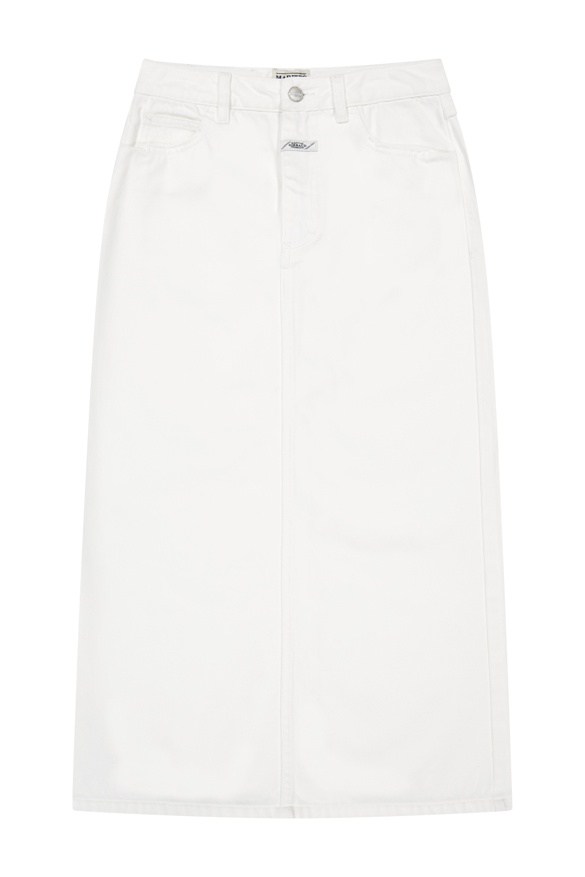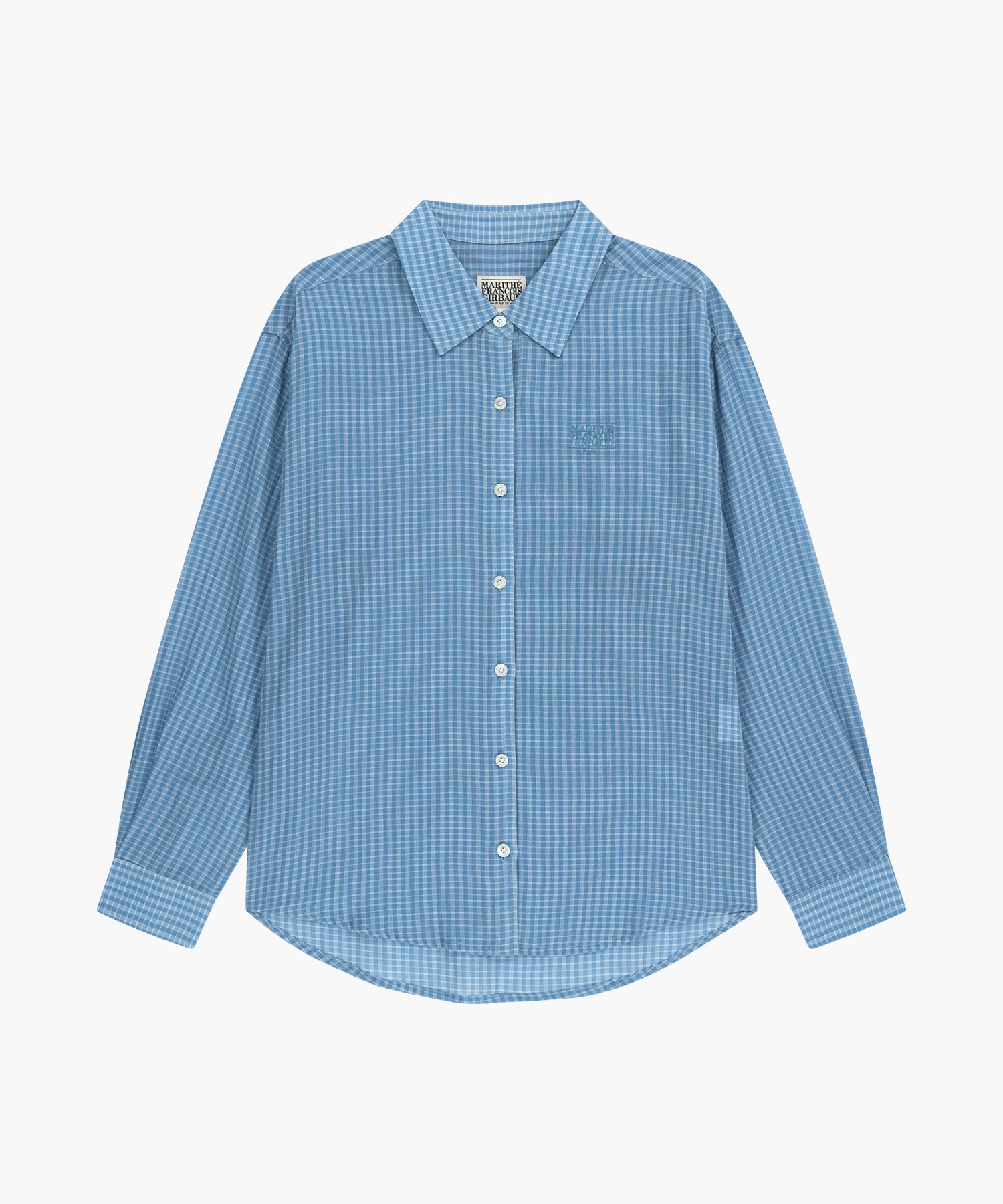 女款格紋透膚襯衫 NT$3,590;經典LOGO丹寧長裙 (白) NT$4,090