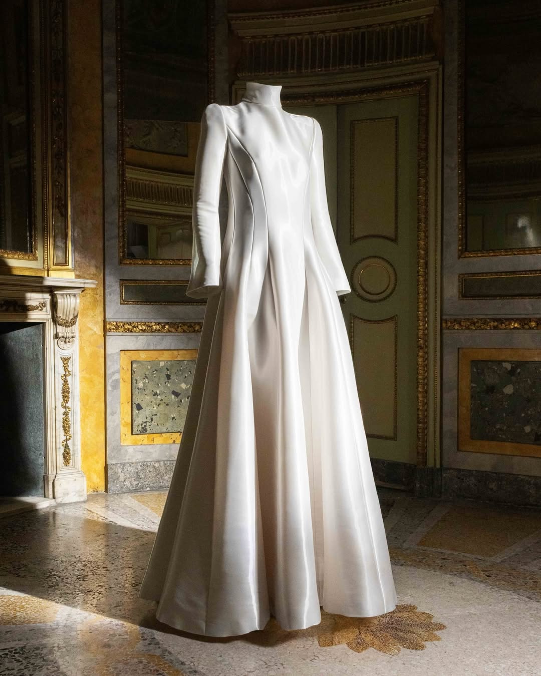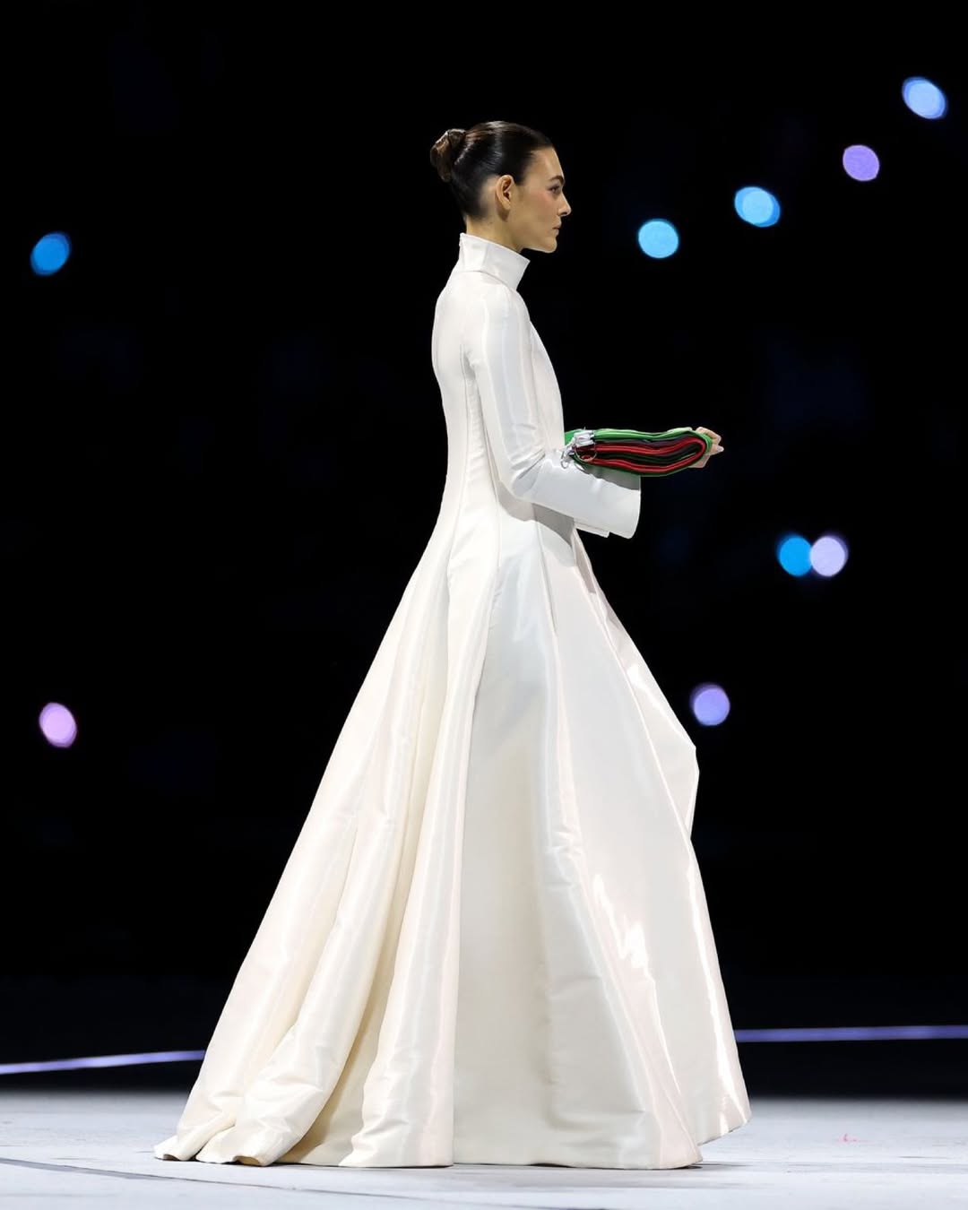 今回 Vittoria Ceretti 擔任傳遞國旗給儀仗隊的角色,她手捧義大利國旗出場,將頭髮梳成高雅的低髮髻,身穿 Armani Privé 訂製禮服,一身純白顏色搭配曳地長裙及高領設計,全身散發聖潔光芒,而她同時也是 Giorgio Armani 2026 春夏系列的最新代言人。