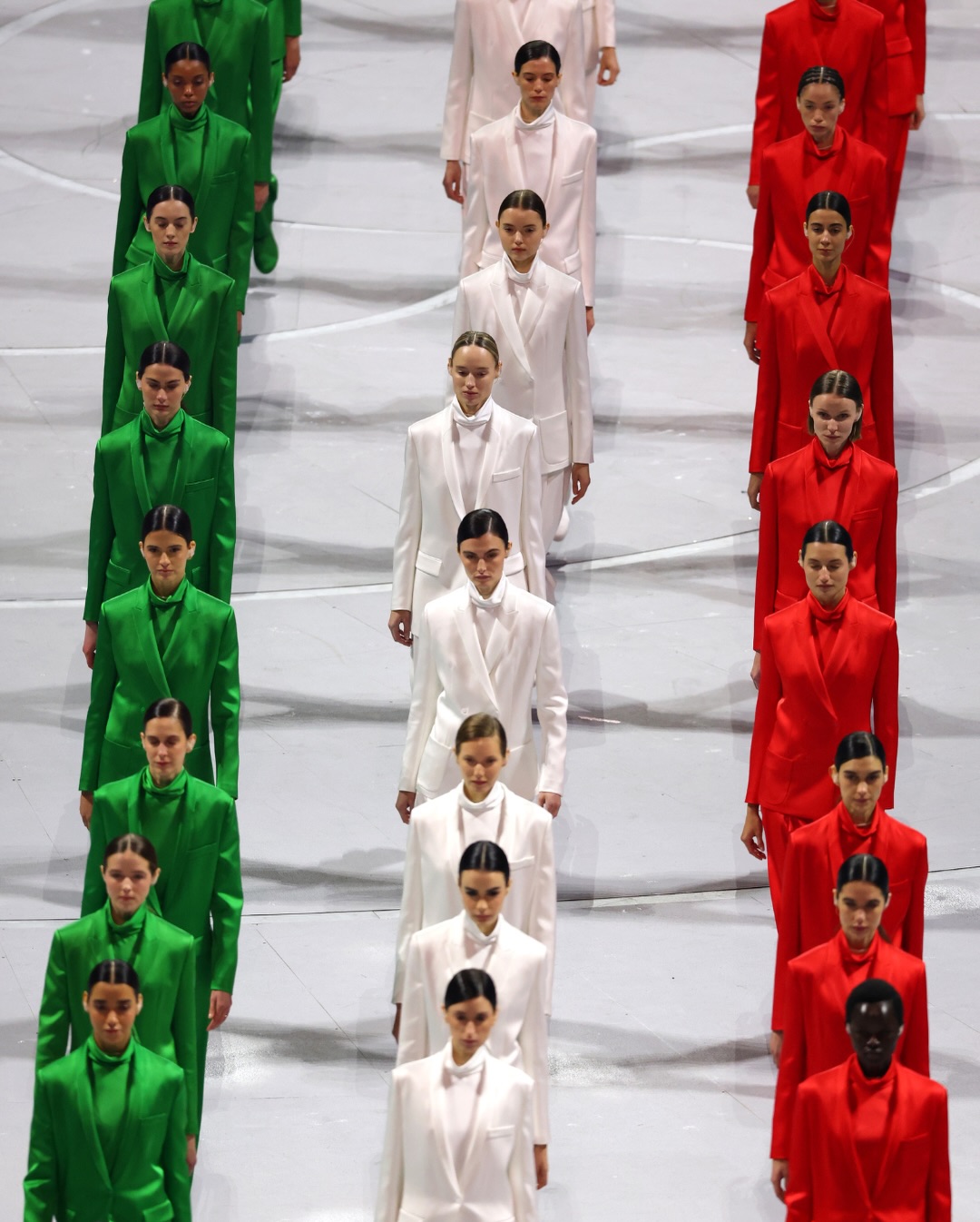 和 Vittoria Ceretti 一同出場的,還有 60 位分別穿著全綠、全白、全紅西裝的模特兒,這三個顏色正代表義大利國旗的用色,並出自 Giorgio Armani 的設計,以作為對去年 9 月逝世的義大利傳奇設計師 Giorgio Armani 的深切敬意。