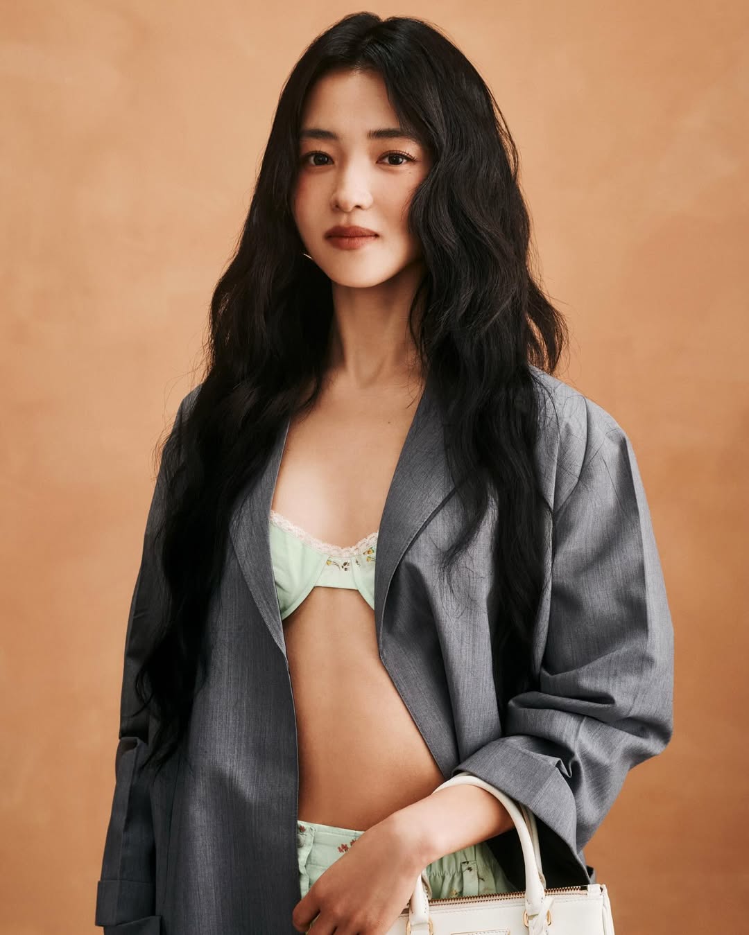 不久前剛上任的品牌大使楊冪首次前往 Prada 看秀,和 Karina 同樣選擇牛仔套裝亮相機場,她以褲裝詮釋出截然不同的風格,手提 Bonnie 丹寧皮革包款,材質與色調相互呼應,整體造型更一致,散發都會女性的從容氣場。