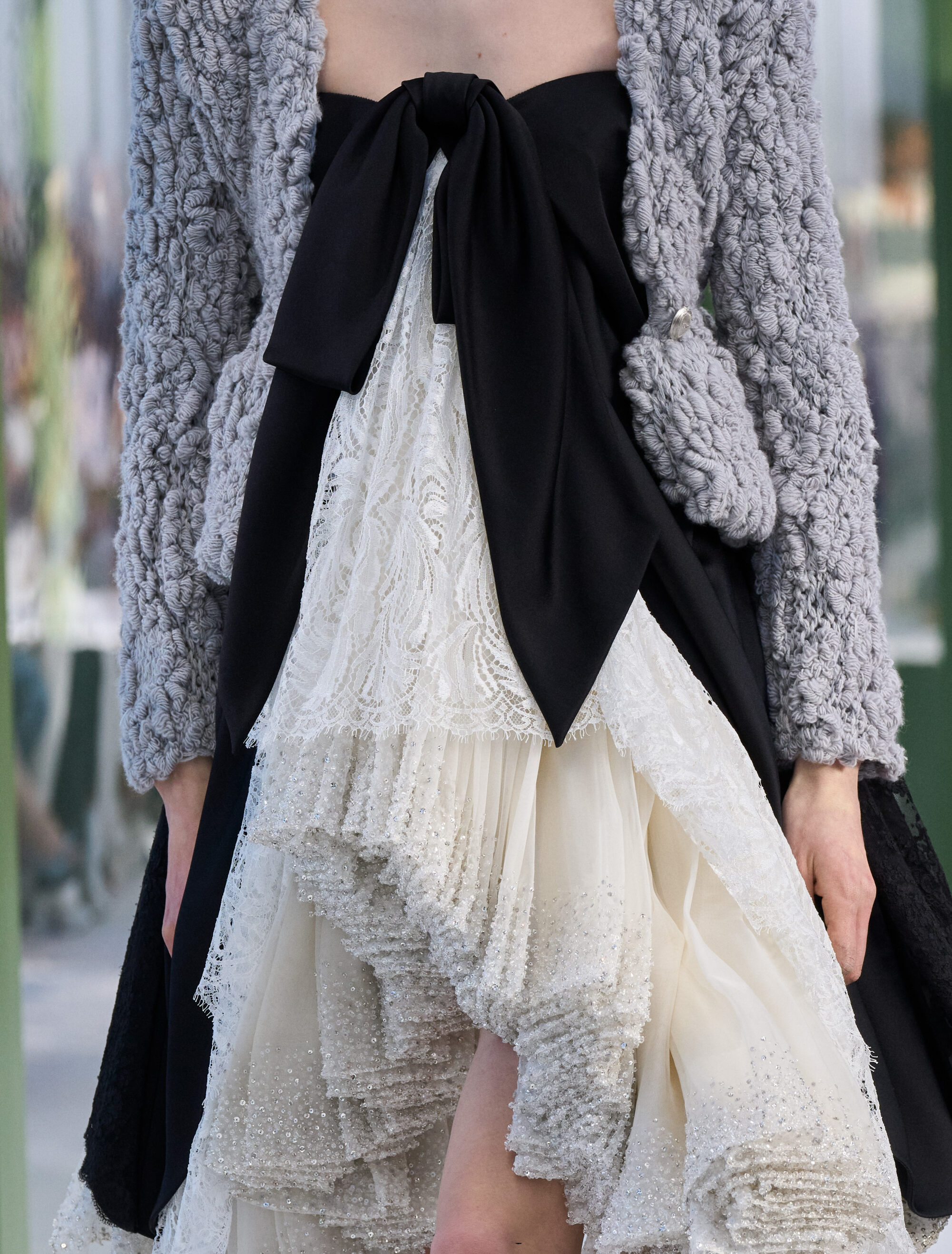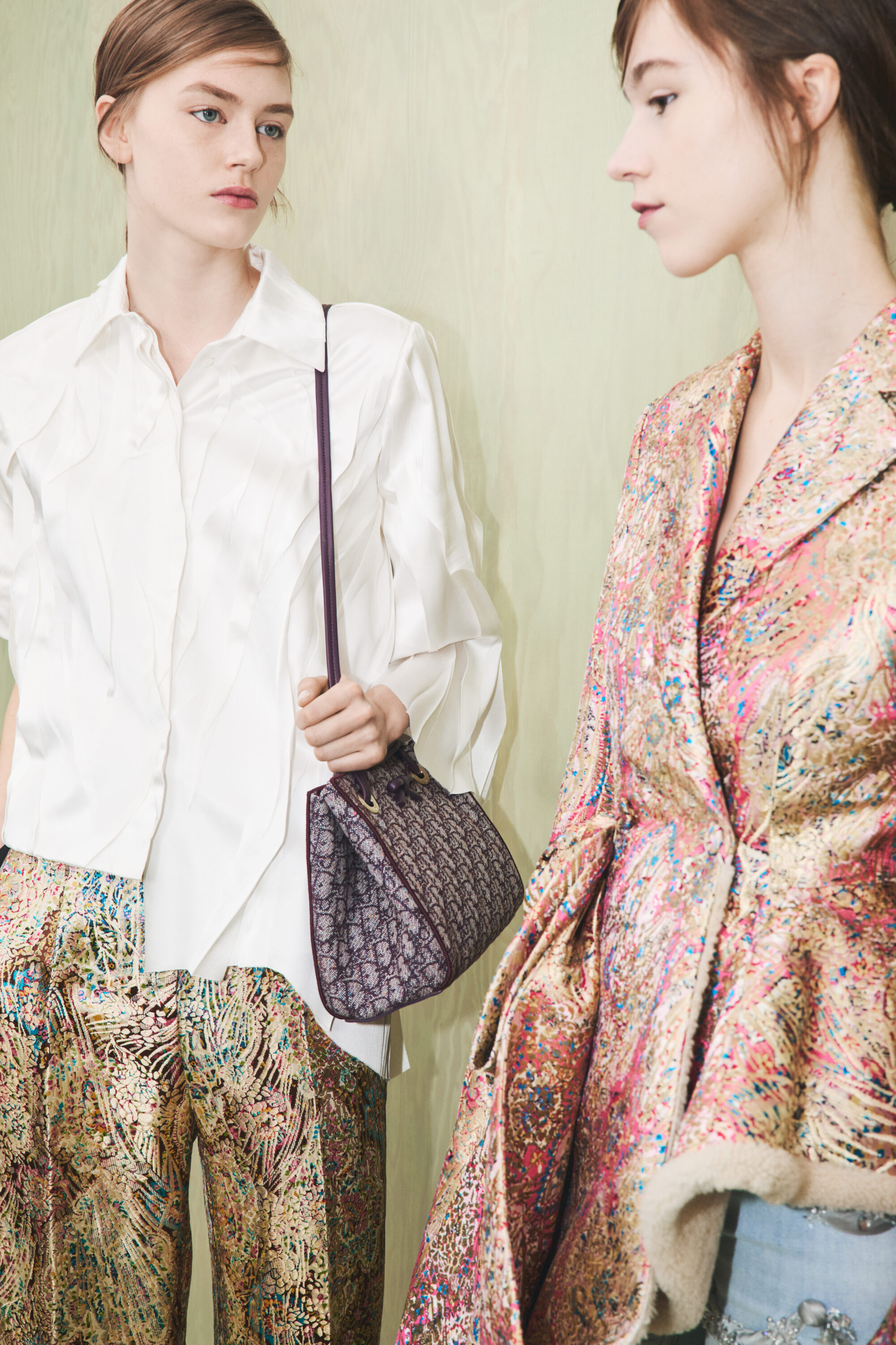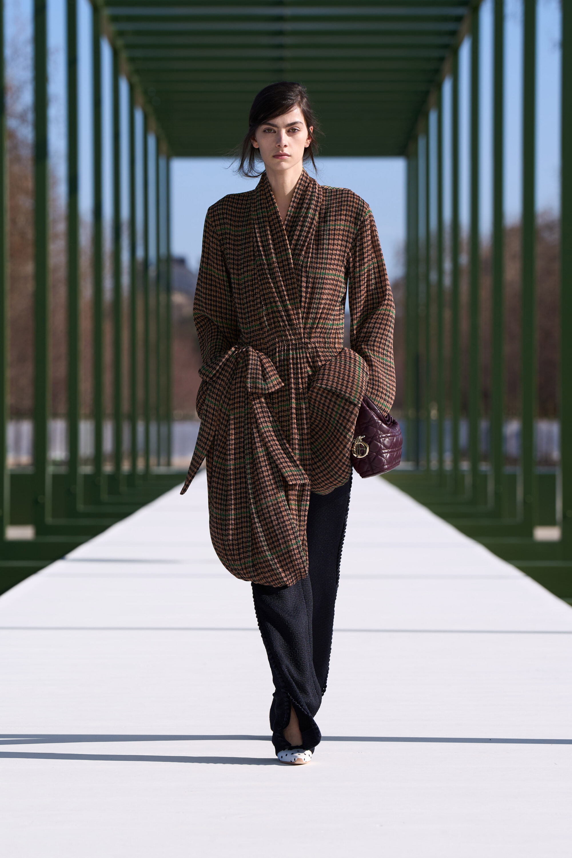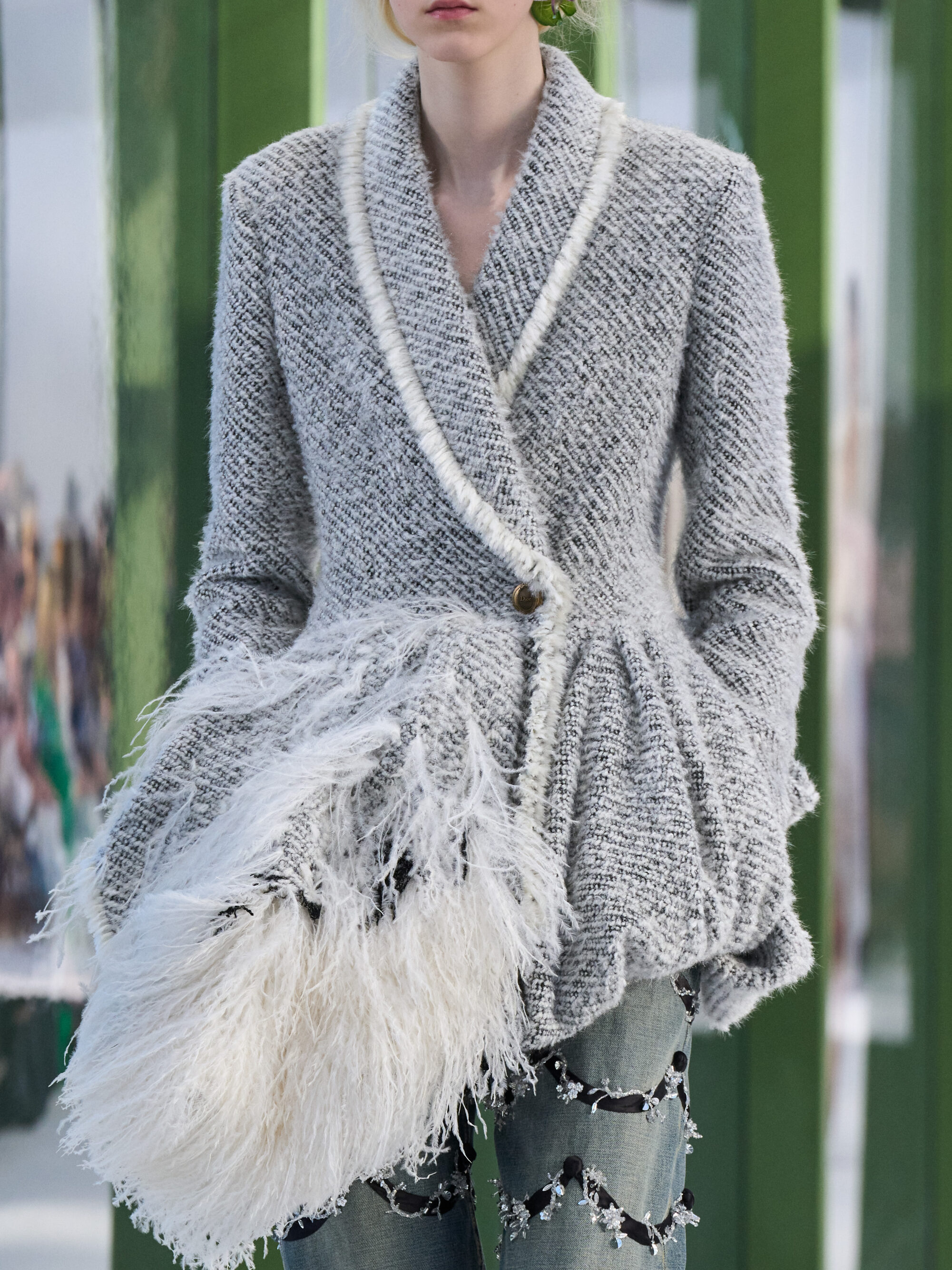 Christian Dior 鍾愛的鈴蘭花在本季成為重點設計語彙,轉化為上衣與裙襬的剪裁輪廓,以及細膩刺繡點綴於洋裝與長裙之間;以及加長裙擺的瑞士圓點荷葉邊長裙,為 Christian Dior 經典的 Junon 禮服注入年輕氣息;還有品牌標誌性的 Bar Jacket 再次被重新演繹,有些加長了輪廓,讓線條更寬鬆,有些則使用 Donegal 粗花呢呈現。