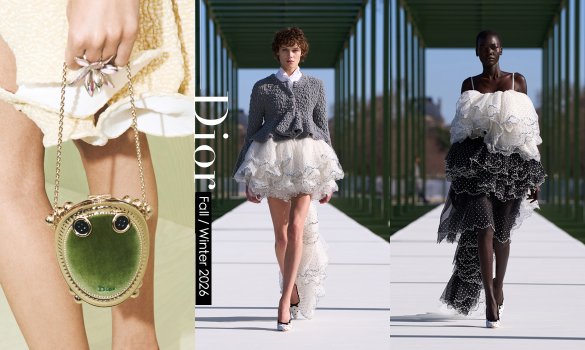 Dior 創意總監 Jonathan Anderson 本季將這歷史概念,融入 Dior 2026 秋冬系列中,在杜樂麗花園內打造「園中園」場景,睡蓮悠然徜徉於八角水池,伸展台則呼應杜樂麗花園寬闊筆直的林蔭大道,以 65 套造型鋪陳出他心中形形色色的巴黎眾生相。