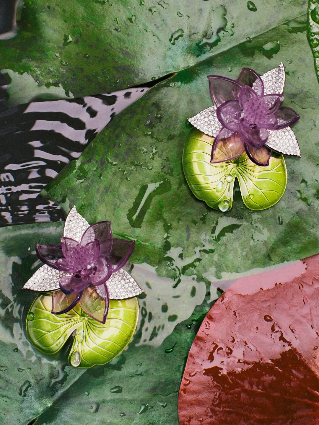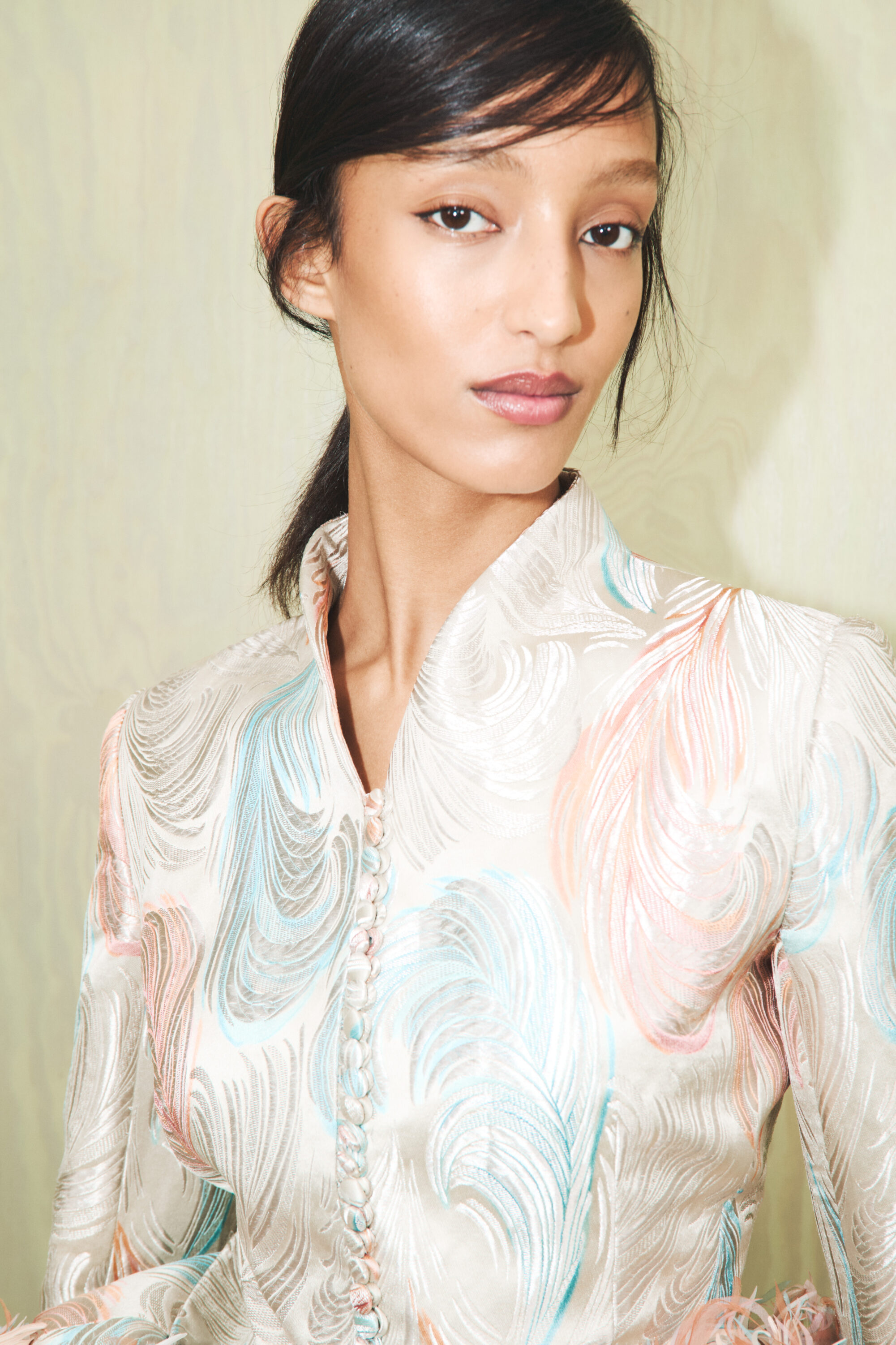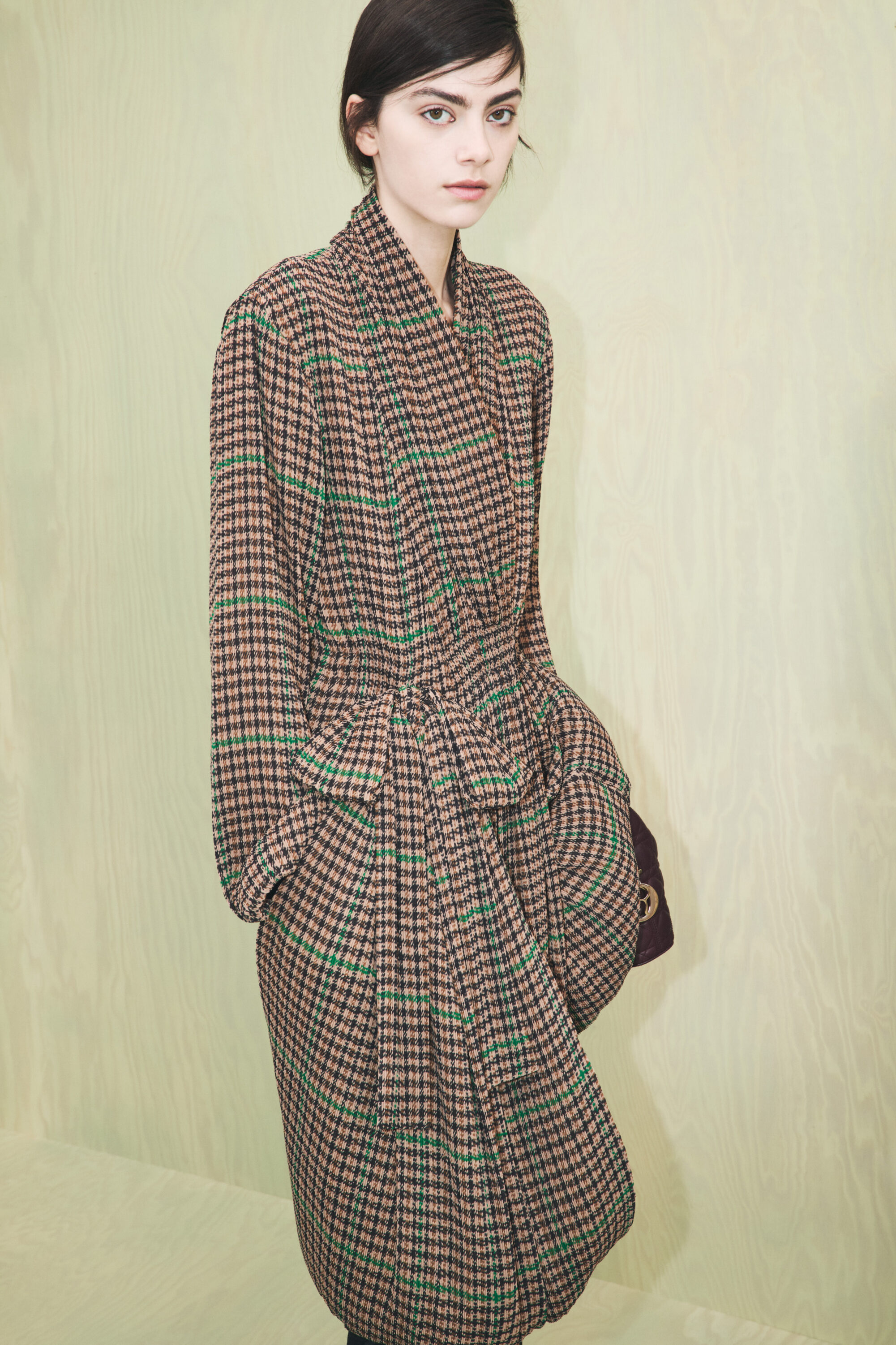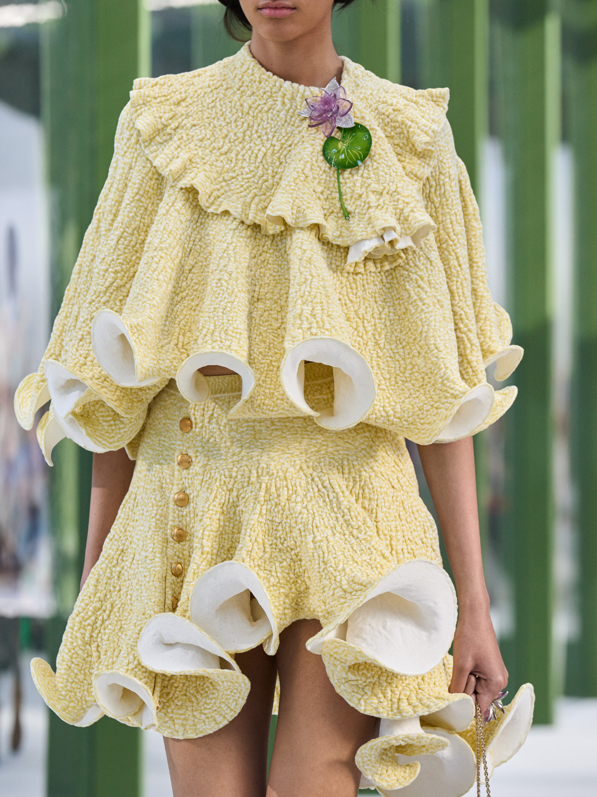 系列裡還是有些浮誇線條,像是綴有蓬鬆荷葉下擺的短版外套、解構燕尾服大衣、緞帶般飄逸的長洋裝;當然也少不了 Jonathan Anderson 拿手的趣味性配件,包含成為秀場焦點的青蛙晚宴包、睡蓮高跟鞋、荷葉耳環等;而曾在高訂系列出現的螺旋籠架洋裝,這次則以輕柔的百褶布料堆疊登場。