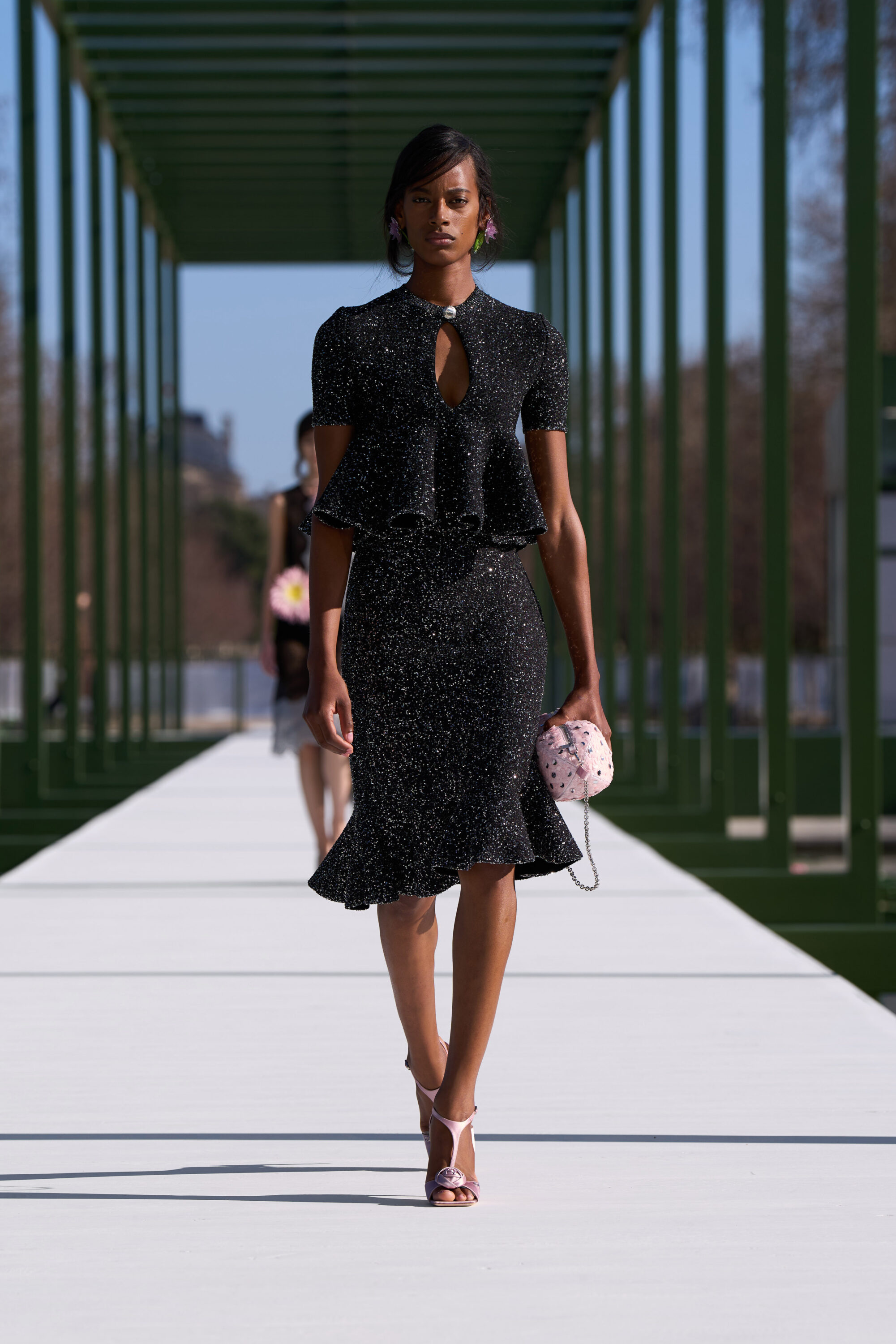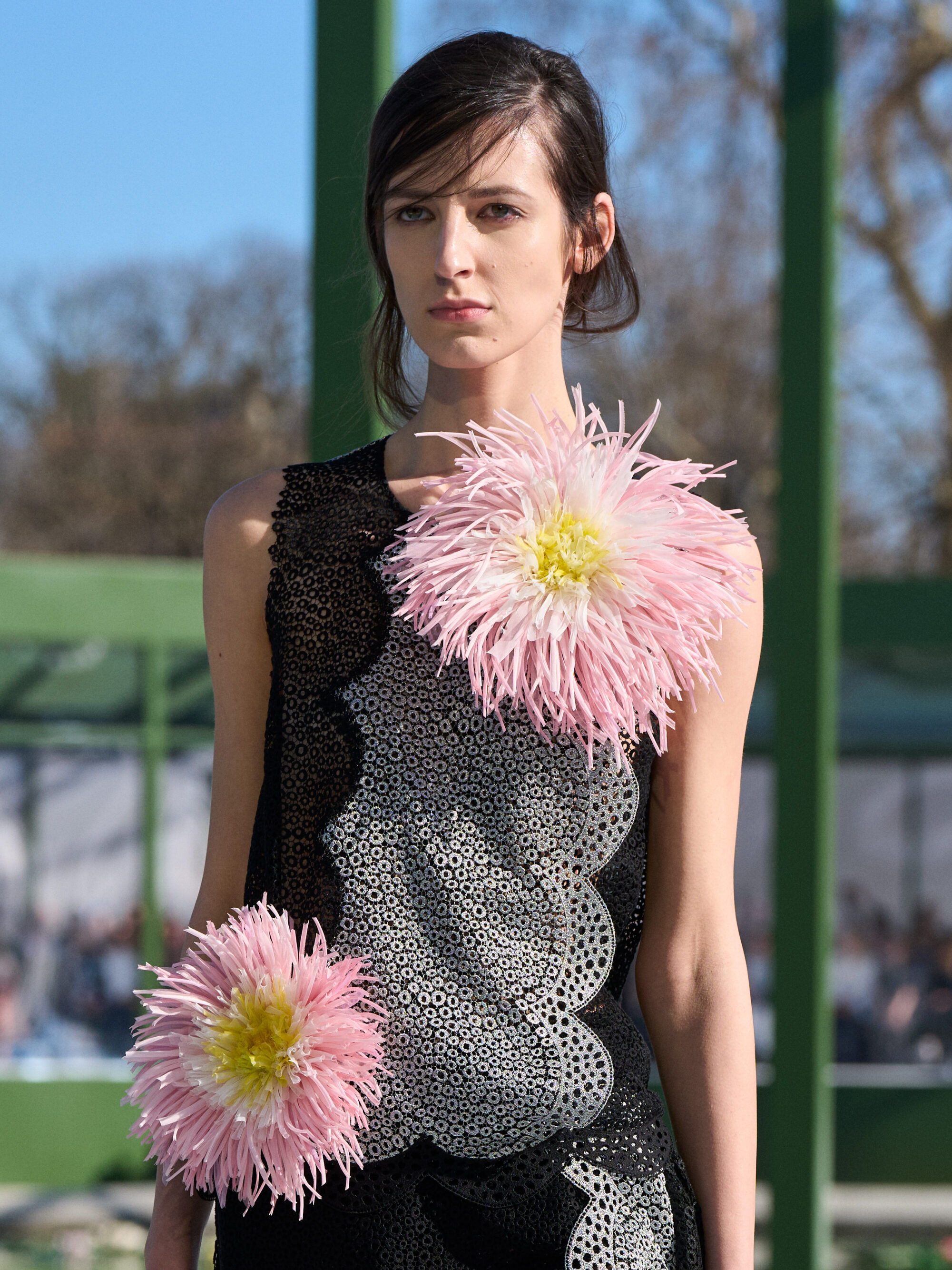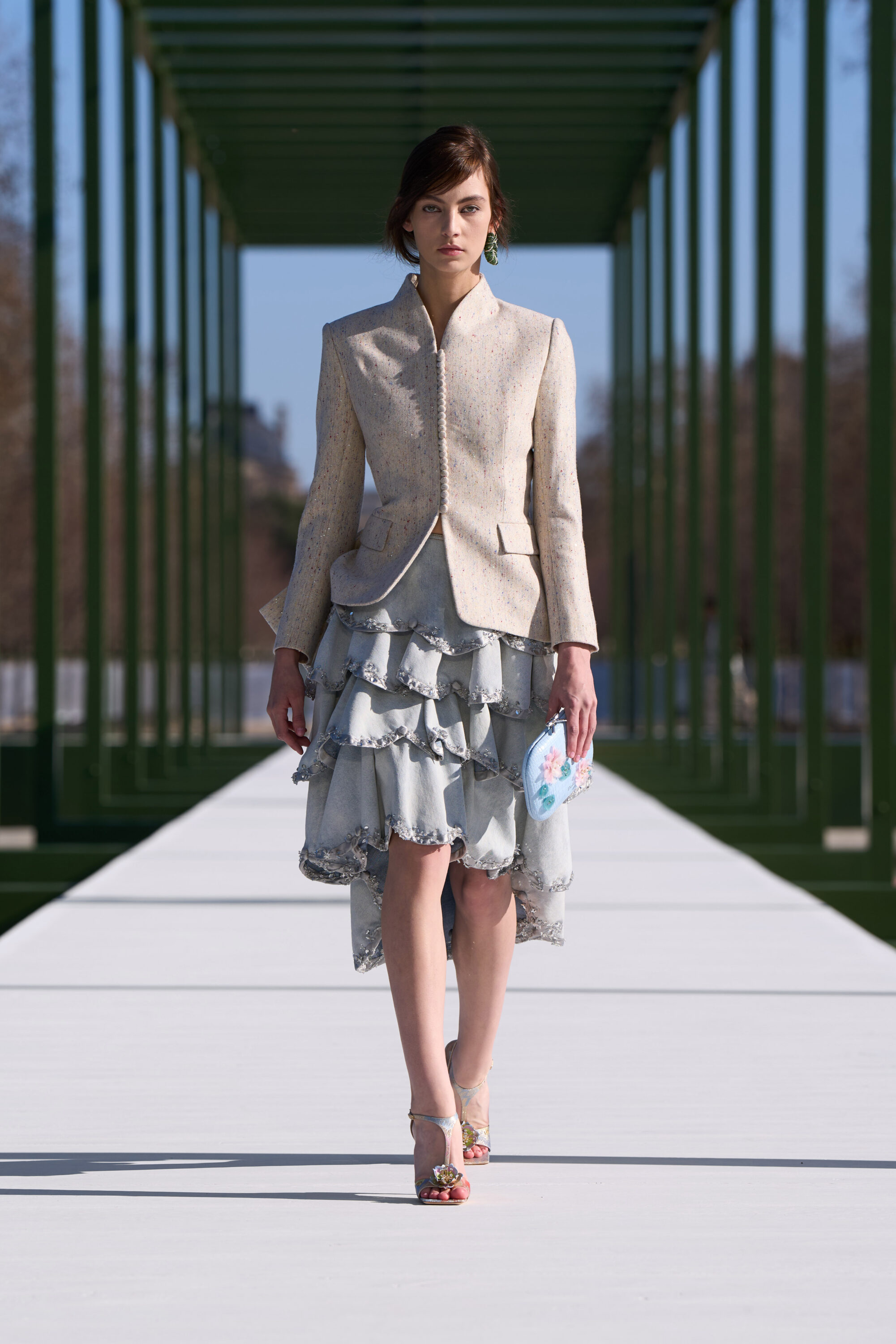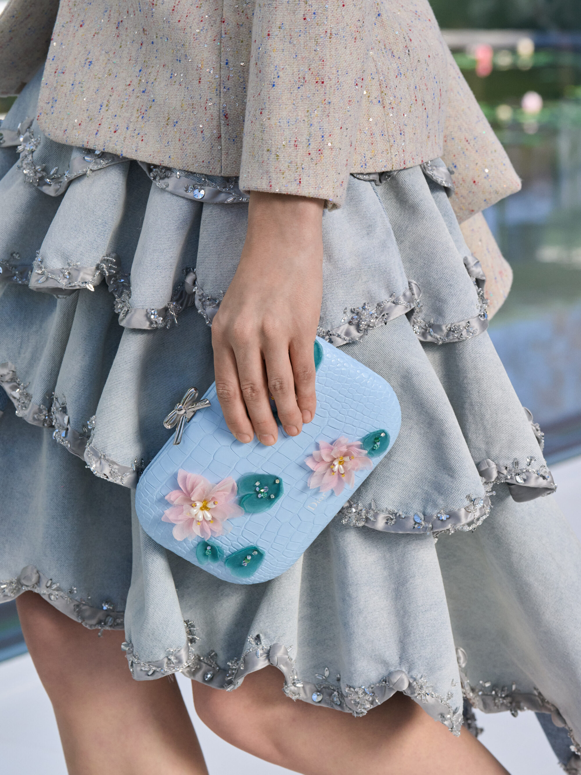 粉嫩杏仁色調,搭配了 Chantilly 蕾絲和金屬提花面料;不對稱的裙裝,胸前或牛仔褲上的水晶別針、細節,以及模特兒腳上的花朵高跟鞋….,不論是服飾配件中的花朵設計,或者是用布料堆疊出來的層次、錯視感,「花卉」元素隨處可見,讓城市的活力在這座花園的界限內重現,把形形色色的巴黎人們,透過衣著間閃現的色彩,融入幾何花壇的圖案之中。
