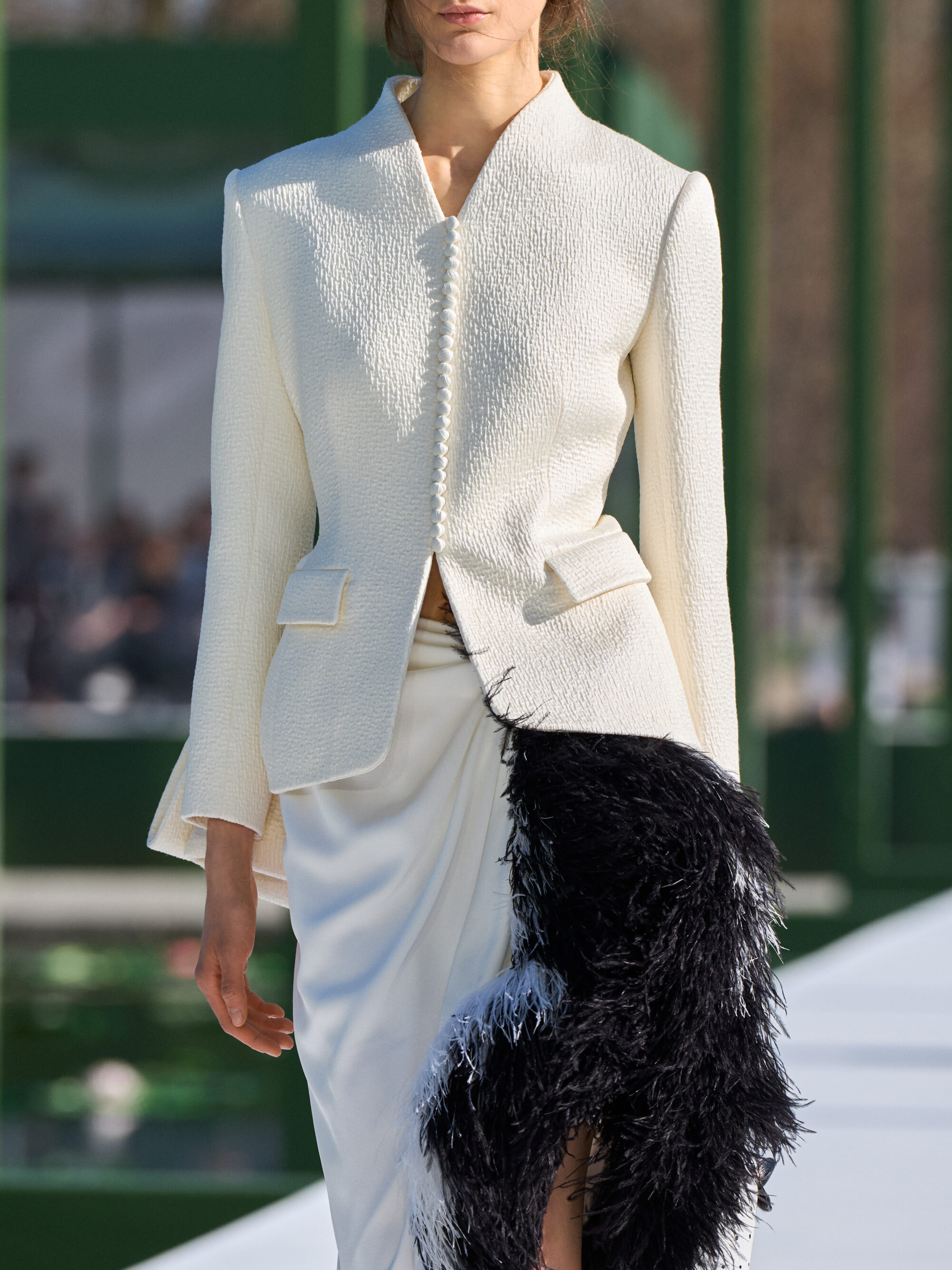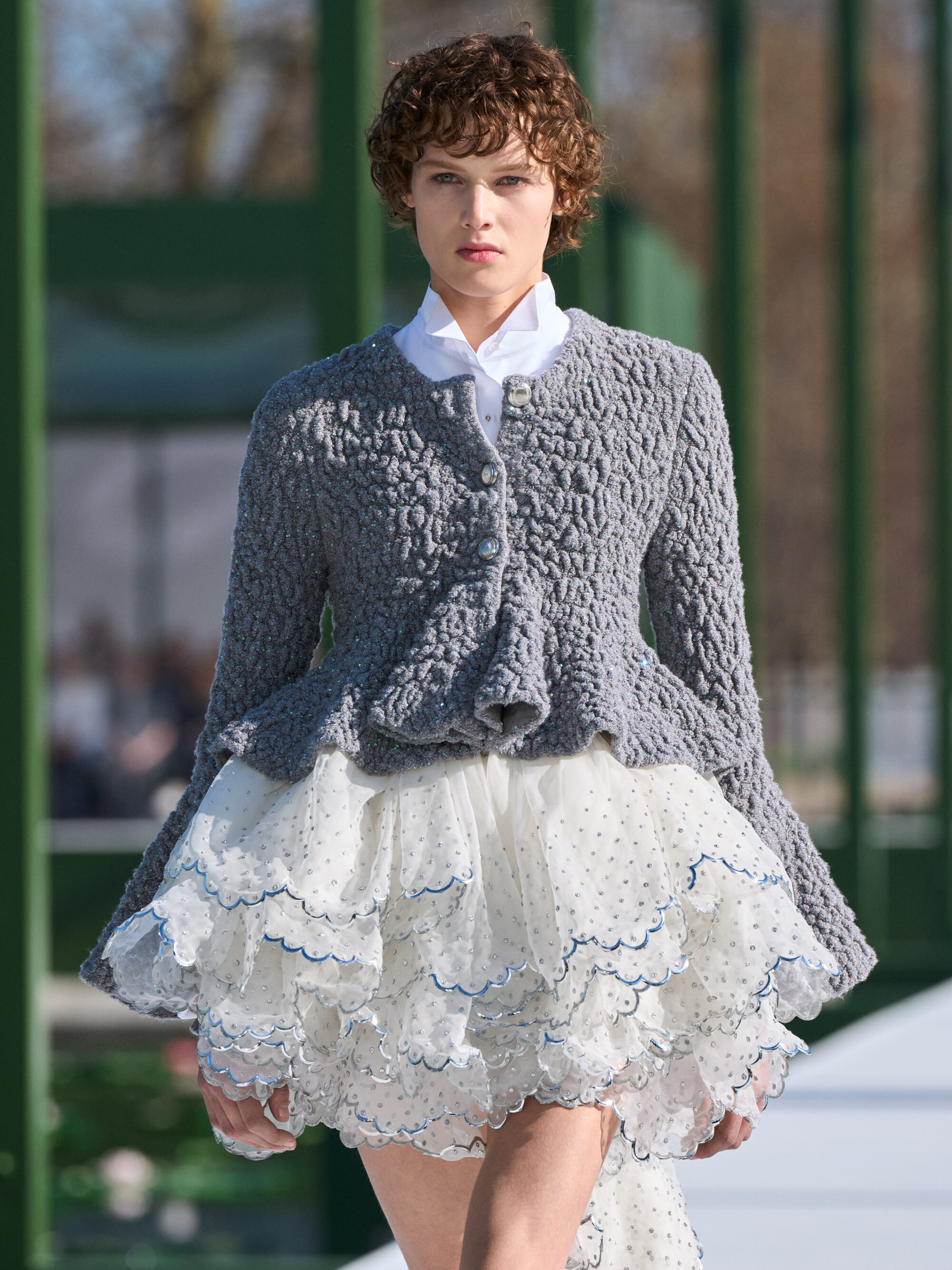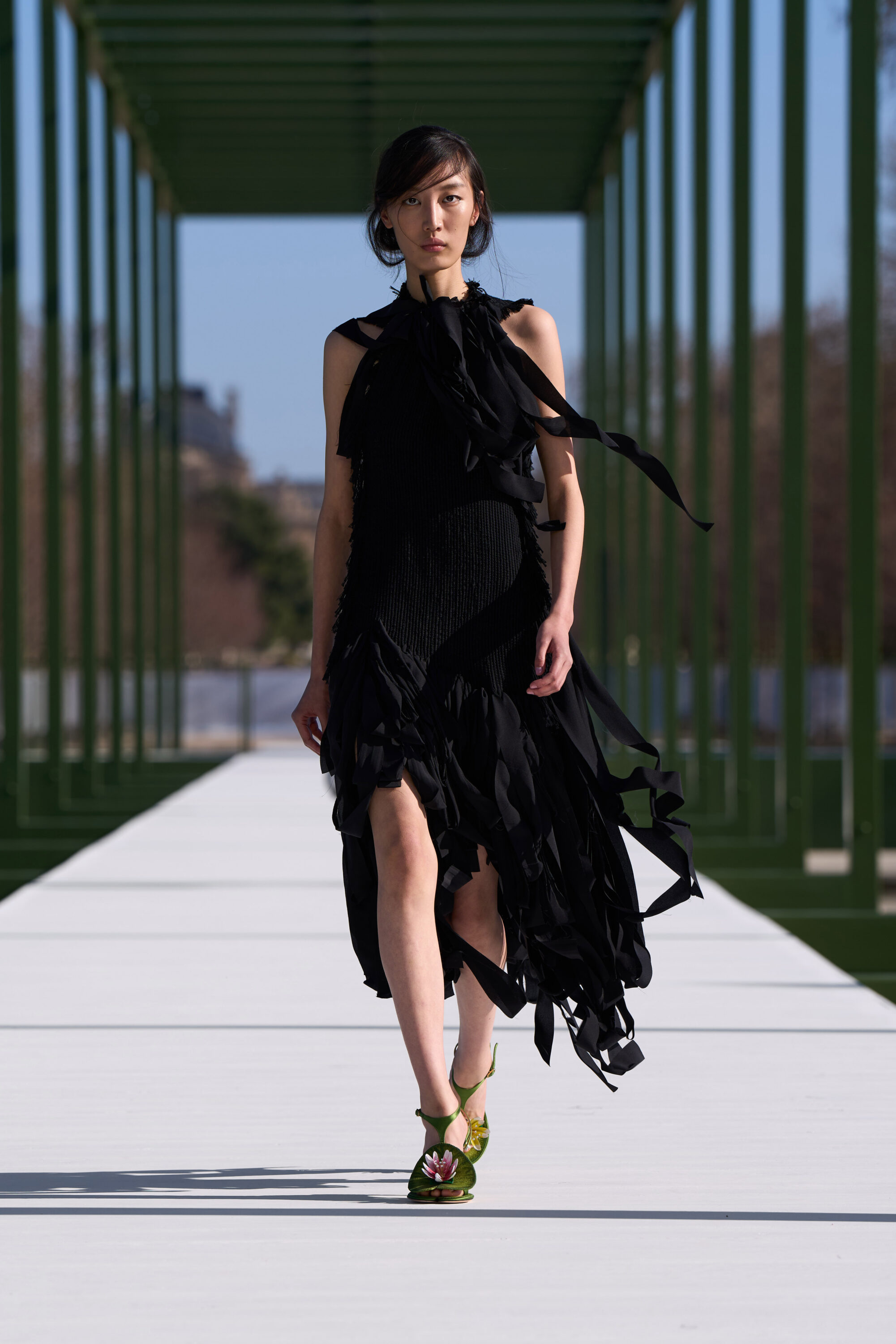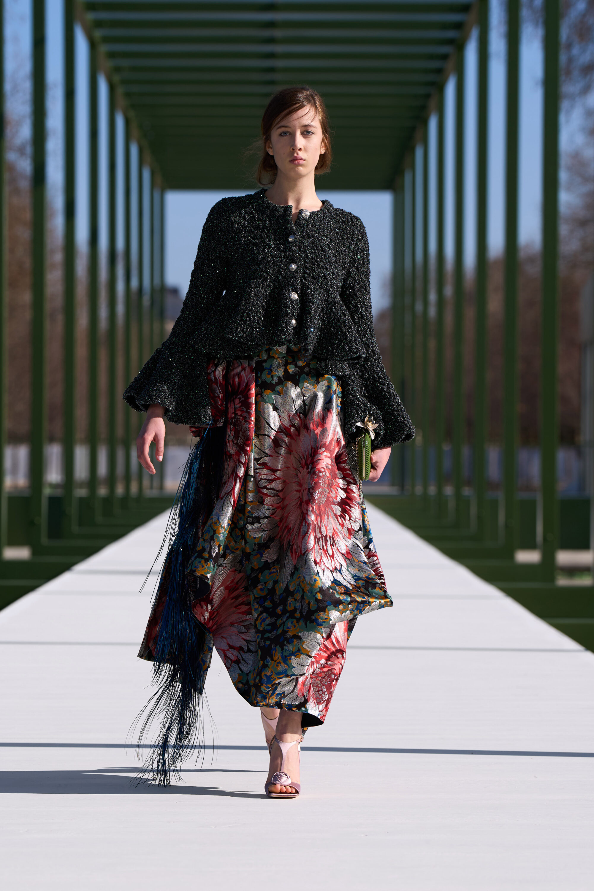 粉嫩杏仁色調,搭配了 Chantilly 蕾絲和金屬提花面料;不對稱的裙裝,胸前或牛仔褲上的水晶別針、細節,以及模特兒腳上的花朵高跟鞋….,不論是服飾配件中的花朵設計,或者是用布料堆疊出來的層次、錯視感,「花卉」元素隨處可見,讓城市的活力在這座花園的界限內重現,把形形色色的巴黎人們,透過衣著間閃現的色彩,融入幾何花壇的圖案之中。