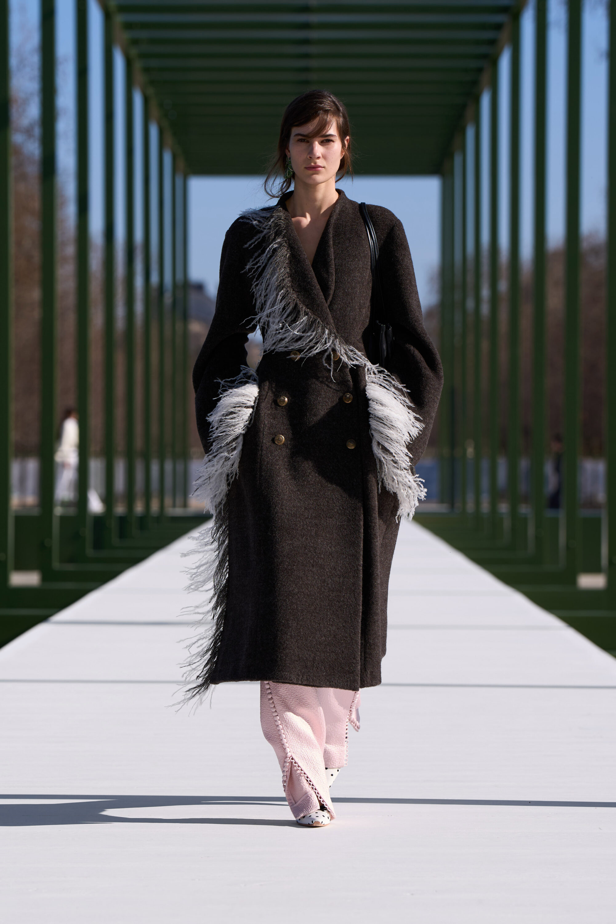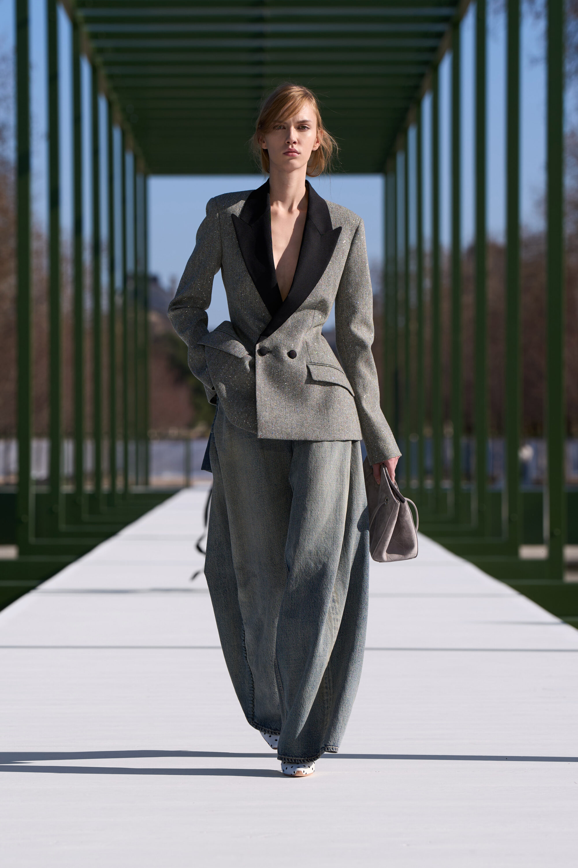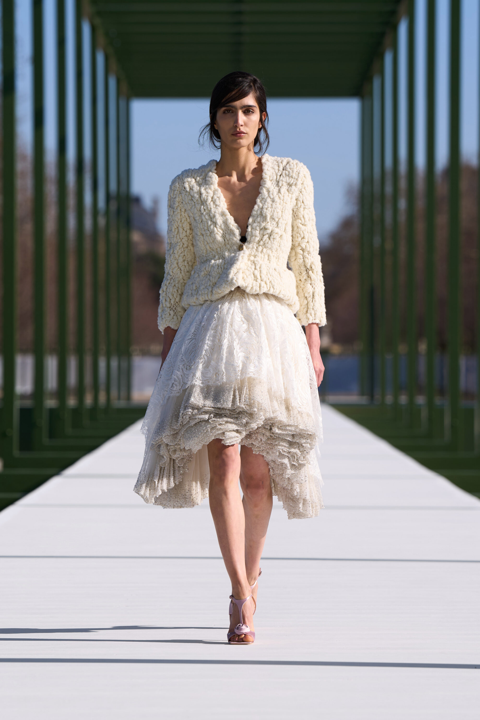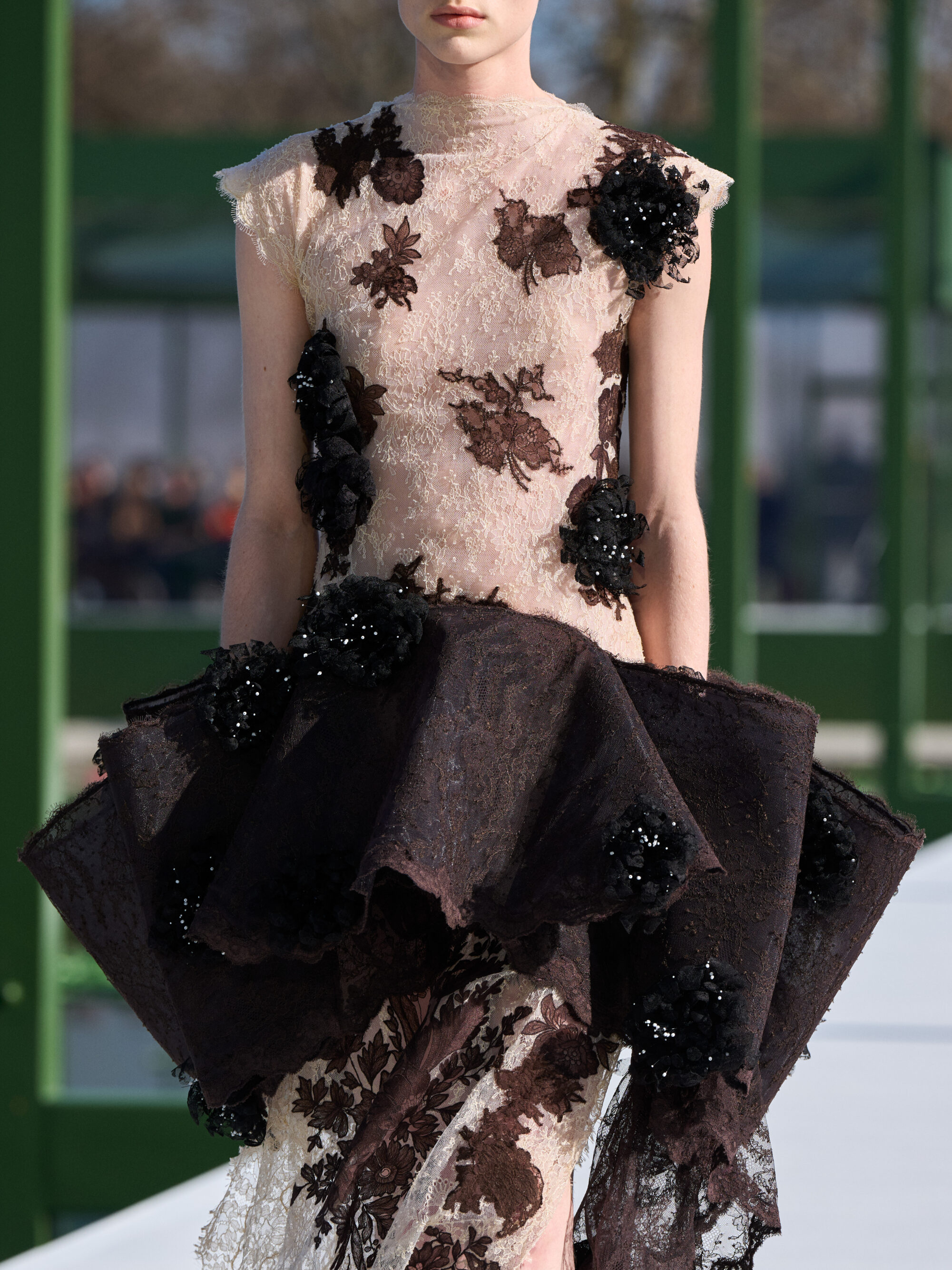 粉嫩杏仁色調,搭配了 Chantilly 蕾絲和金屬提花面料;不對稱的裙裝,胸前或牛仔褲上的水晶別針、細節,以及模特兒腳上的花朵高跟鞋….,不論是服飾配件中的花朵設計,或者是用布料堆疊出來的層次、錯視感,「花卉」元素隨處可見,讓城市的活力在這座花園的界限內重現,把形形色色的巴黎人們,透過衣著間閃現的色彩,融入幾何花壇的圖案之中。