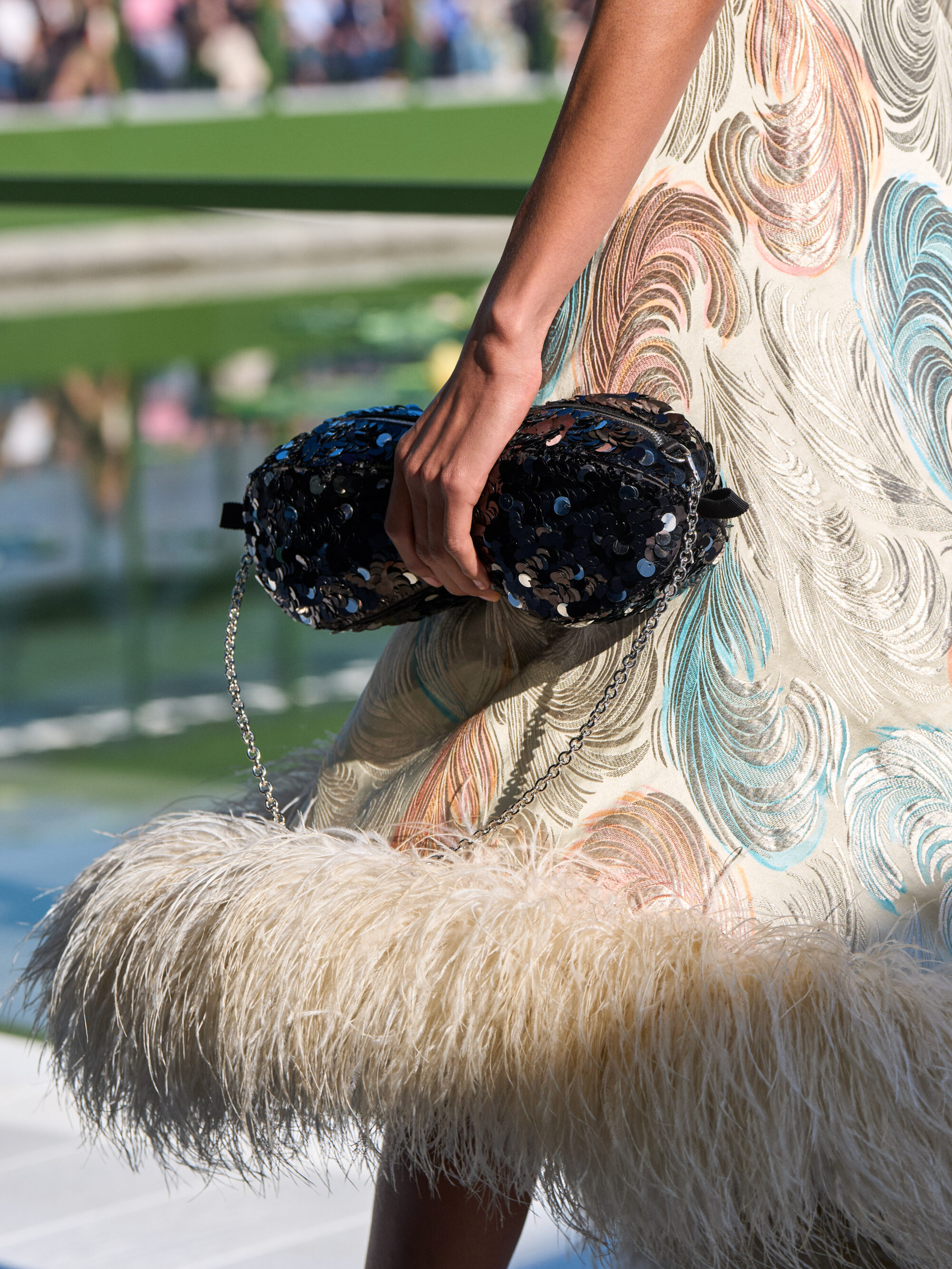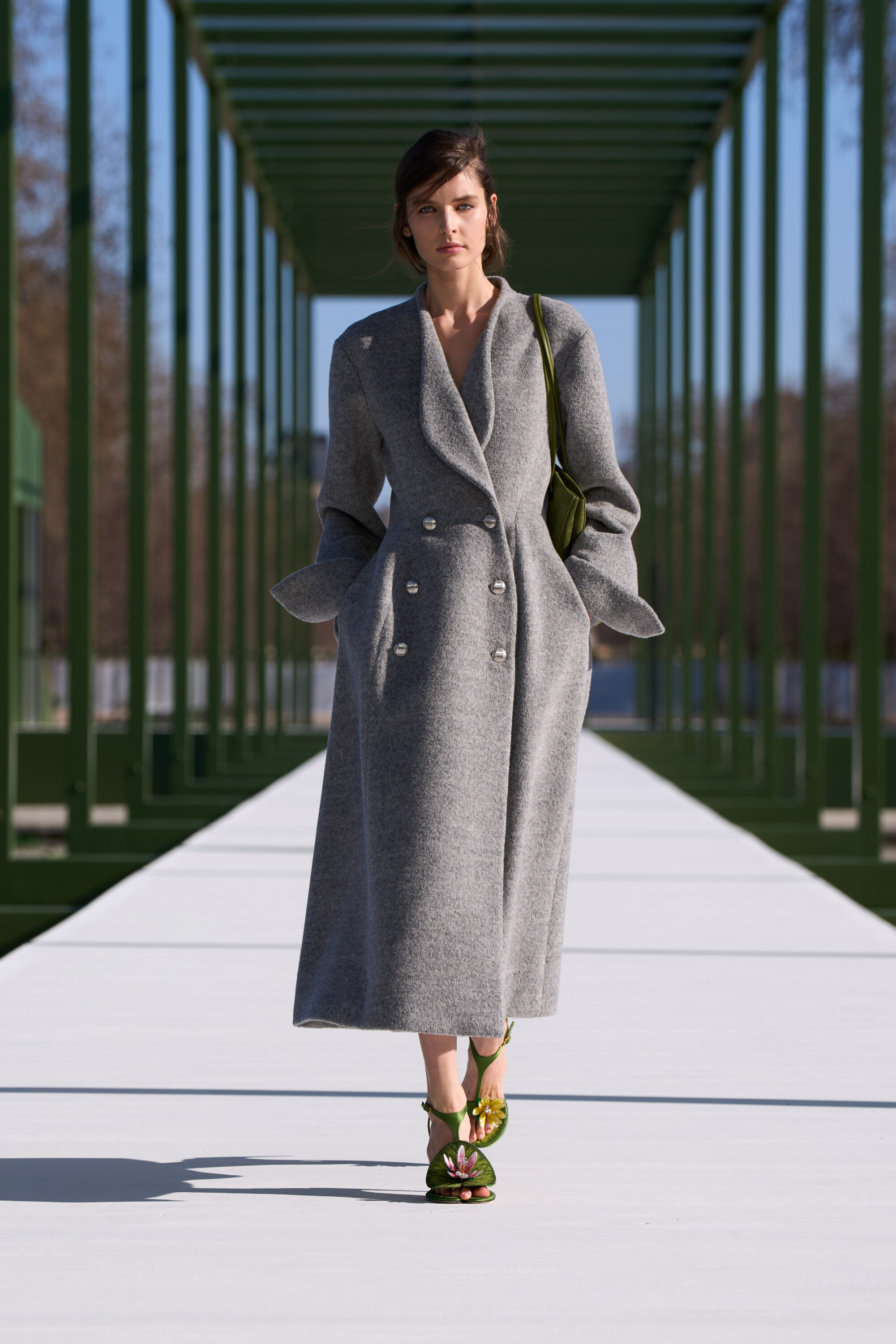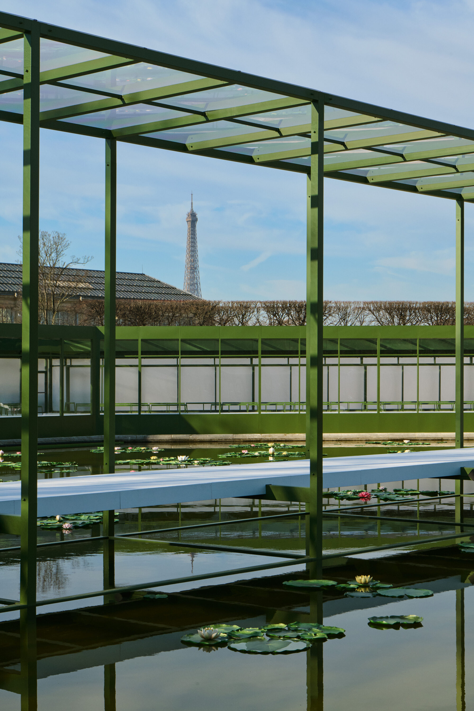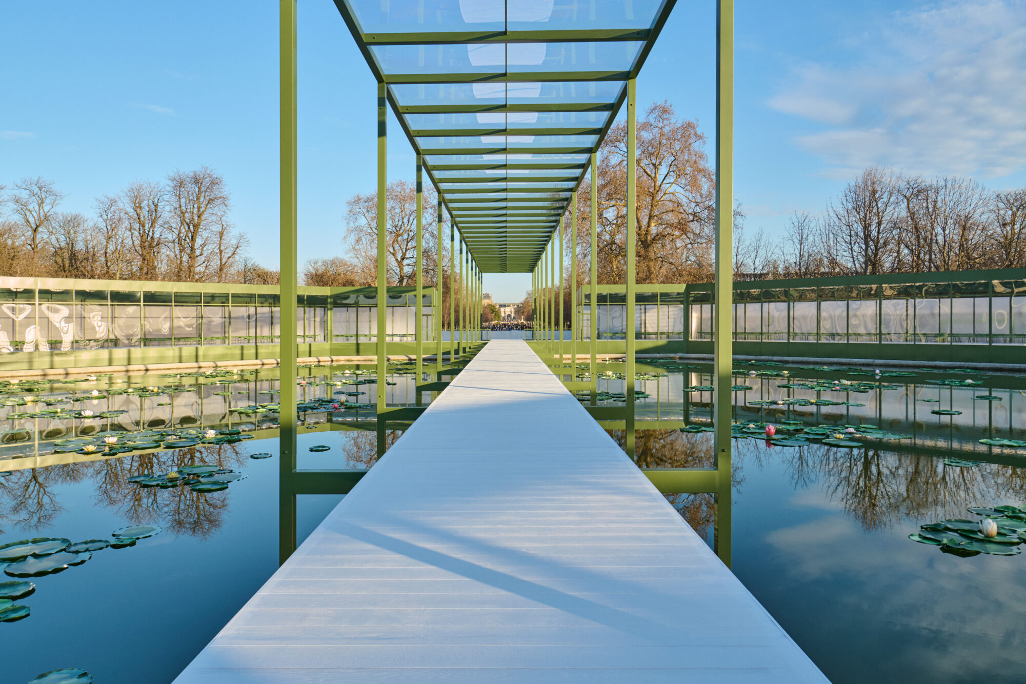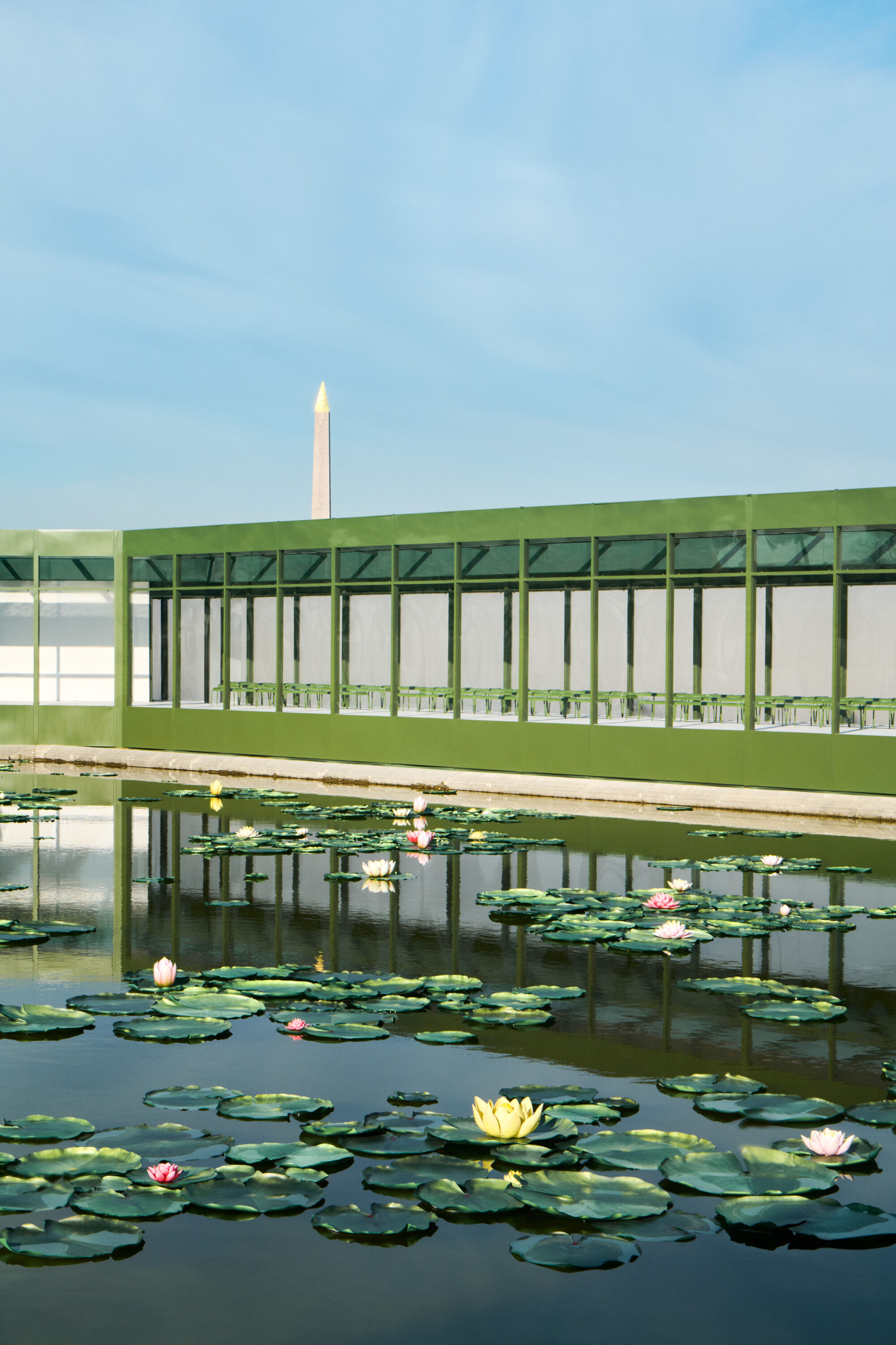 以巴黎最為人熟知的綠色公園椅作為邀請函,Jonathan Anderson 在杜樂麗花園搭建的秀場,以同色調呈現,並在水池中放入滿池的睡蓮,在被太陽親吻的春日午後,閃閃發亮的風景顯得格外動人。