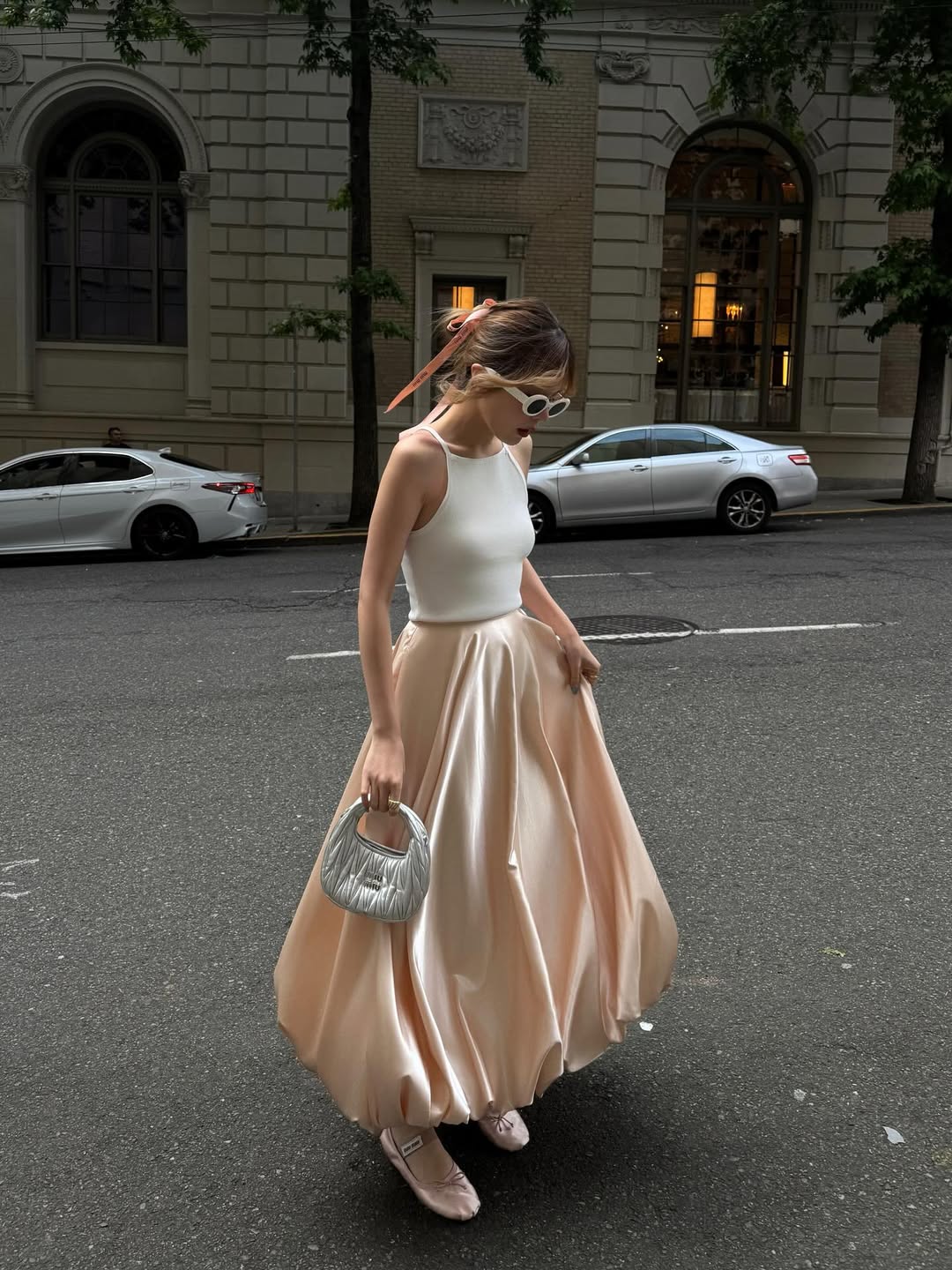 說到裙裝,這幾年氣球裙、花苞裙、蛋糕裙都好穿人在穿,這類「芭蕾風蓬裙」隨著 Balletcore 的熱潮而席捲女孩們的衣櫃,其剪裁多為 A 字輪廓,本身就很有份量感,加上蕾絲,或是下擺內包的弧度,穿起來極具辨識度。