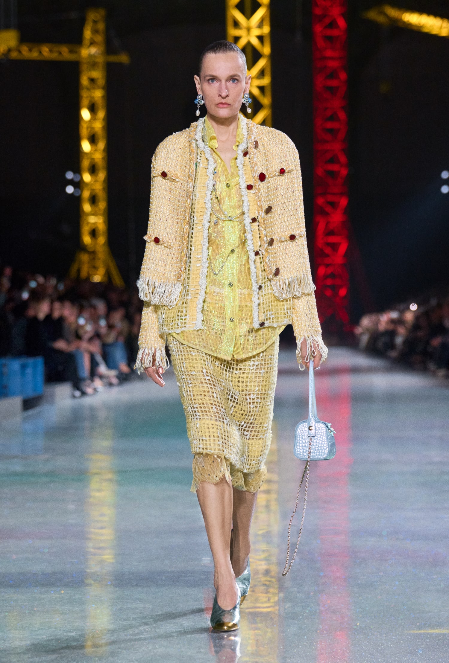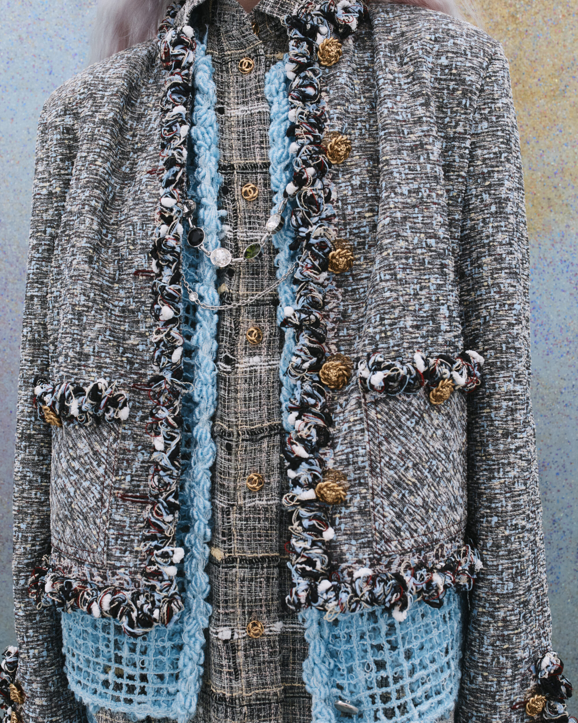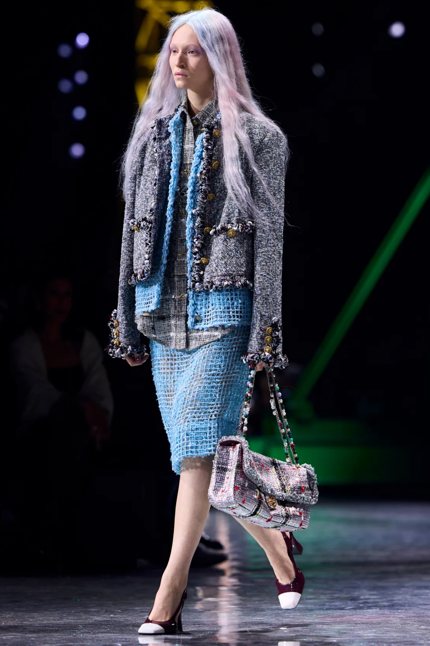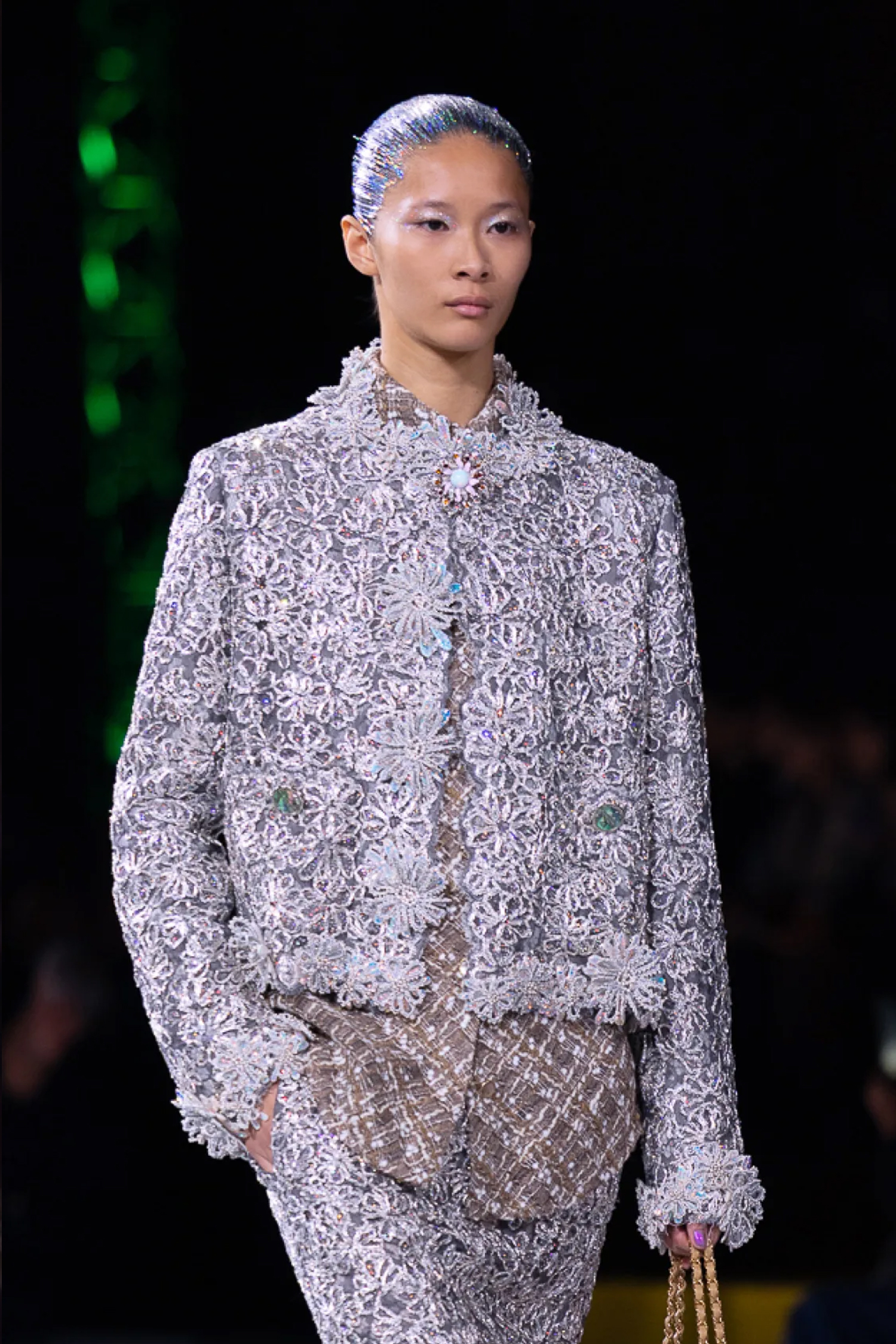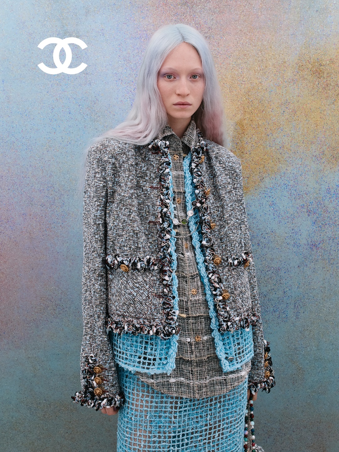 Matthieu Blazy 再次展現他對布料的超高掌握度與創造力,從羅紋針織到斜紋軟呢,再到以合成纖維、Lurex 金銀絲、矽膠及天然薄紗交織而成的精緻布料,加上全新研發的珠飾工藝,以多元材質重新詮釋作為 CHANEL 品牌符碼的經典套裝。