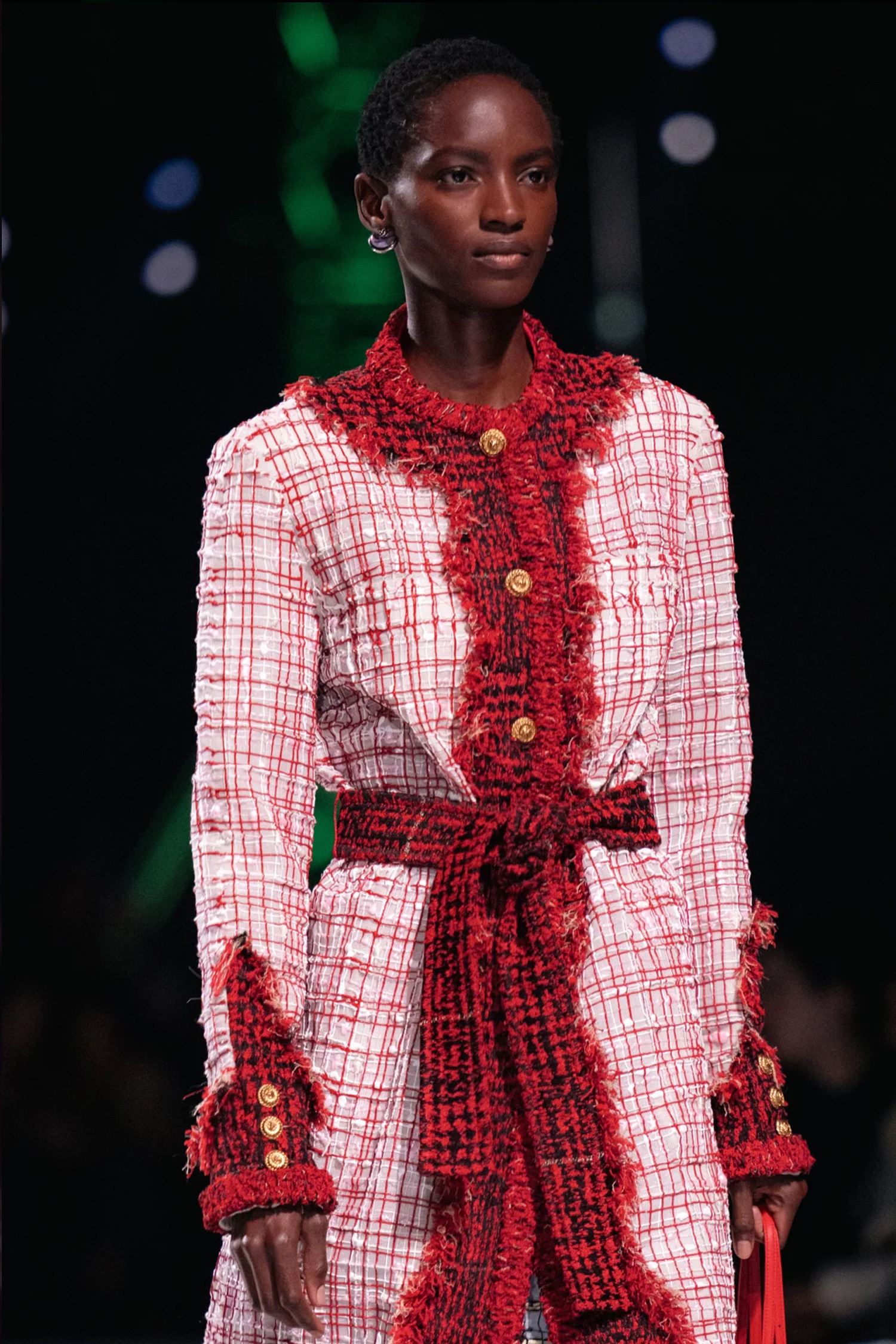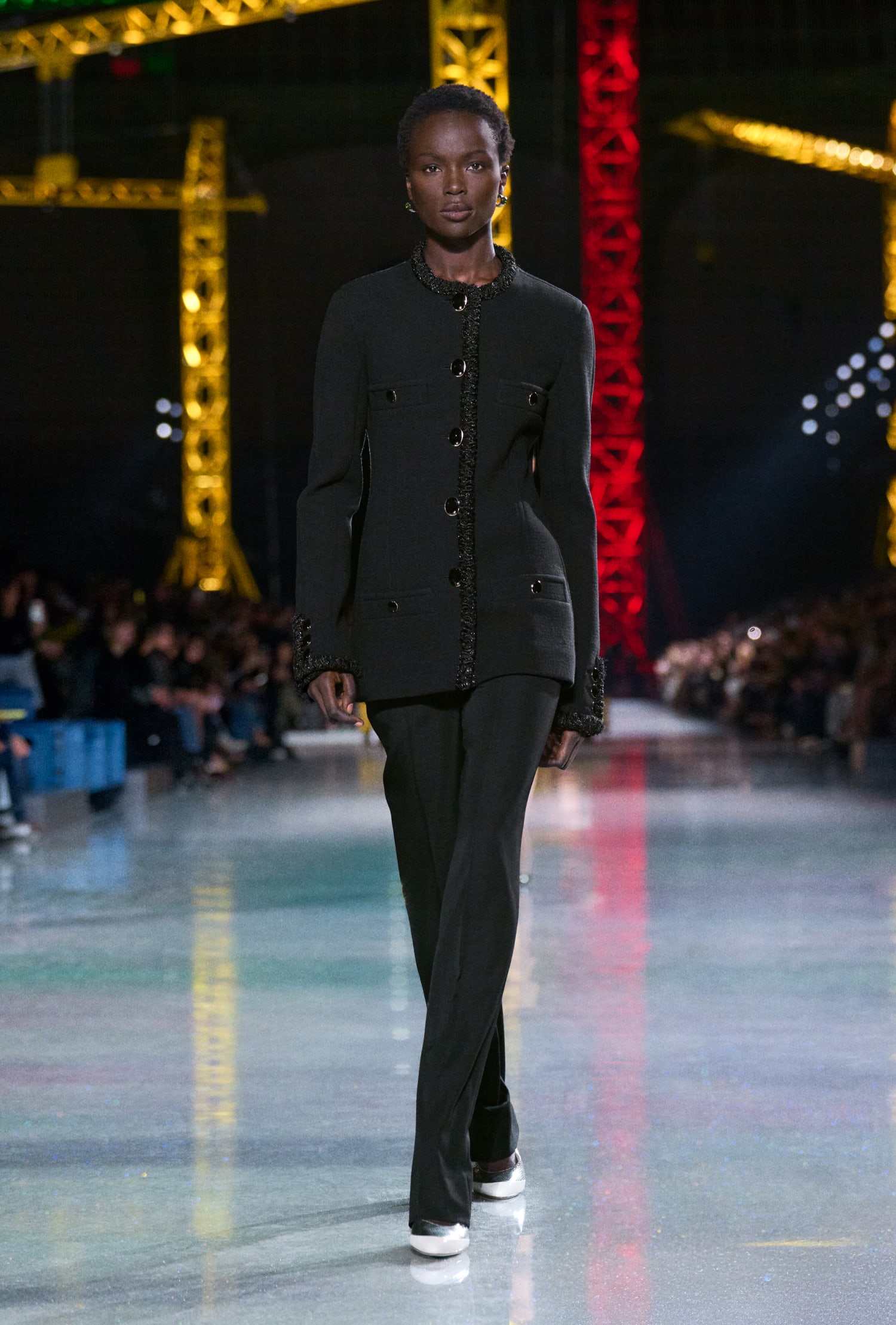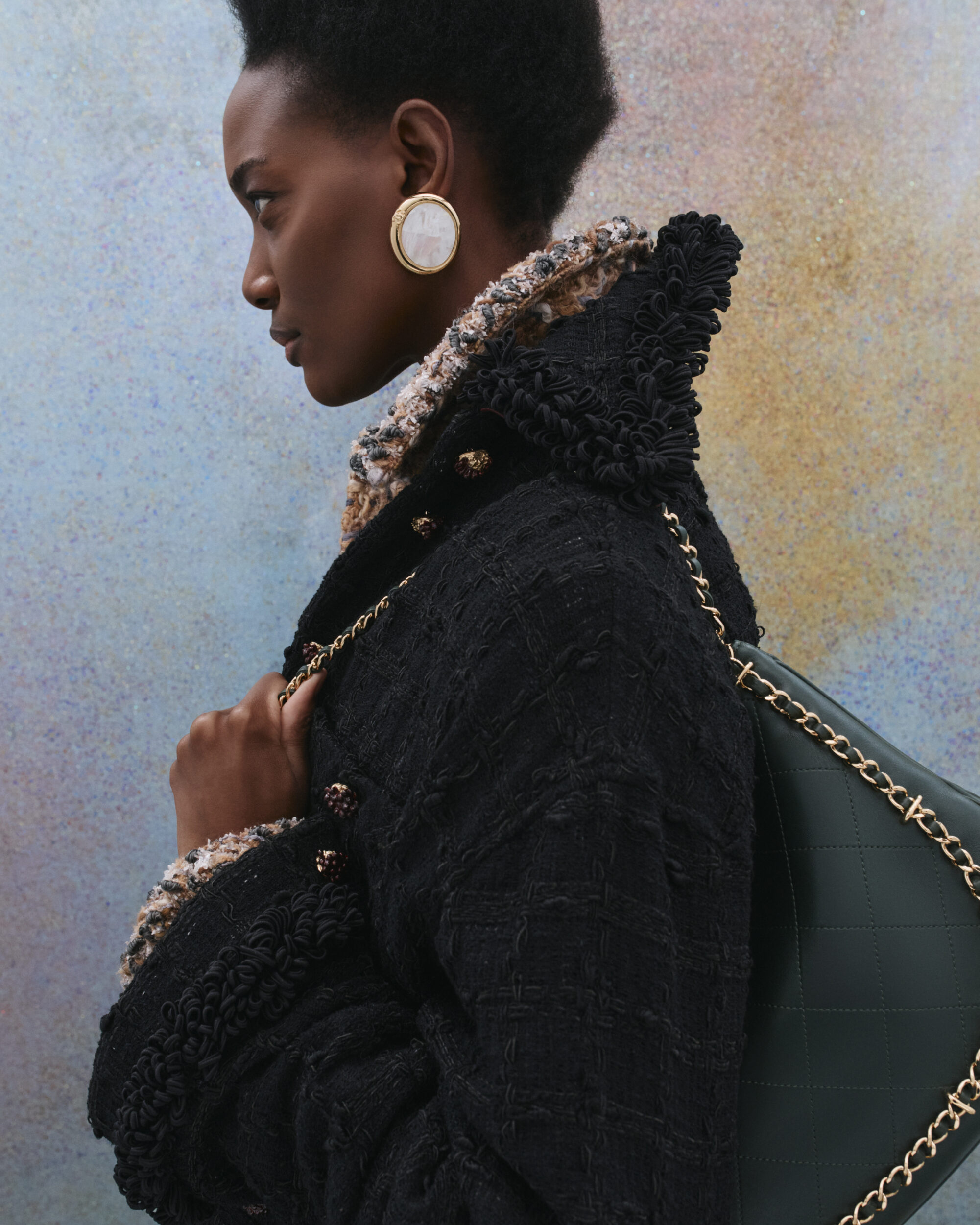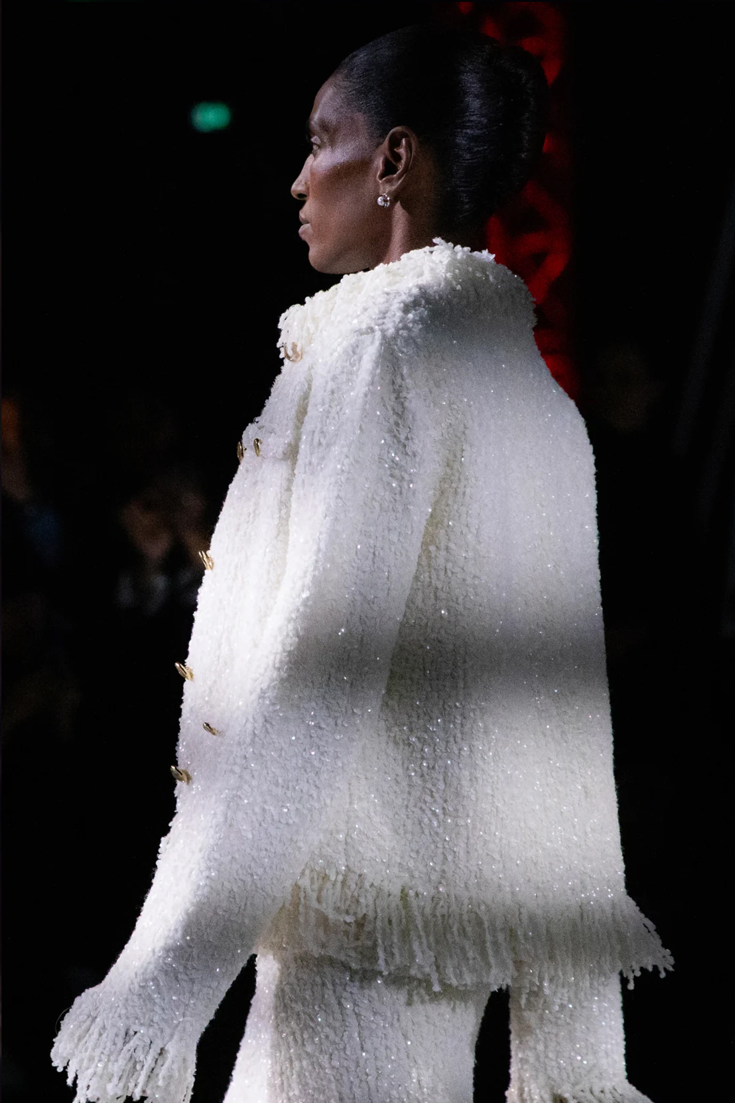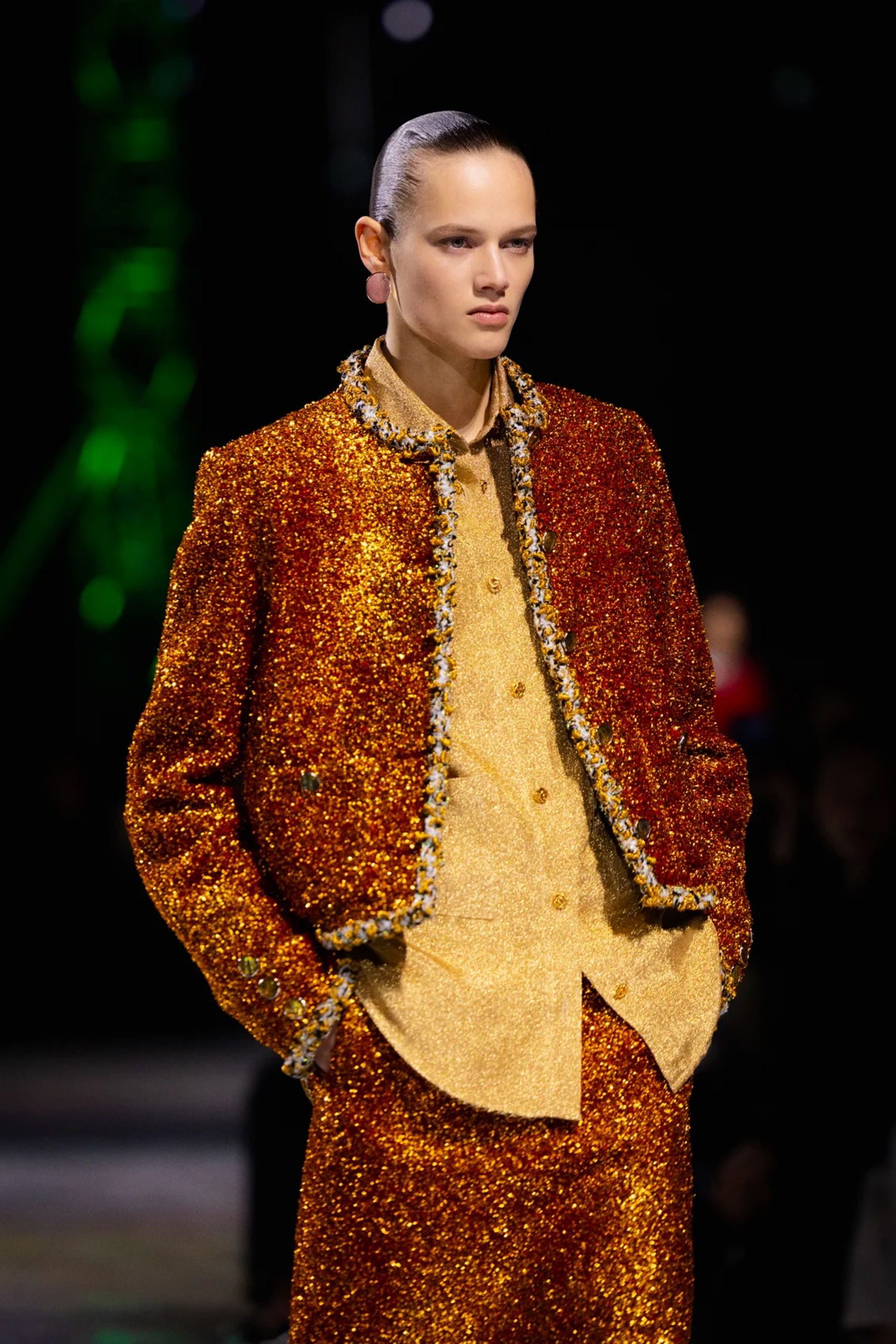 Matthieu Blazy 再次展現他對布料的超高掌握度與創造力,從羅紋針織到斜紋軟呢,再到以合成纖維、Lurex 金銀絲、矽膠及天然薄紗交織而成的精緻布料,加上全新研發的珠飾工藝,以多元材質重新詮釋作為 CHANEL 品牌符碼的經典套裝。