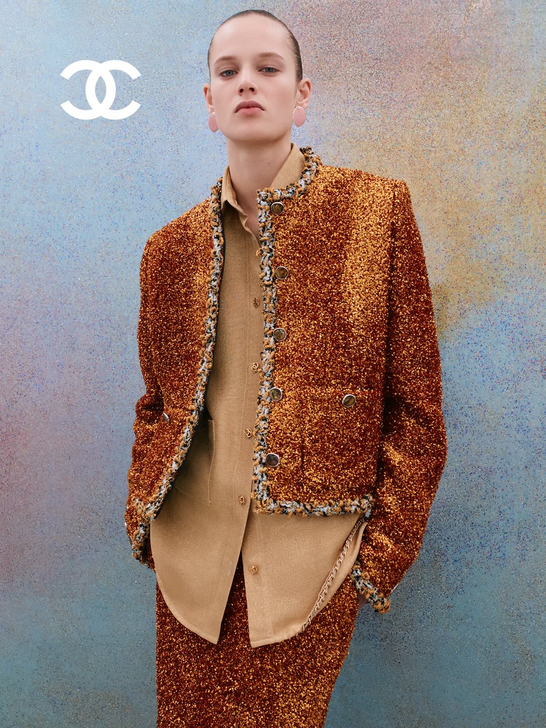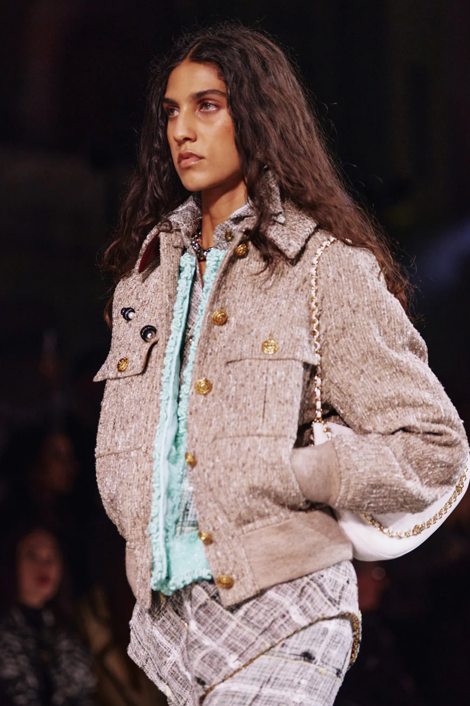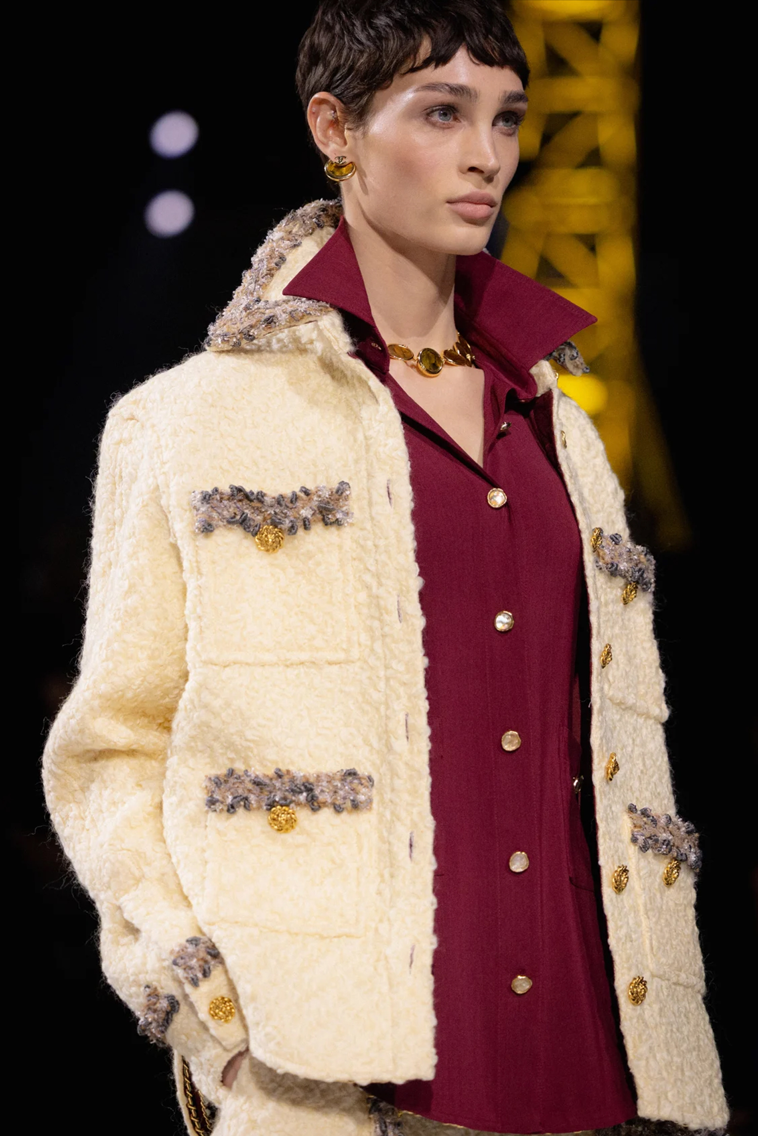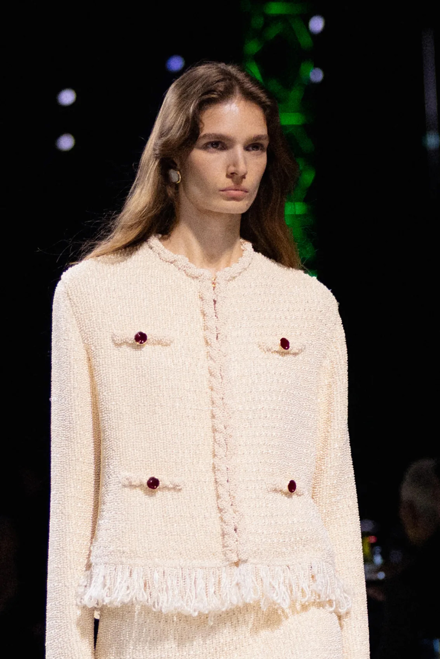 此外,斜紋軟呢不只出現在端莊的套裝上,也以工裝襯衫及布勞森外套等全新形式現身,並與 1920 年代風格的真絲針織布料交織,以及透過加入金屬絲、拆解成薄紗型態,呈現更輕盈的流動感,為整個系列添上讓人驚喜不斷的豐富細節。