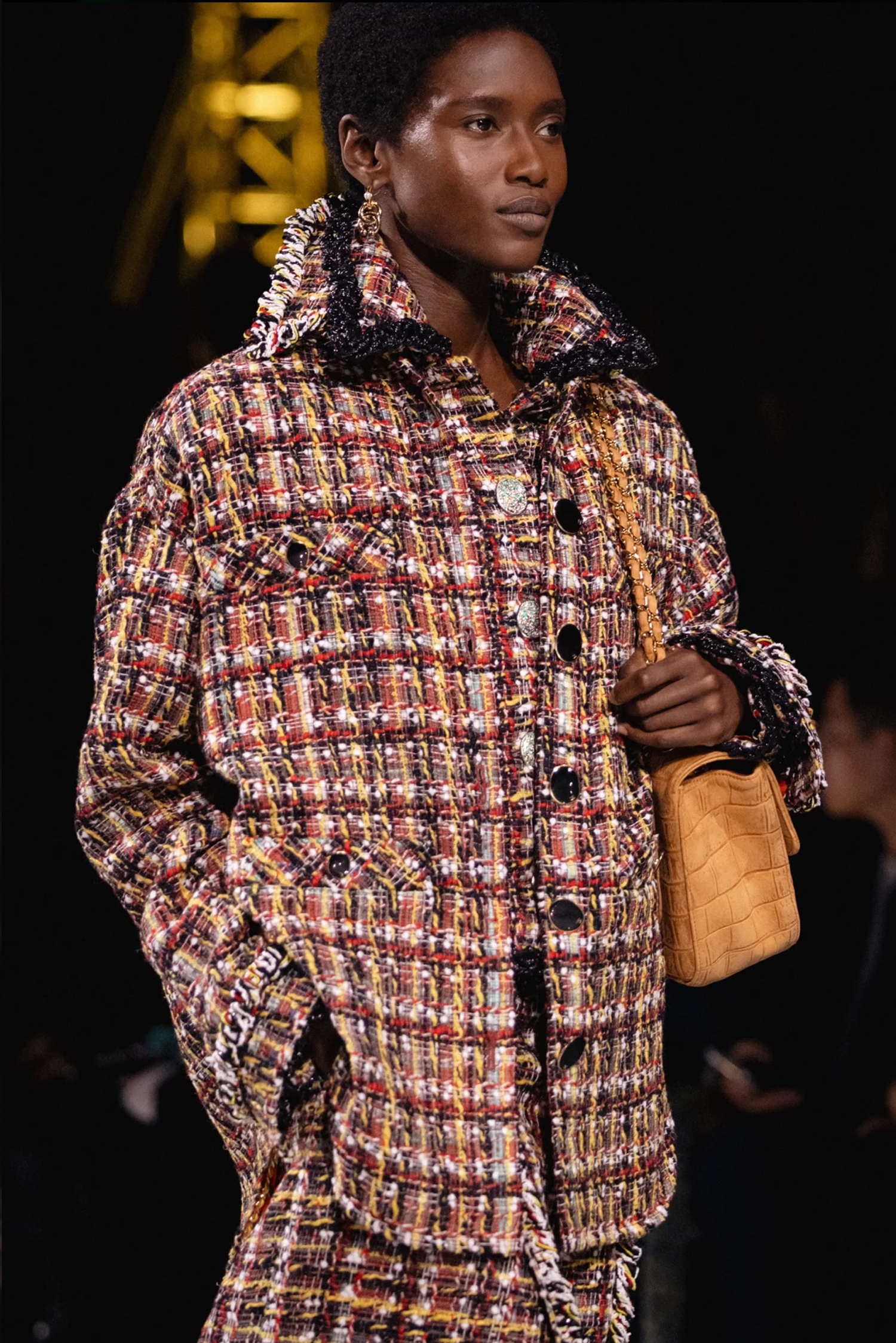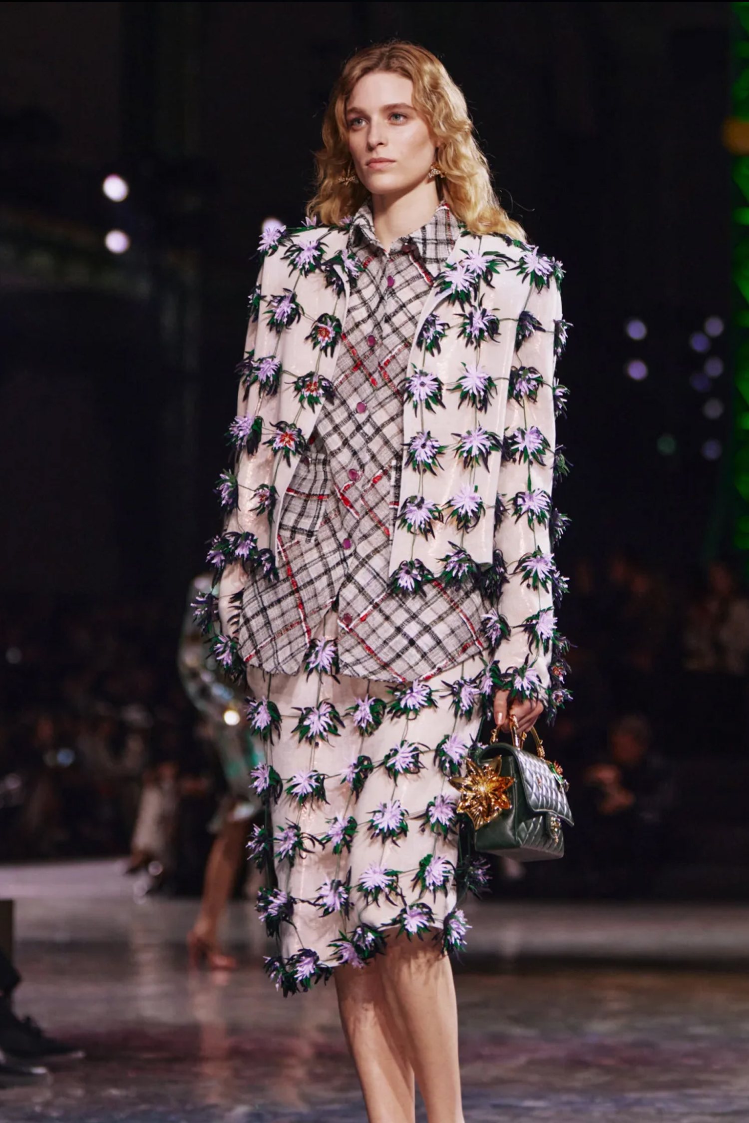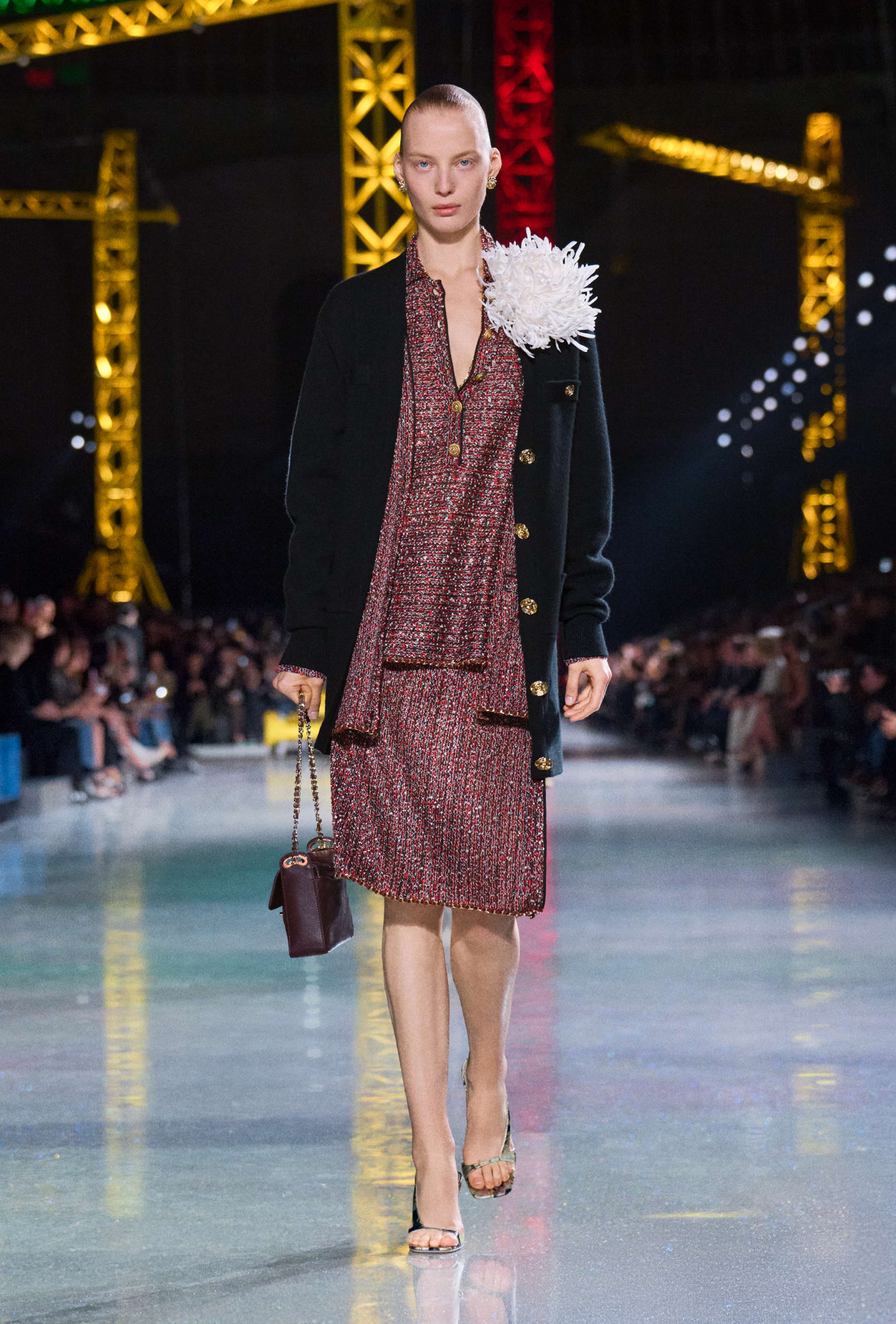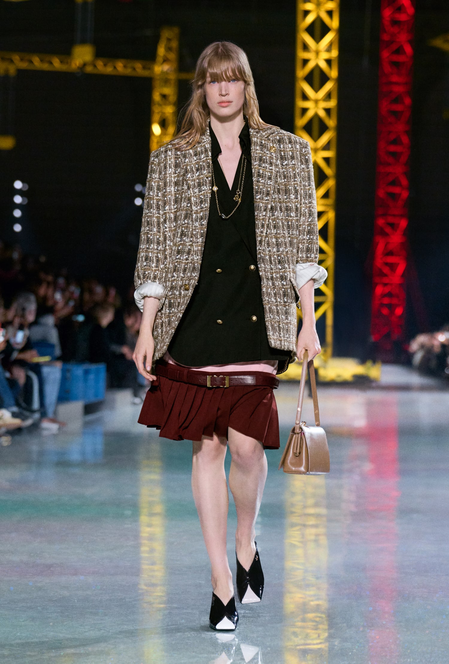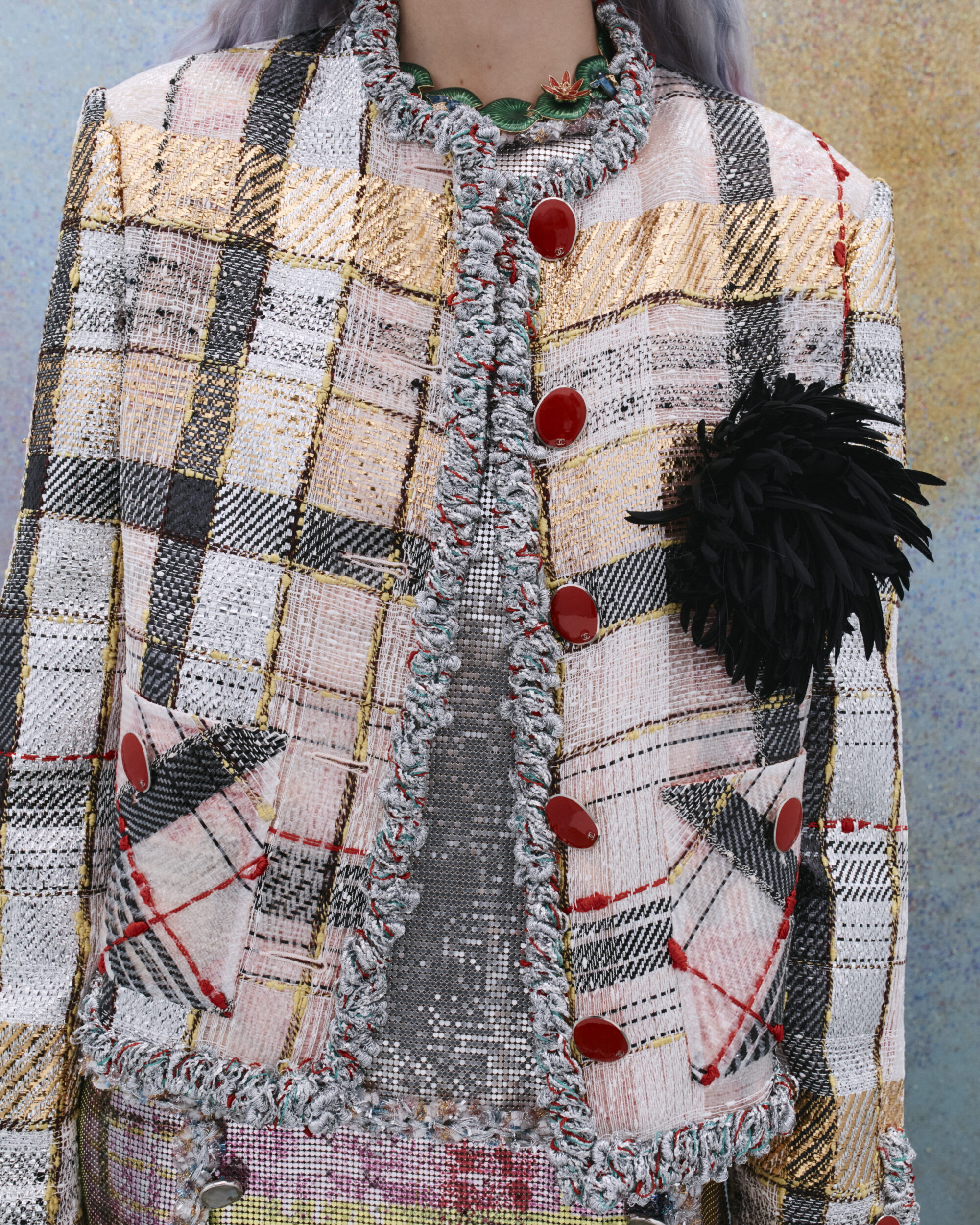 此外,斜紋軟呢不只出現在端莊的套裝上,也以工裝襯衫及布勞森外套等全新形式現身,並與 1920 年代風格的真絲針織布料交織,以及透過加入金屬絲、拆解成薄紗型態,呈現更輕盈的流動感,為整個系列添上讓人驚喜不斷的豐富細節。