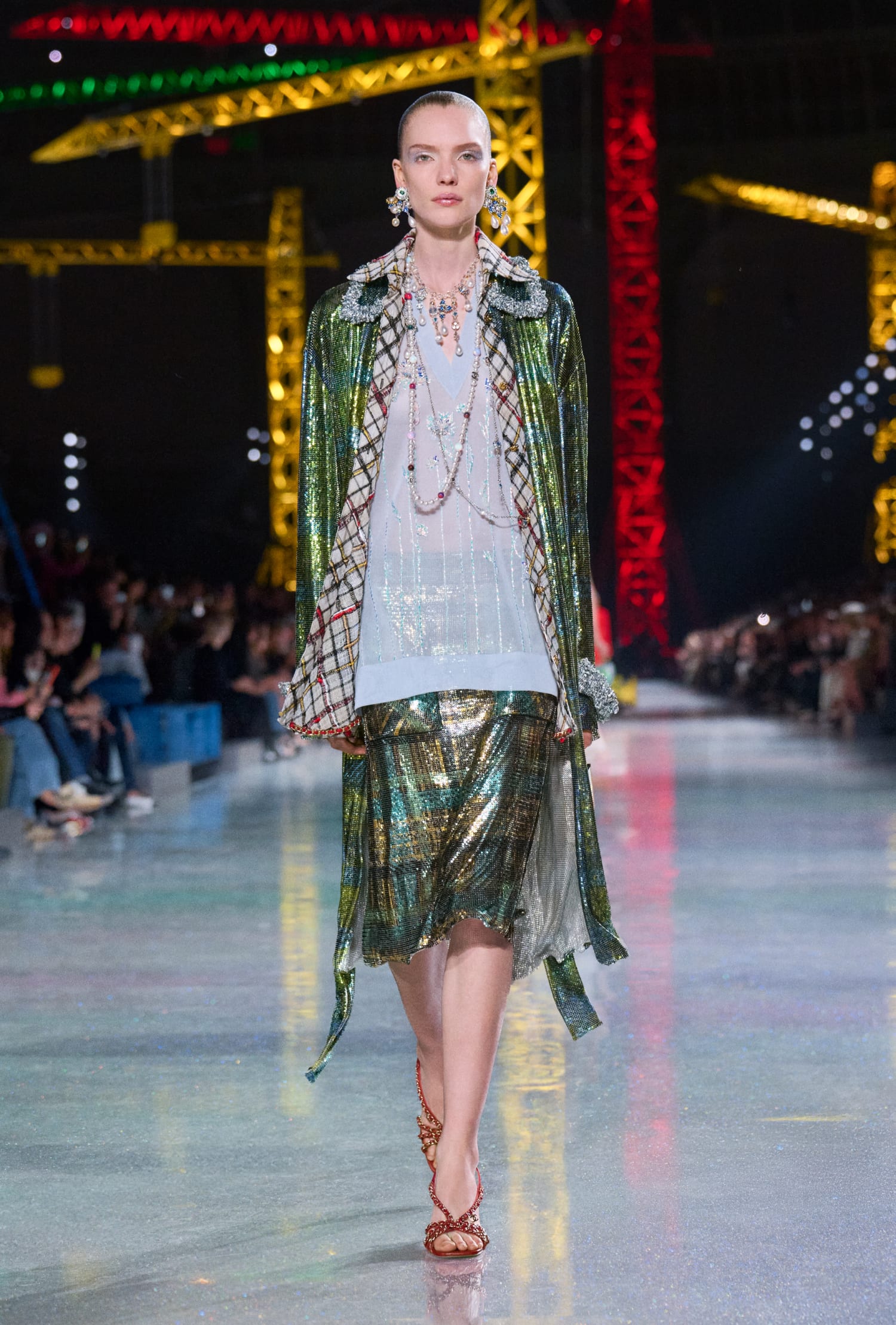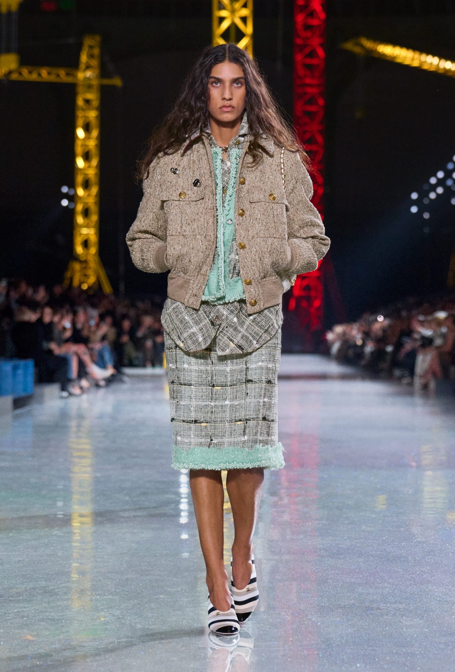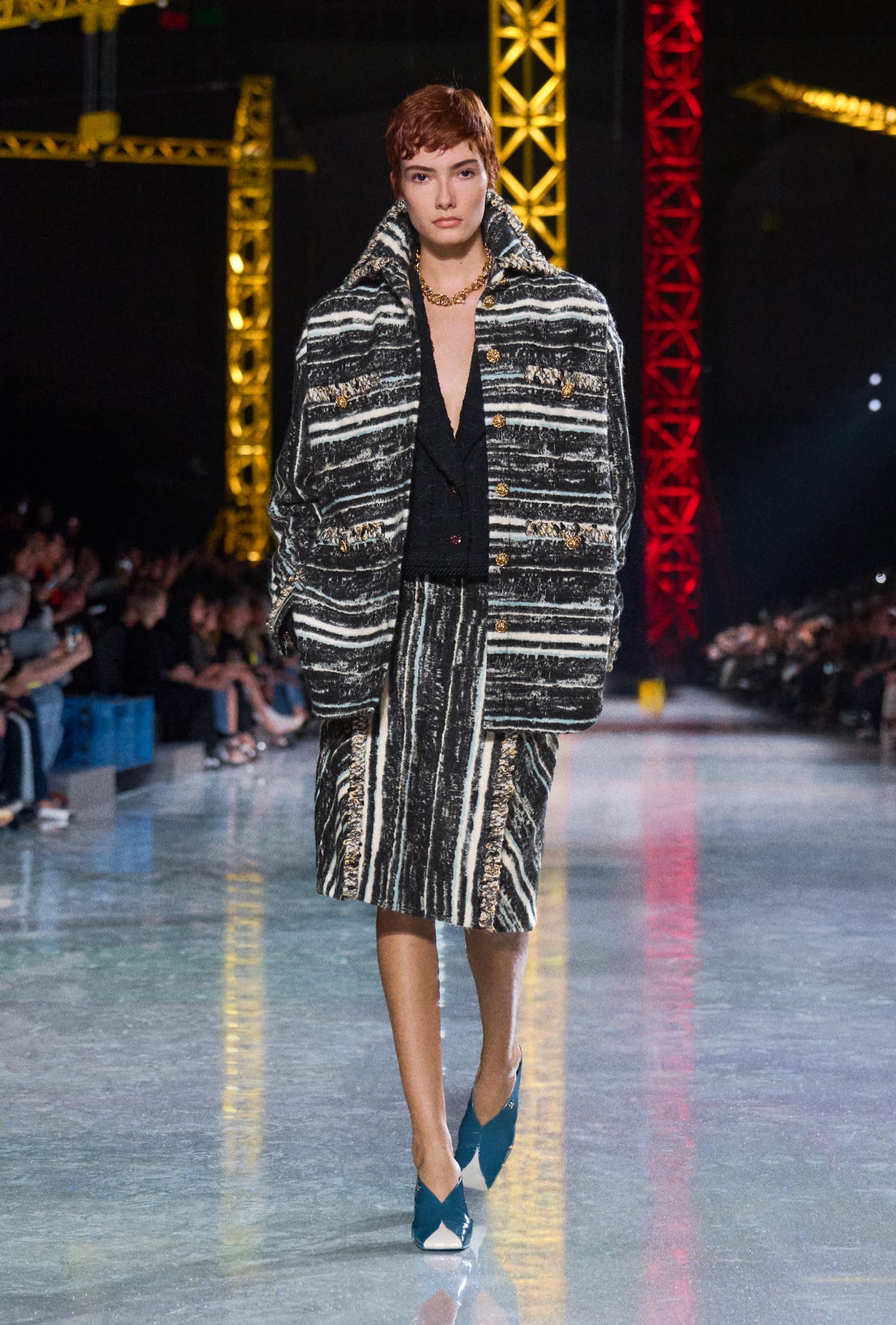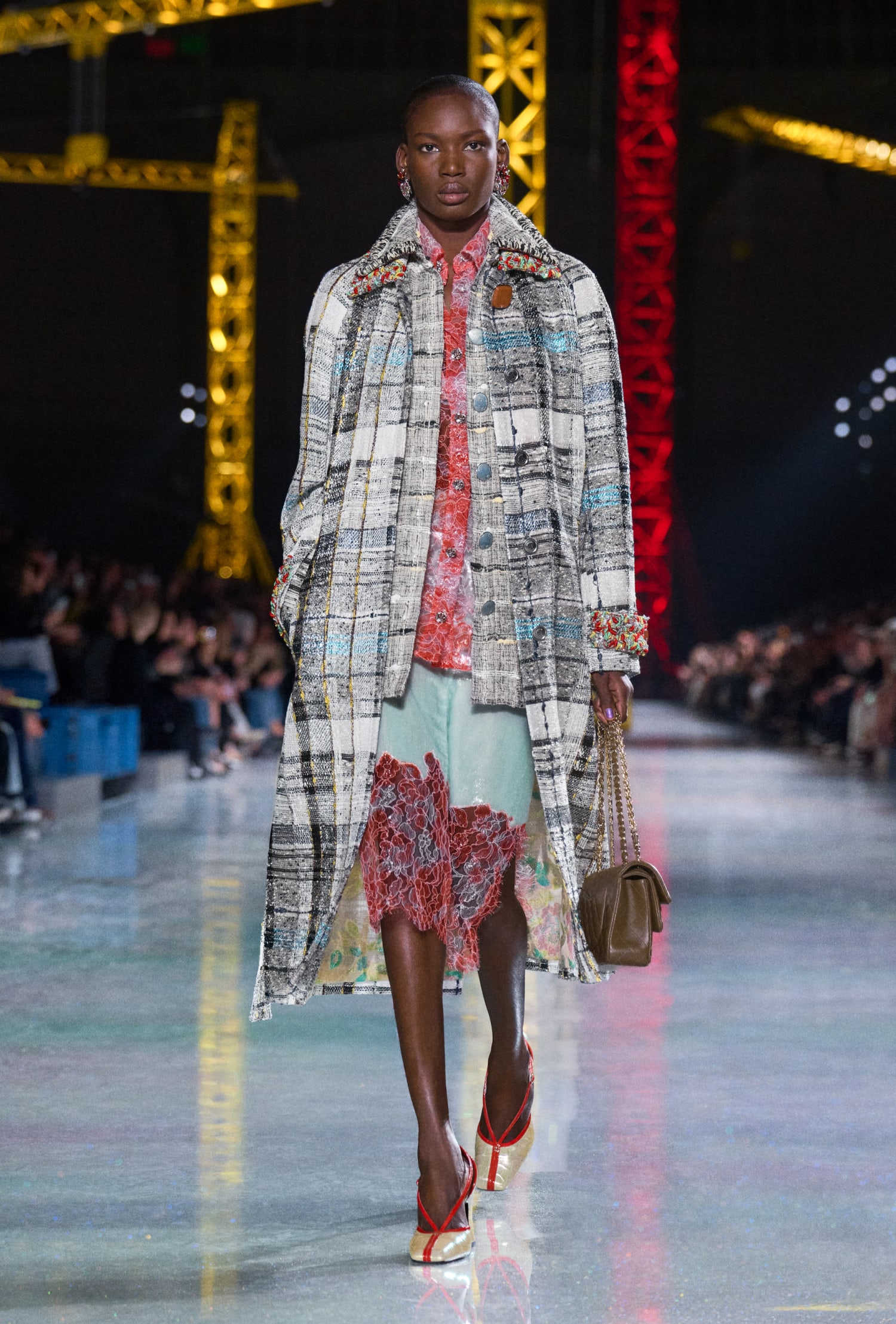 此外,斜紋軟呢不只出現在端莊的套裝上,也以工裝襯衫及布勞森外套等全新形式現身,並與 1920 年代風格的真絲針織布料交織,以及透過加入金屬絲、拆解成薄紗型態,呈現更輕盈的流動感,為整個系列添上讓人驚喜不斷的豐富細節。