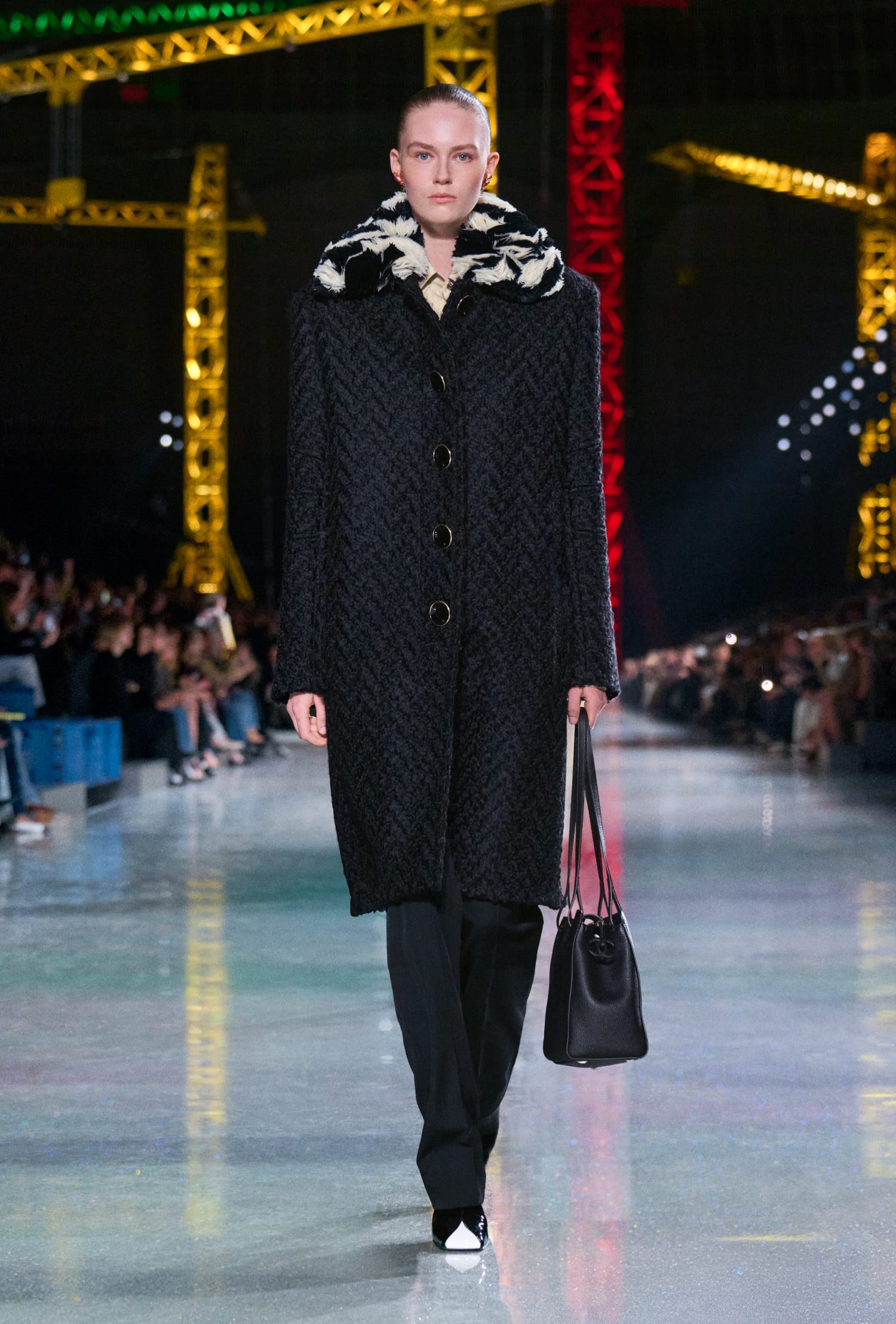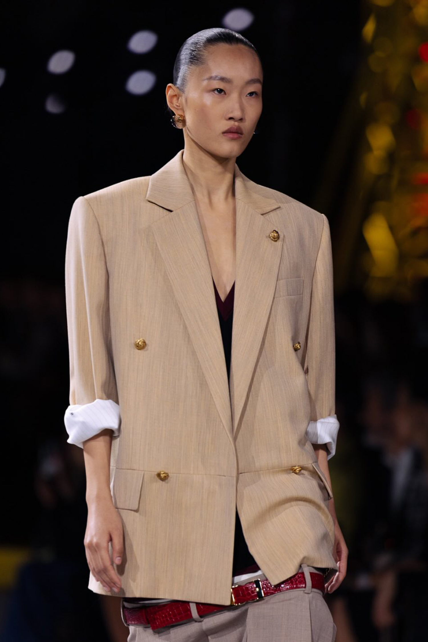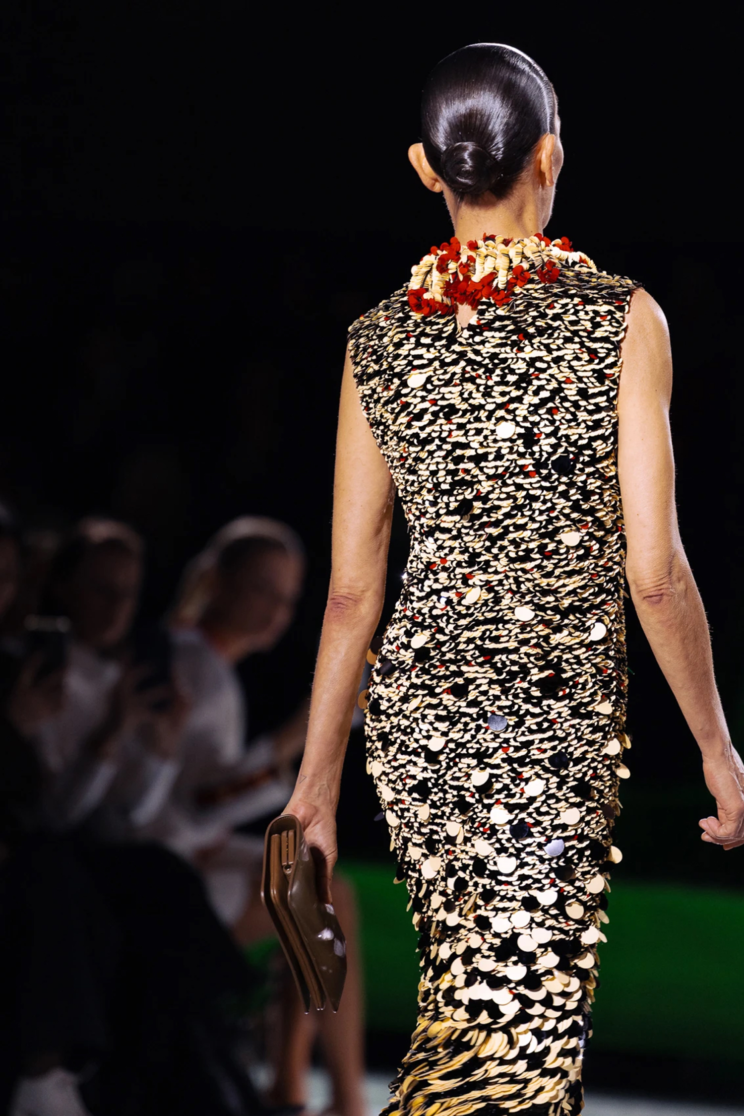 模特兒 Stephanie Cavalli 身著一件飾有金色鈕扣的黑色拉鍊針織衫作為開場,接續登場的工裝襯衫、飛行夾克、垂墜連身裙、袖子隨性捲起的寬肩西裝,以及換上針織布料重新演繹的經典套裝,Matthieu Blazy 用這些實穿的簡約日裝為起點,也作為「毛毛蟲」的比喻。