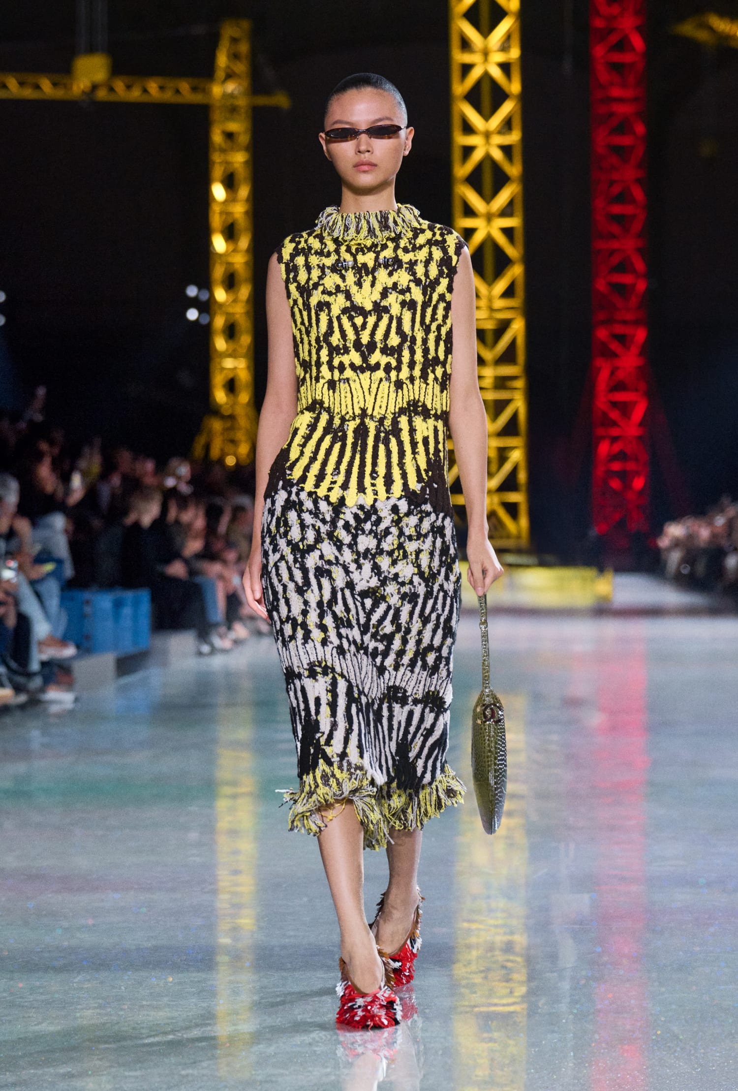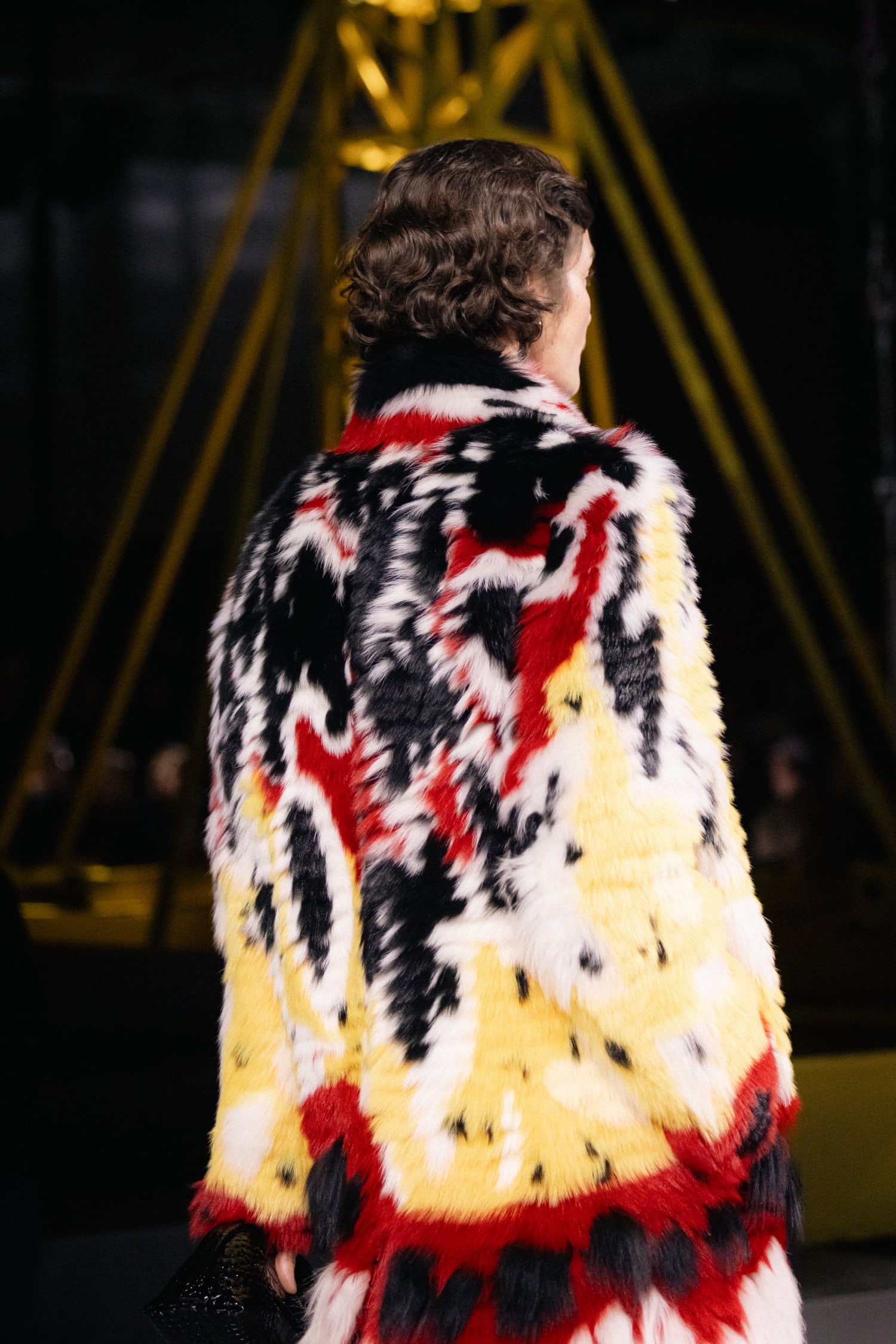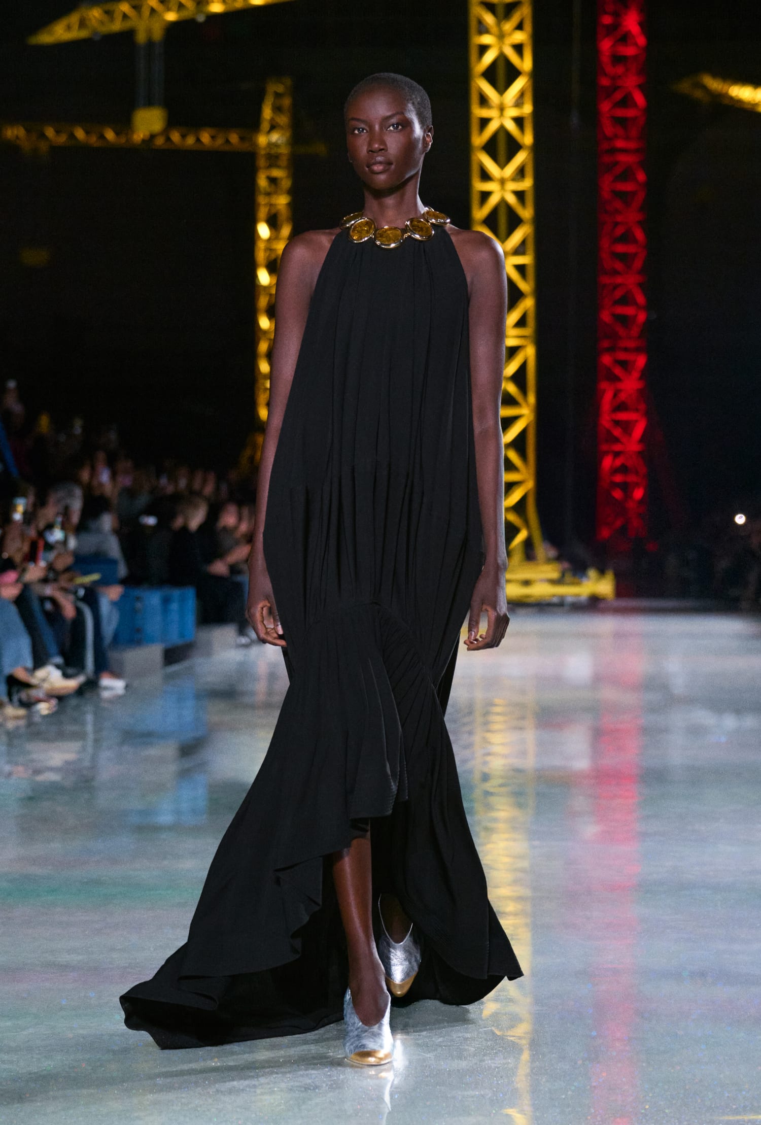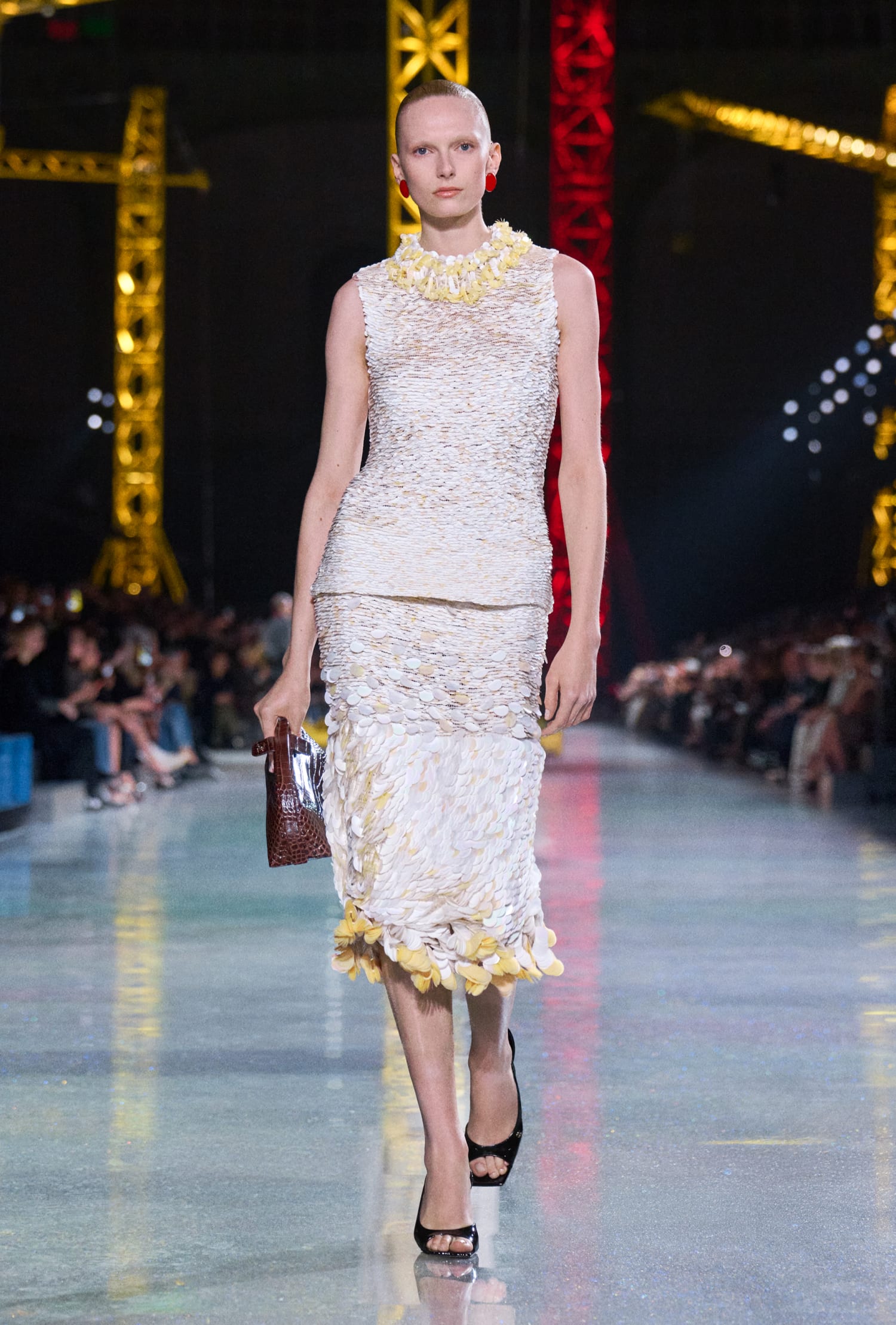 模特兒 Stephanie Cavalli 身著一件飾有金色鈕扣的黑色拉鍊針織衫作為開場,接續登場的工裝襯衫、飛行夾克、垂墜連身裙、袖子隨性捲起的寬肩西裝,以及換上針織布料重新演繹的經典套裝,Matthieu Blazy 用這些實穿的簡約日裝為起點,也作為「毛毛蟲」的比喻。
