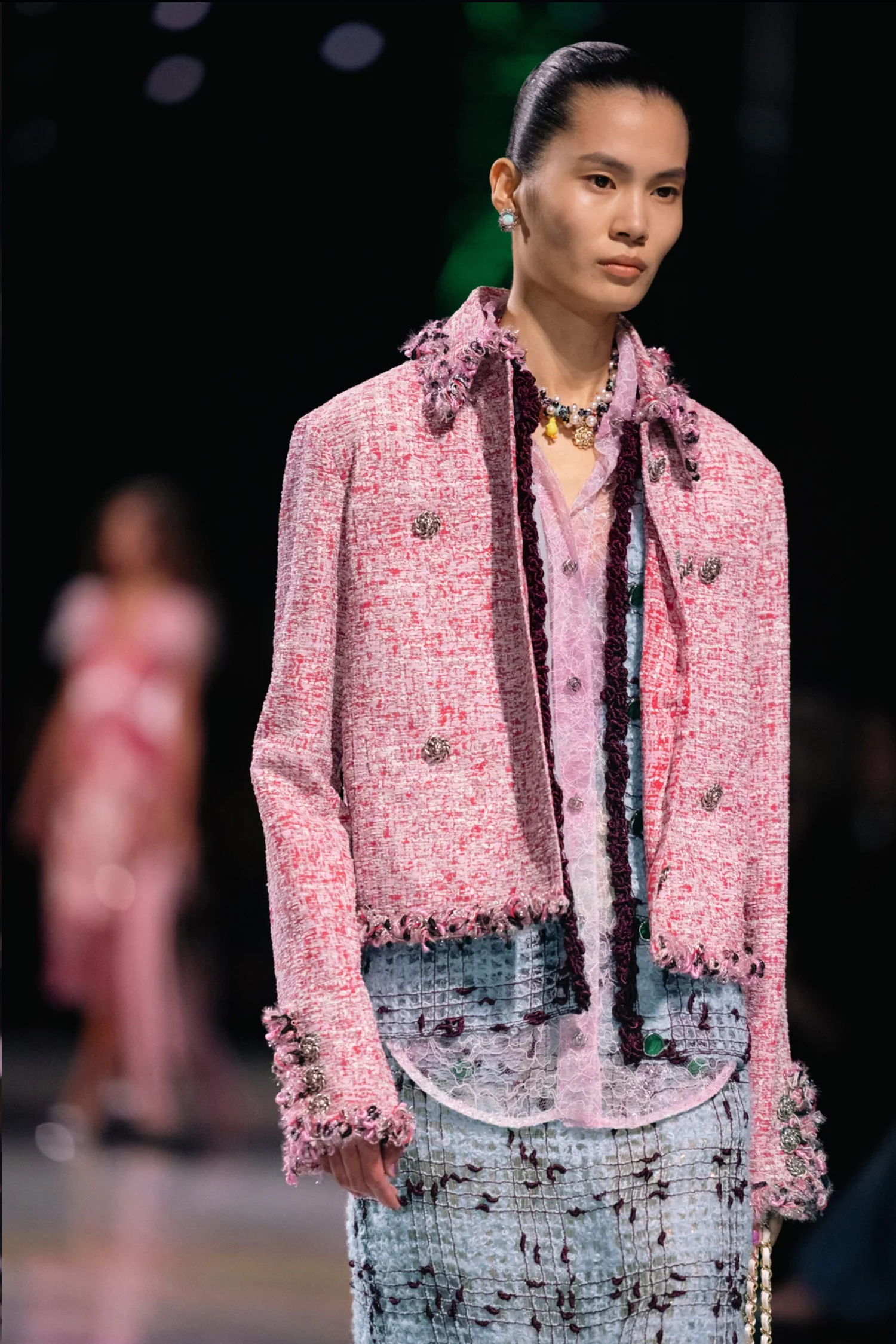 從 1920、1930 年代流轉至 1950、1960 年代,最後回到現代,Matthieu Blazy 透過服裝造型的層次,演繹不同年代的風格,而這段時光旅程的核心,正是 CHANEL 經典套裝。