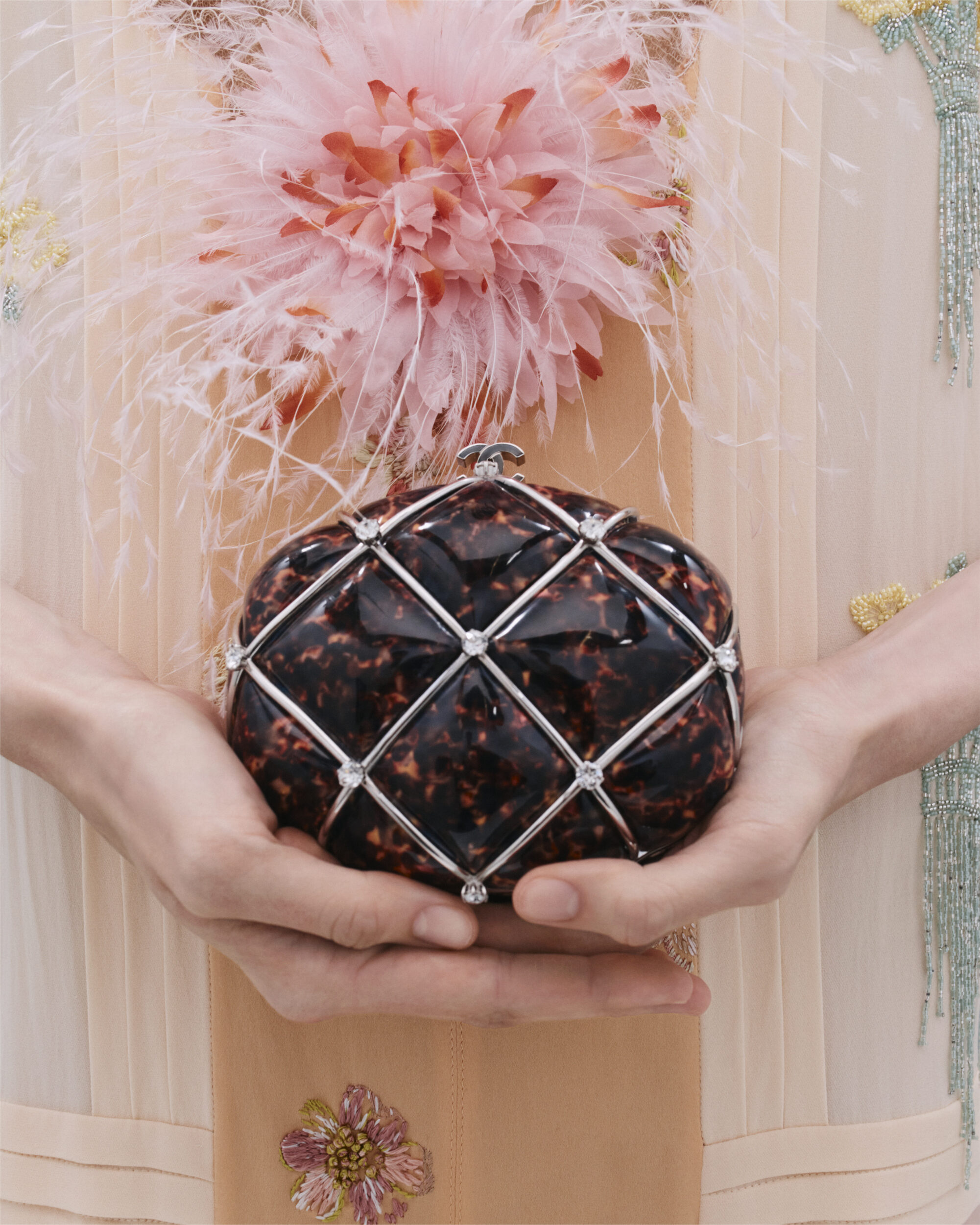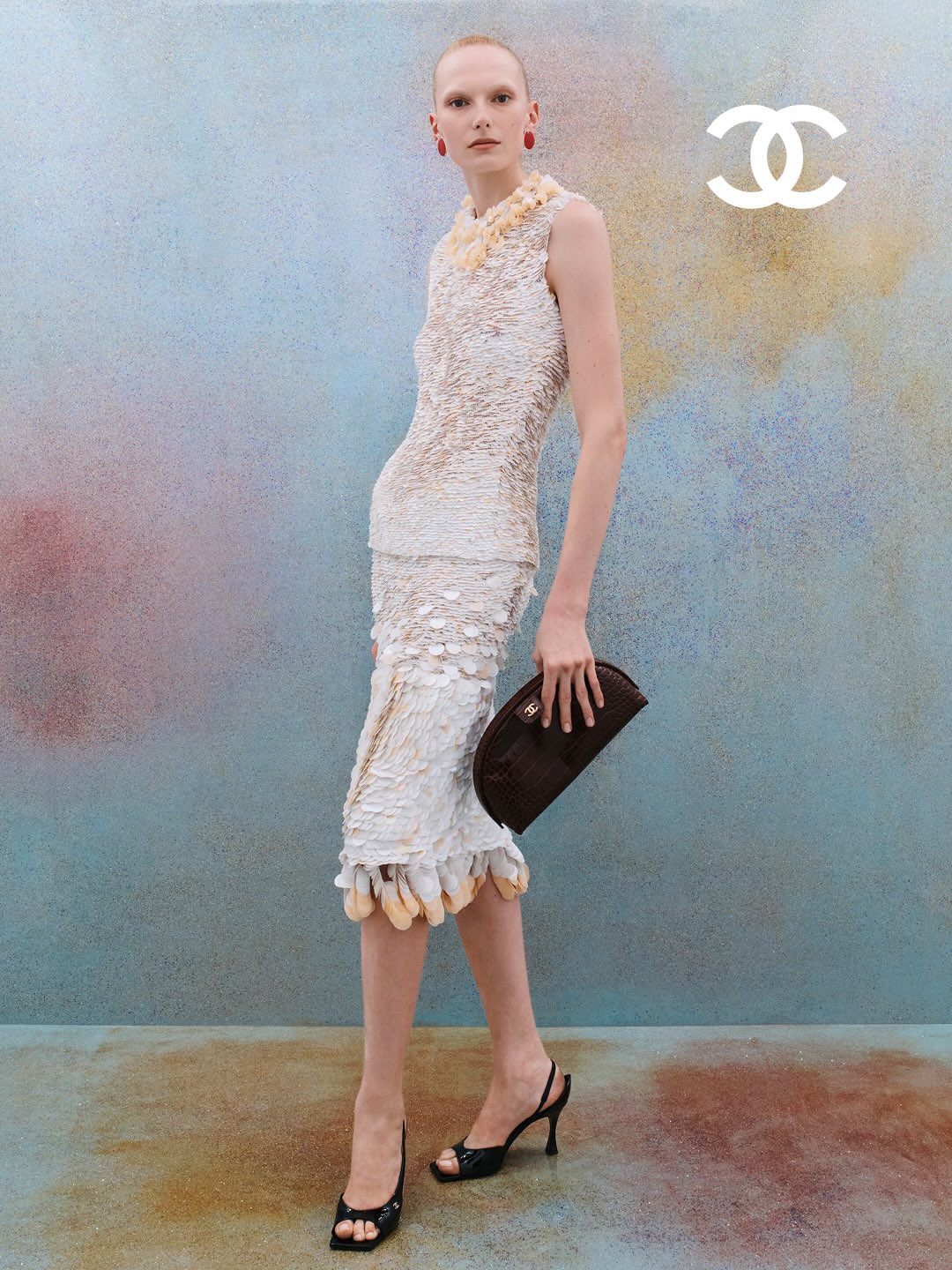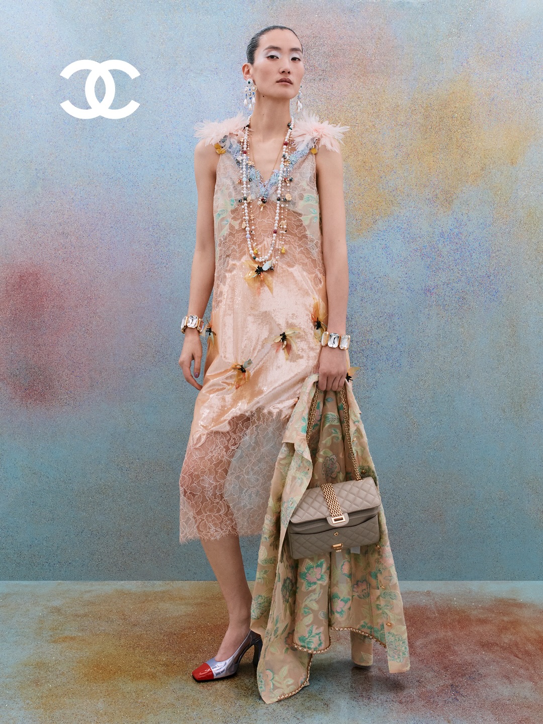 彩色皮草與珍珠母貝亮片裙裝帶來強烈的視覺衝擊,金屬網眼裙及虹彩光澤布料在燈光下閃耀,還有絲質針織與珠飾則為造型賦予流動感…,加上蛋白石色珠寶組合、琺瑯與樹脂飾品、粉彩色調的橫飾靴履、石榴晚宴包,以及結合 2.55 與 Classic Flap 的包款等配飾點綴,不僅為整個系列更添夢幻氛圍,也再次展現 CHANEL 工坊的卓越技藝。