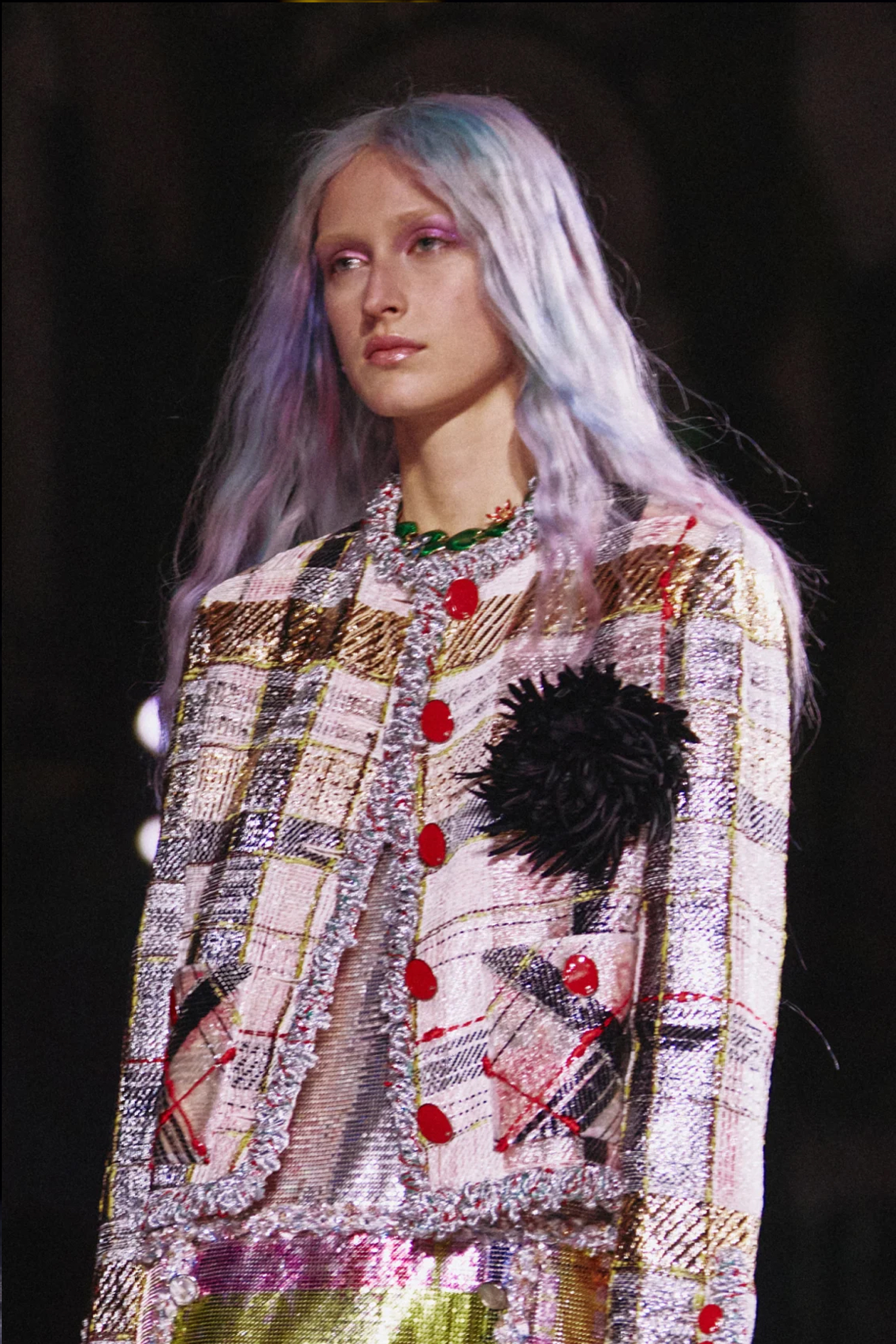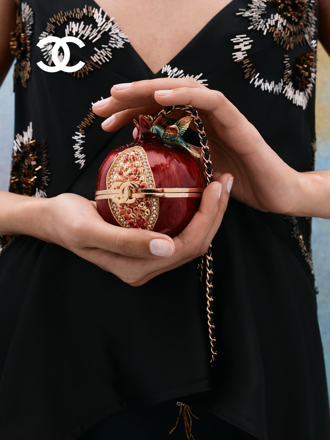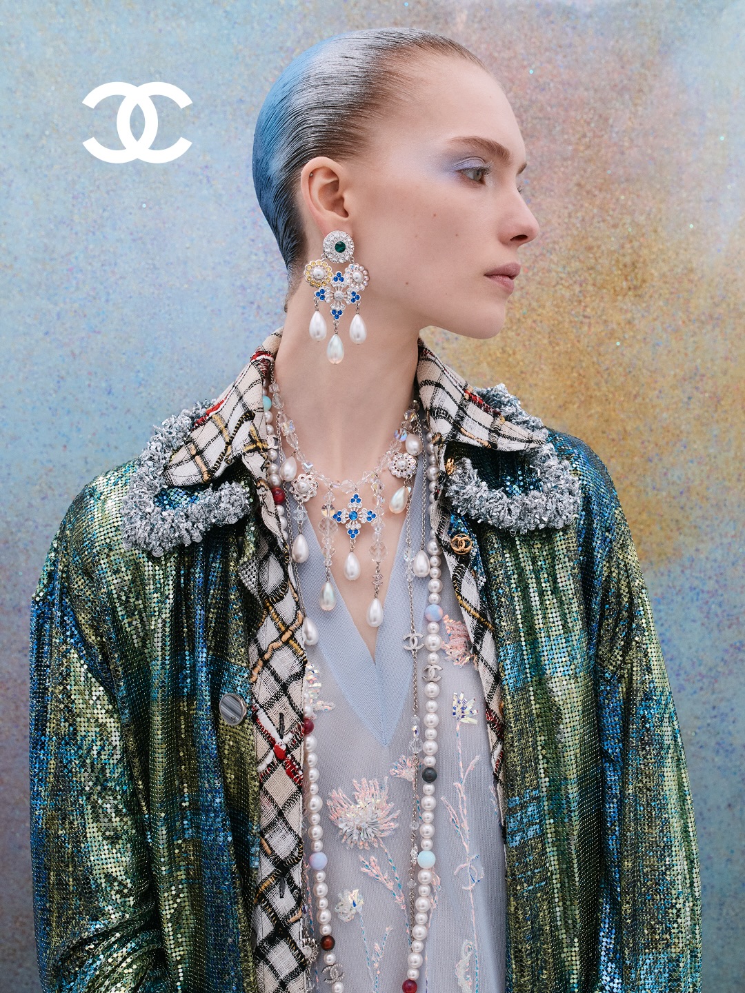 彩色皮草與珍珠母貝亮片裙裝帶來強烈的視覺衝擊,金屬網眼裙及虹彩光澤布料在燈光下閃耀,還有絲質針織與珠飾則為造型賦予流動感…,加上蛋白石色珠寶組合、琺瑯與樹脂飾品、粉彩色調的橫飾靴履、石榴晚宴包,以及結合 2.55 與 Classic Flap 的包款等配飾點綴,不僅為整個系列更添夢幻氛圍,也再次展現 CHANEL 工坊的卓越技藝。