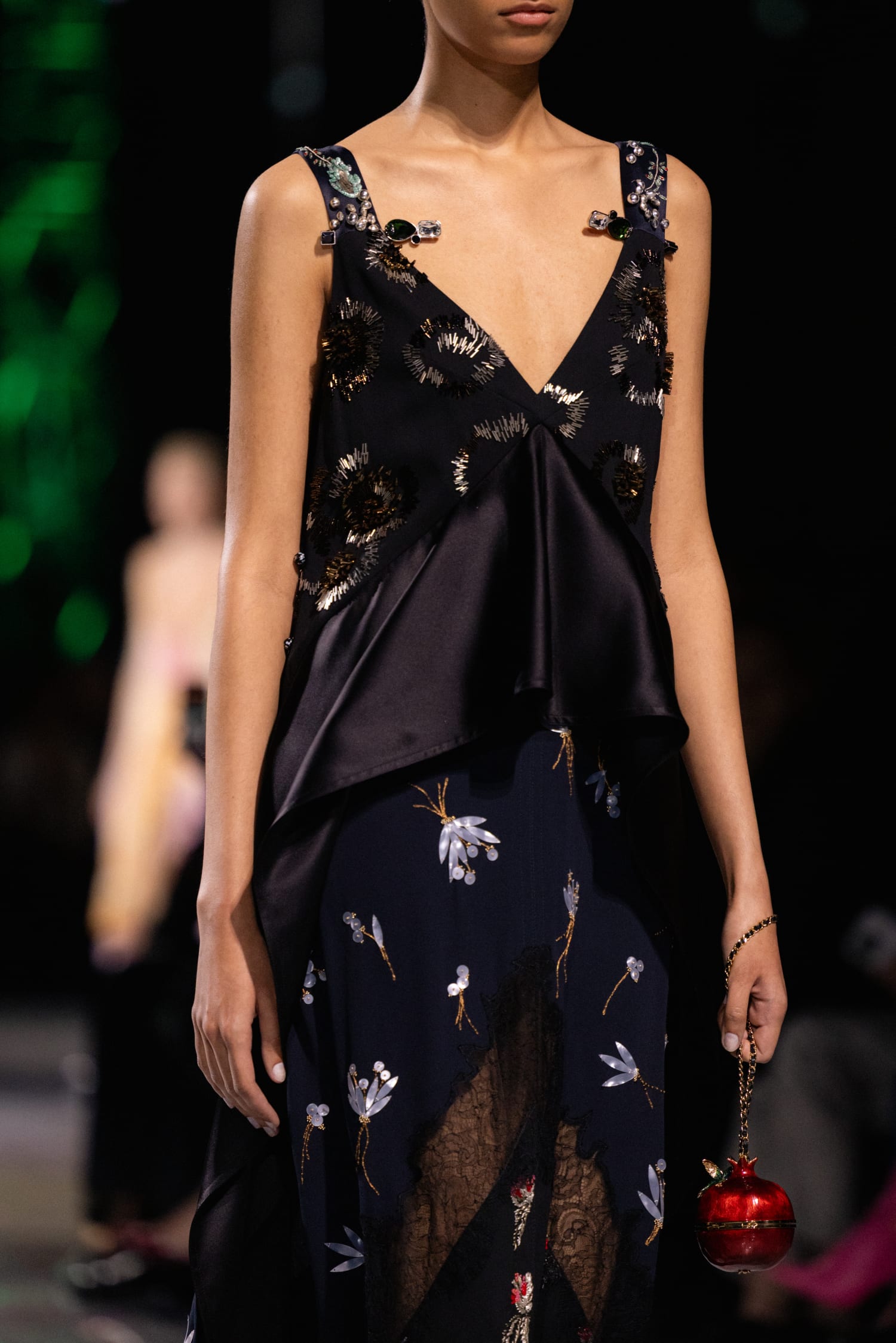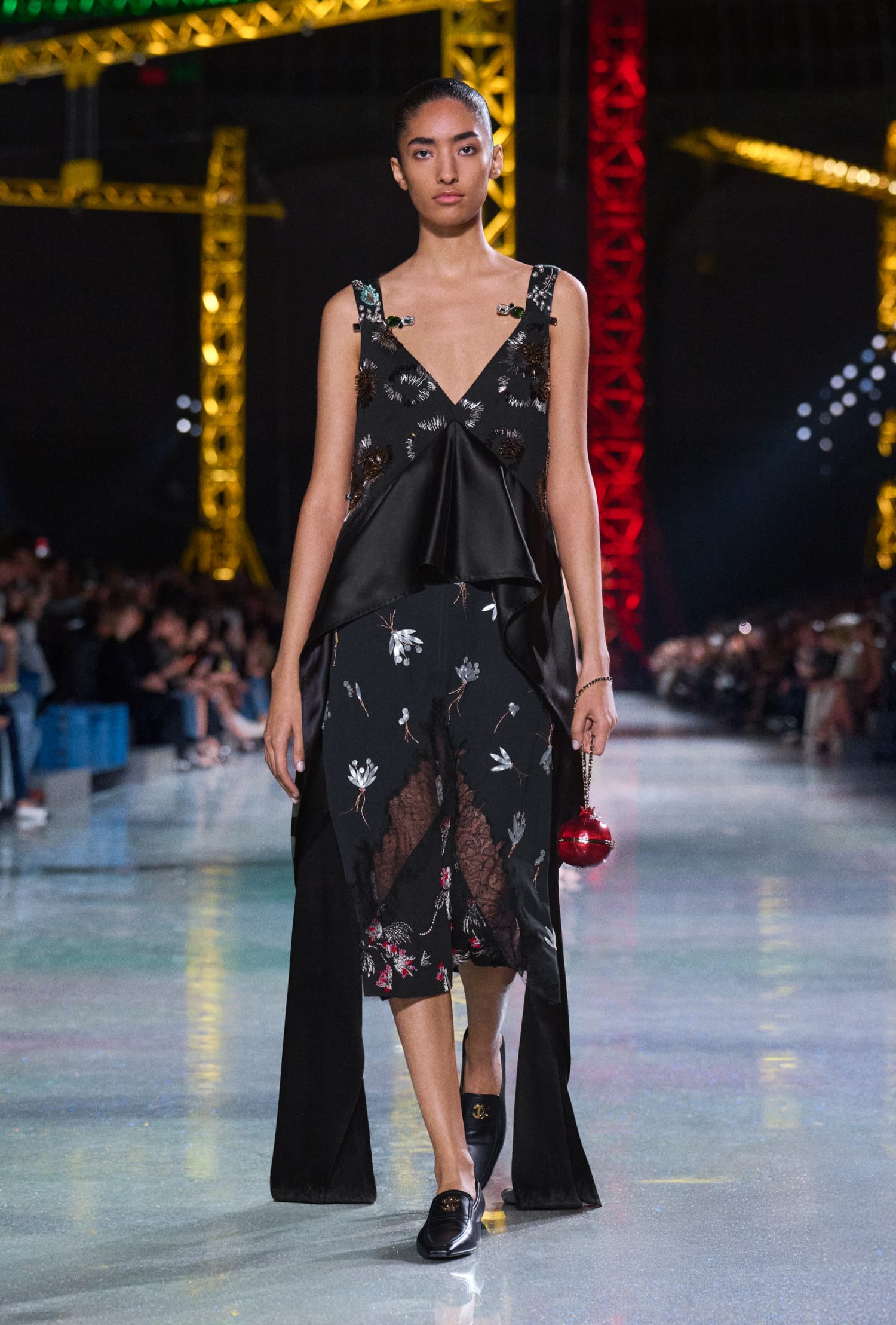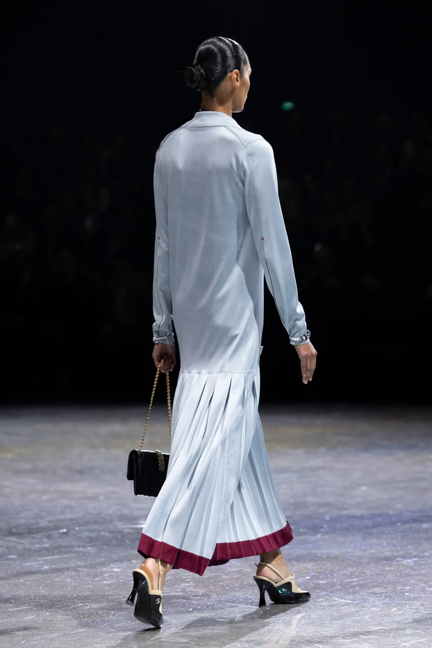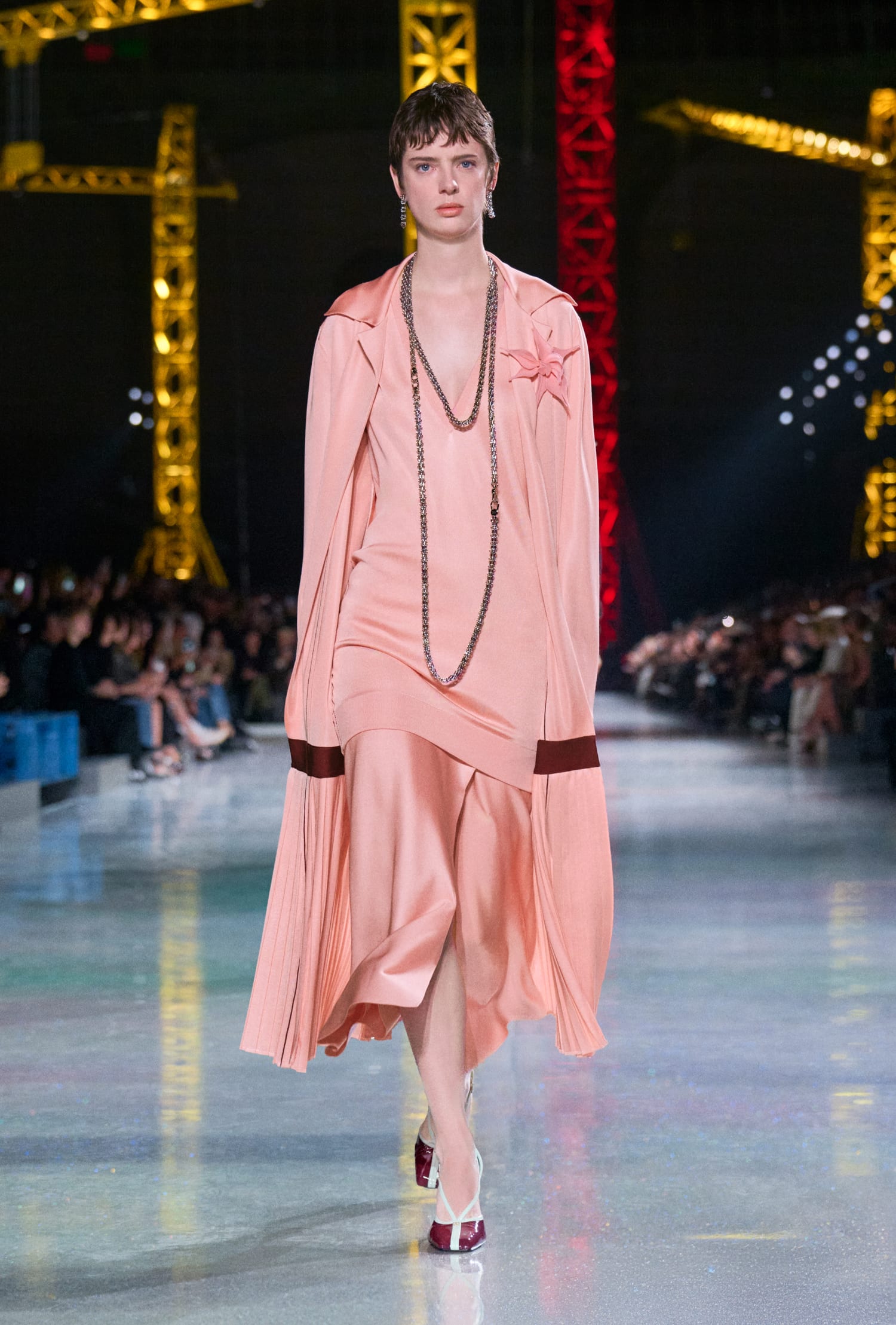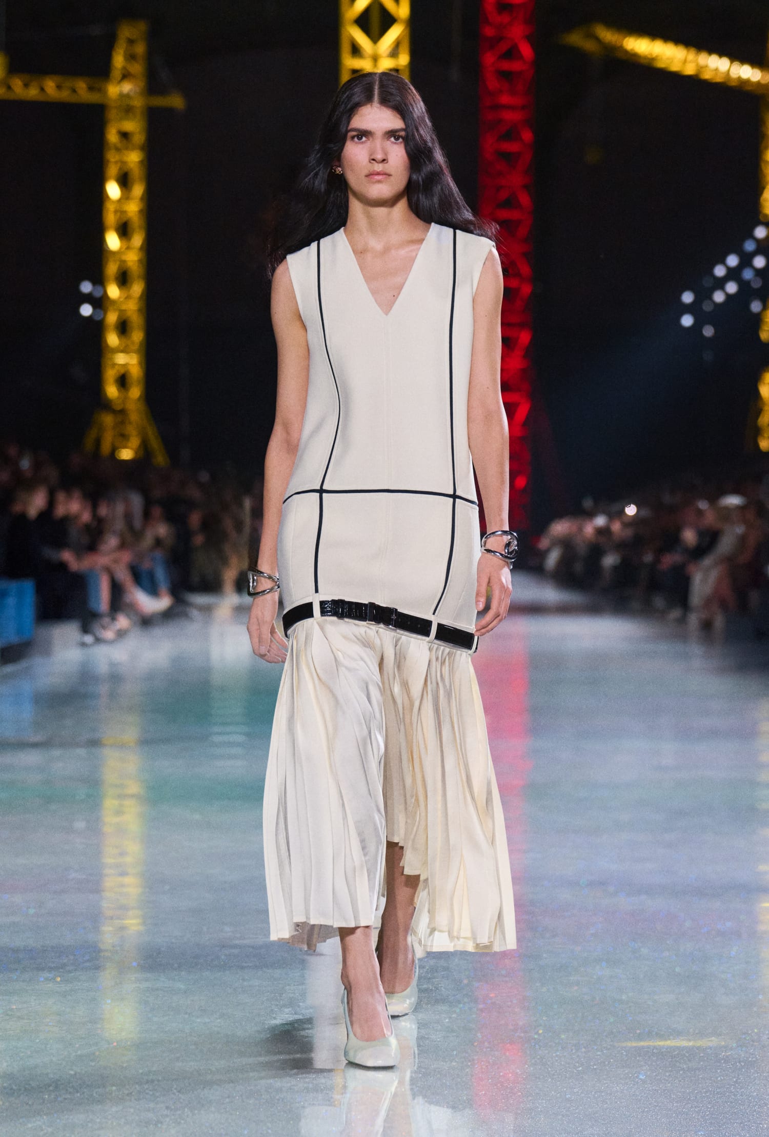 20 年代 Flapper 女郎的低腰輪廓反覆出現,Matthieu Blazy 用一條皮帶讓腰身下沉至胯骨下方,用拉長的比例讓整個身體線條更鬆、更自然,走起路來優雅又隨性。而這一思路也同樣出現在其他造型中,低腰洋裝外搭俐落西裝,緞面洋裝在低腰處拼接百褶裙,還有將下擺長至大腿處的襯衫或針織上衣拉出來,藉以創造多層次…,Matthieu Blazy 將 Flapper 女郎的復古廓形重新放入現代衣櫥裡,也為造型搭配帶來新鮮感。