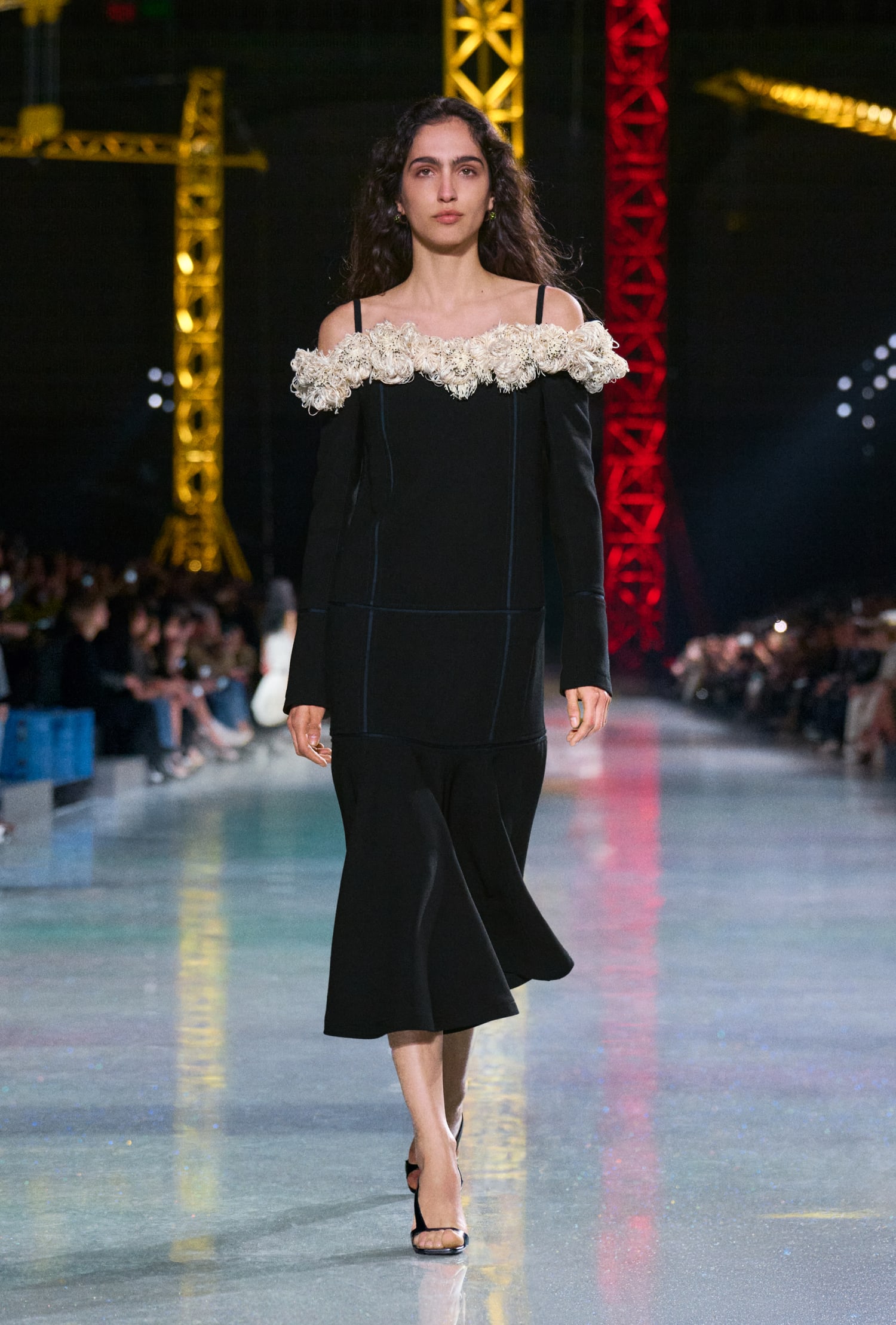 一套小黑裙為系列完美收尾,正面看來是素面針織洋裝,待模特兒轉過身後,才發現肩胛骨中間懸掛了一朵山茶花——優雅與奔放並存在同一件服裝上,這正是 CHANEL 的「悖論」,也是 Matthieu Blazy 為女性所塑造的豐富形象。