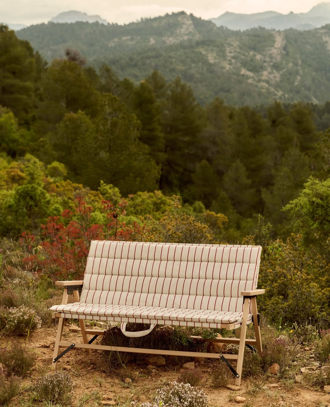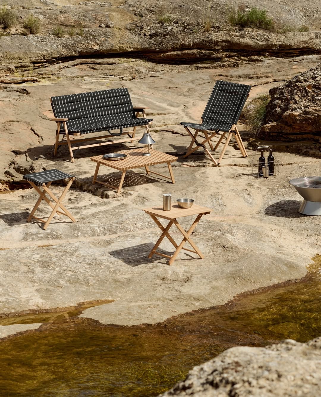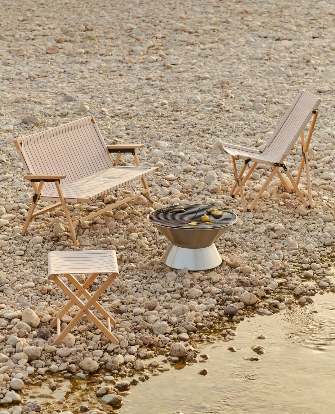 系列中包含輕量櫸木摺疊家具、不鏽鋼營火架與燒烤爐等單品,其中,家具與配飾上的條紋織物靈感來自 Basque Country 的傳統圖案,並以 100% 回收聚酯纖維編織而成,在設計感與永續理念之間取得平衡。