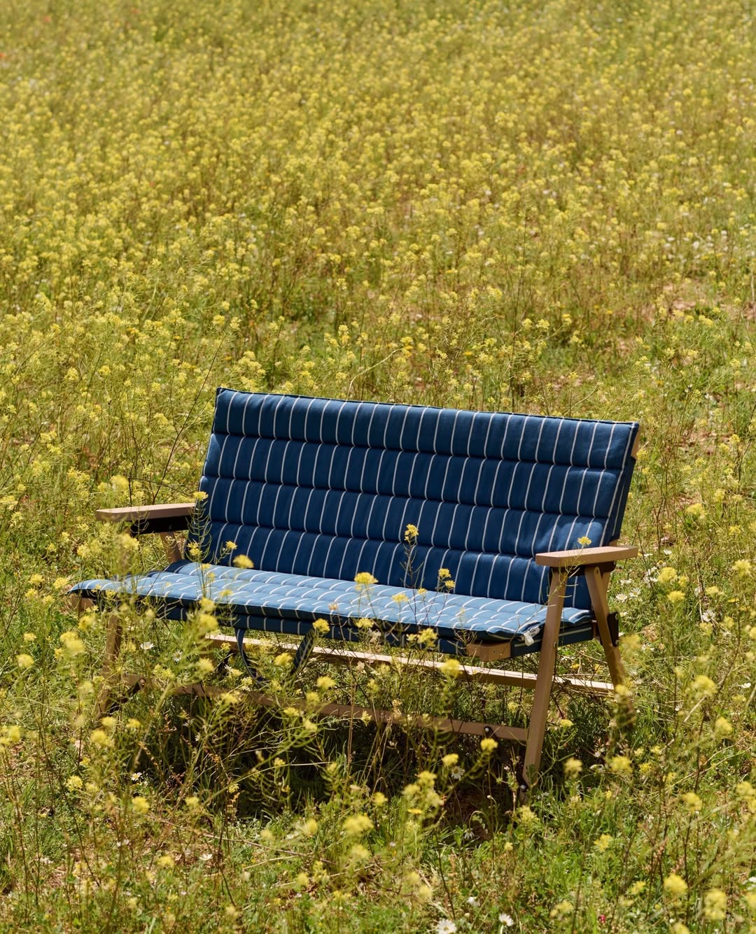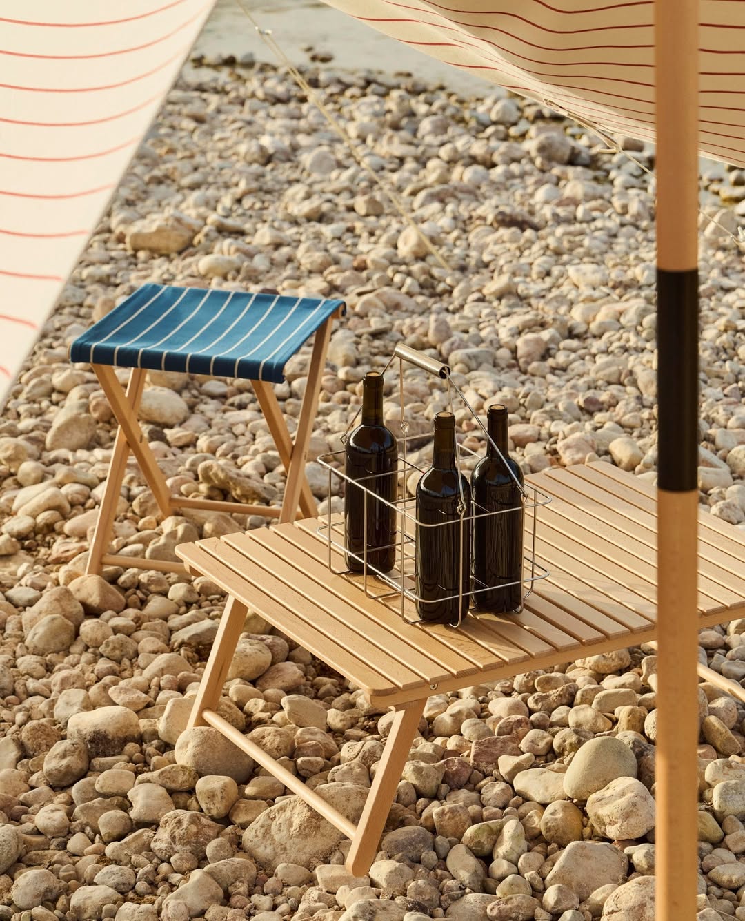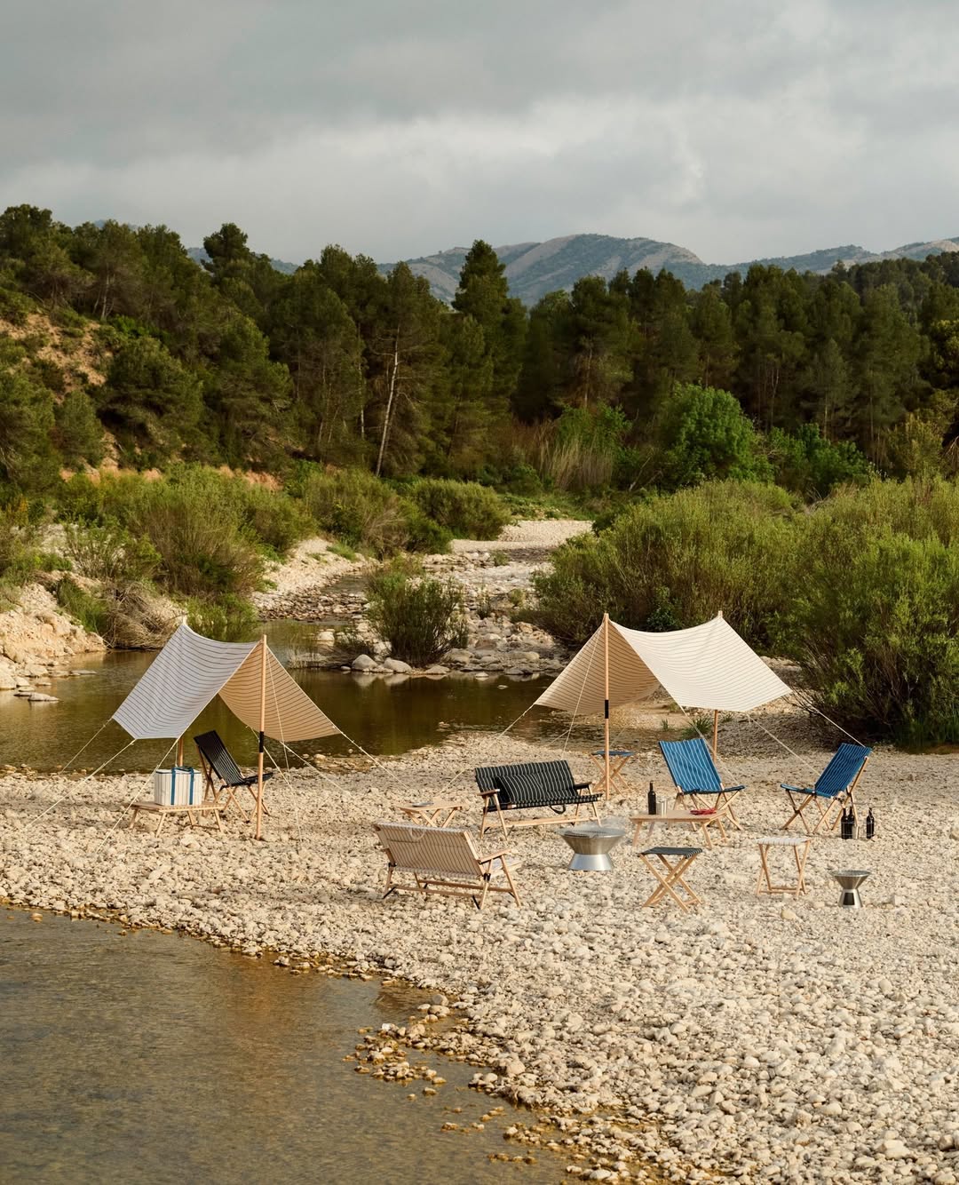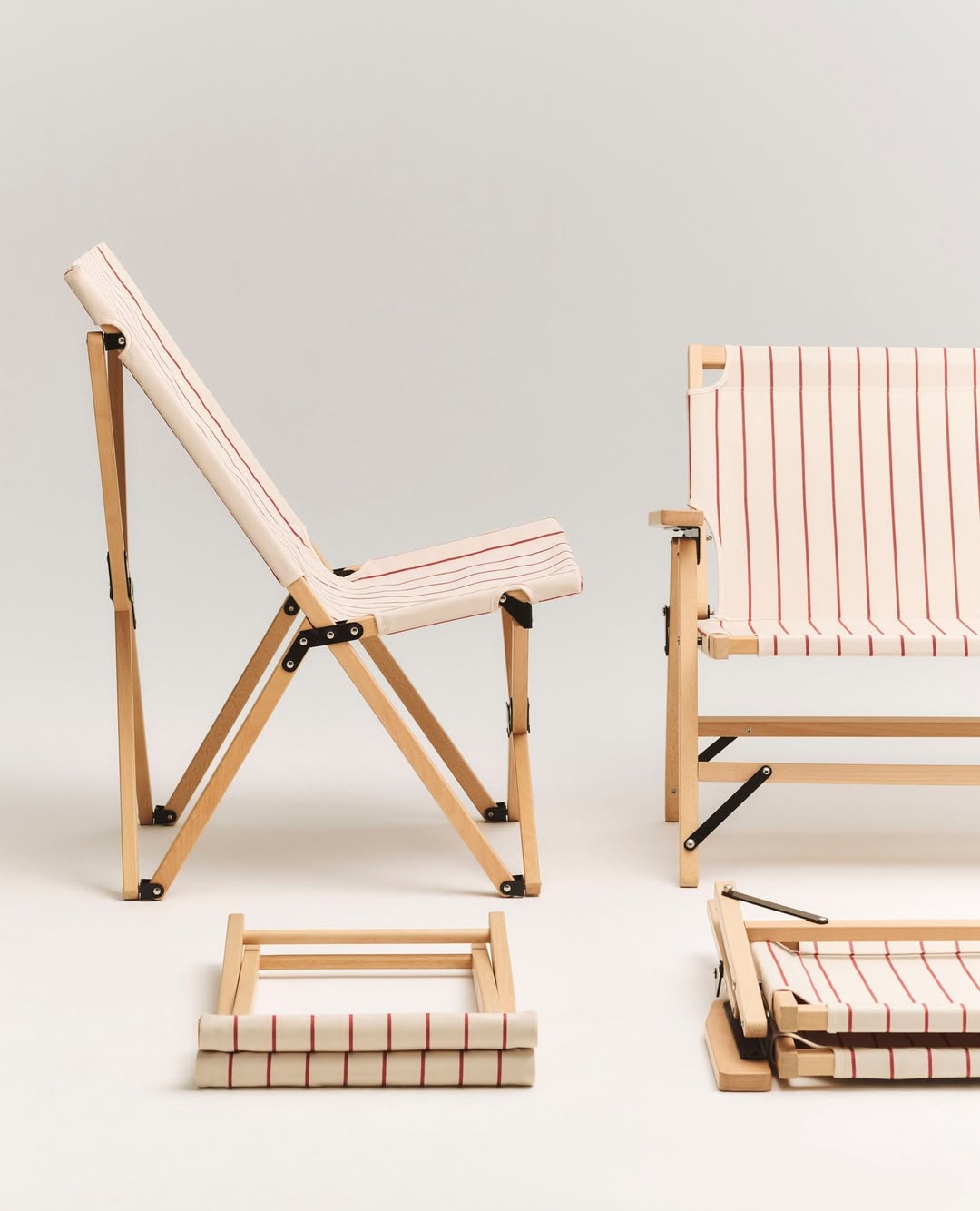 系列中包含輕量櫸木摺疊家具、不鏽鋼營火架與燒烤爐等單品,其中,家具與配飾上的條紋織物靈感來自 Basque Country 的傳統圖案,並以 100% 回收聚酯纖維編織而成,在設計感與永續理念之間取得平衡。