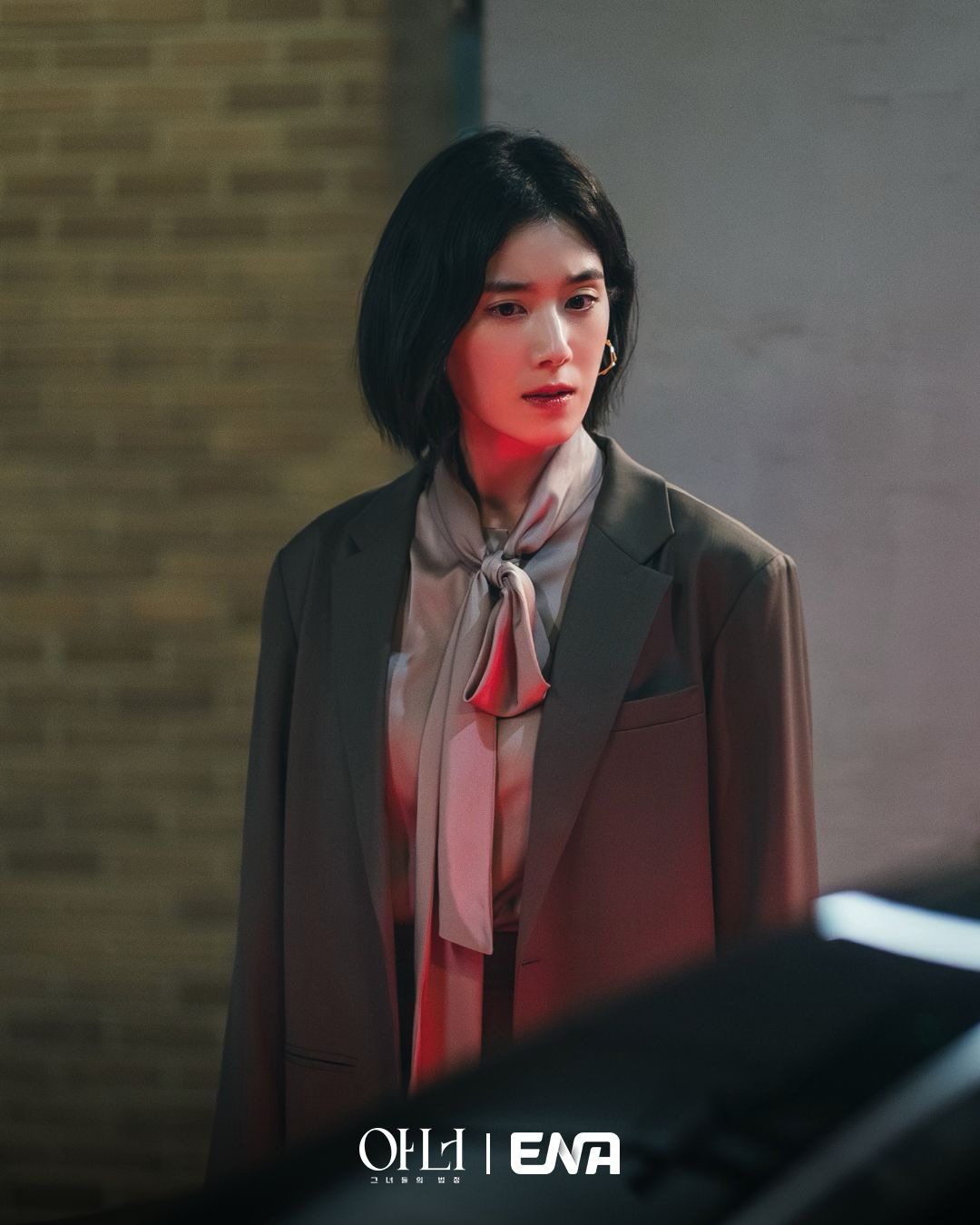 女主角尹羅映(李奈映 飾)是一位集外貌與口才於一身的明星律師,表面光鮮亮麗,卻背負著難以告人的過去,她的穿搭風格如同她的性格,幹練沉穩,整體以米白、棕色、黑白灰等中性色調為主軸,低調卻不失氣場,偶有亮色點綴,例如以綠色針織內搭搭配卡其色外套。單品選擇上,多為剪裁簡約俐落的基礎款,像是毛呢短洋裝外搭寬鬆西裝外套,既幹練又不失女人味。