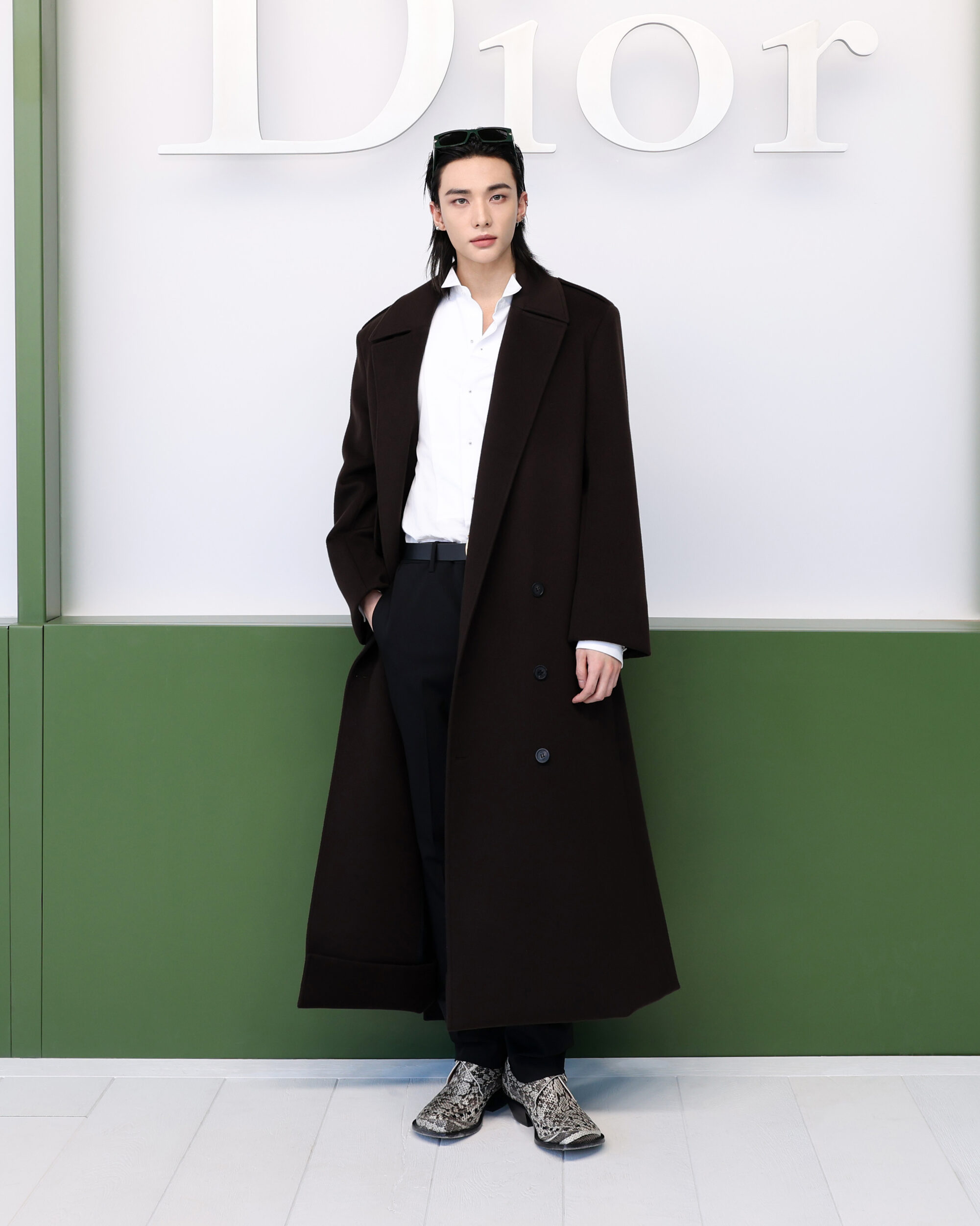 韓國男團 Stray Kids 成員 鉉辰(Hyunjin) 身穿黑色羊毛大衣內搭白襯衫與黑色長褲,搭配黑白拼色 D de Dior 德比鞋,俐落帥氣,有種不拘一格的灑脫氣息。