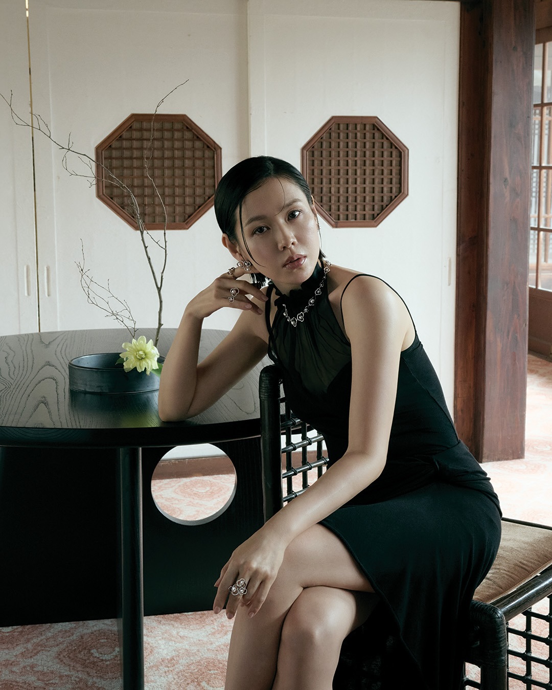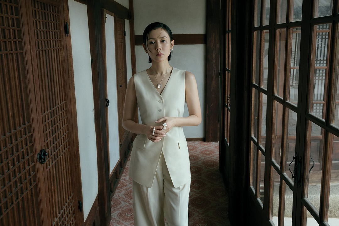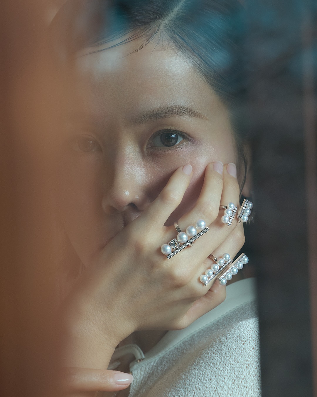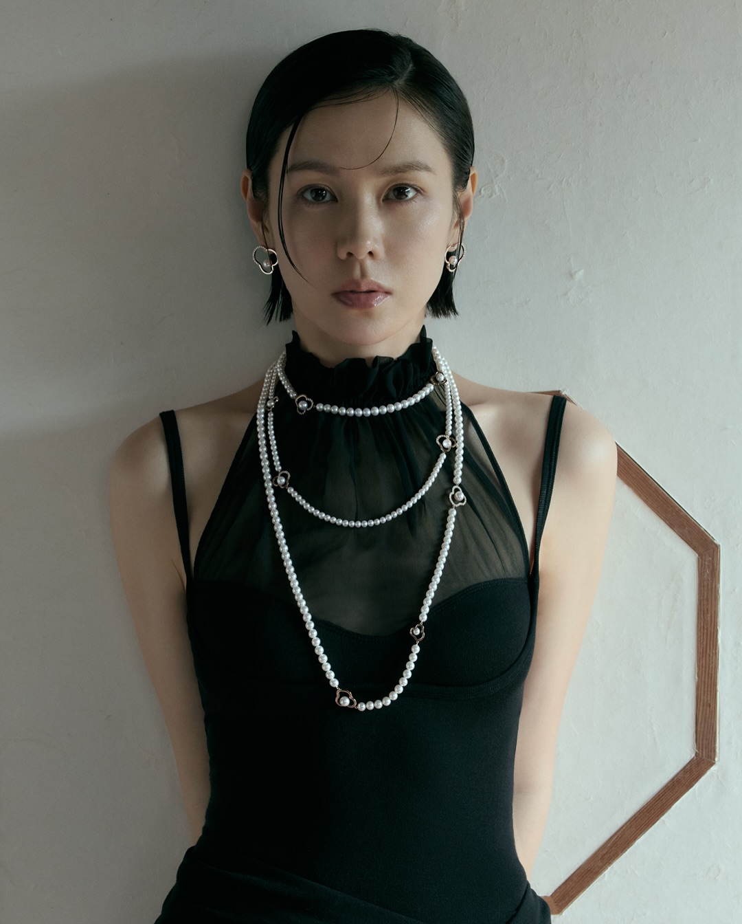 其中黑色高領禮服搭配的是 chants 系列,以音符般節奏排列的珍珠設計;而米色西裝背心為 balance build 系列,則透過幾何結構堆疊珍 珠,展現充滿建築感的美學設計。兩個系列皆透過極簡線條演繹珍珠的獨有光澤與美感,與鑽石完美交織,並在孫藝珍詮釋下,展現 TASAKI 獨樹一幟的品牌風格。