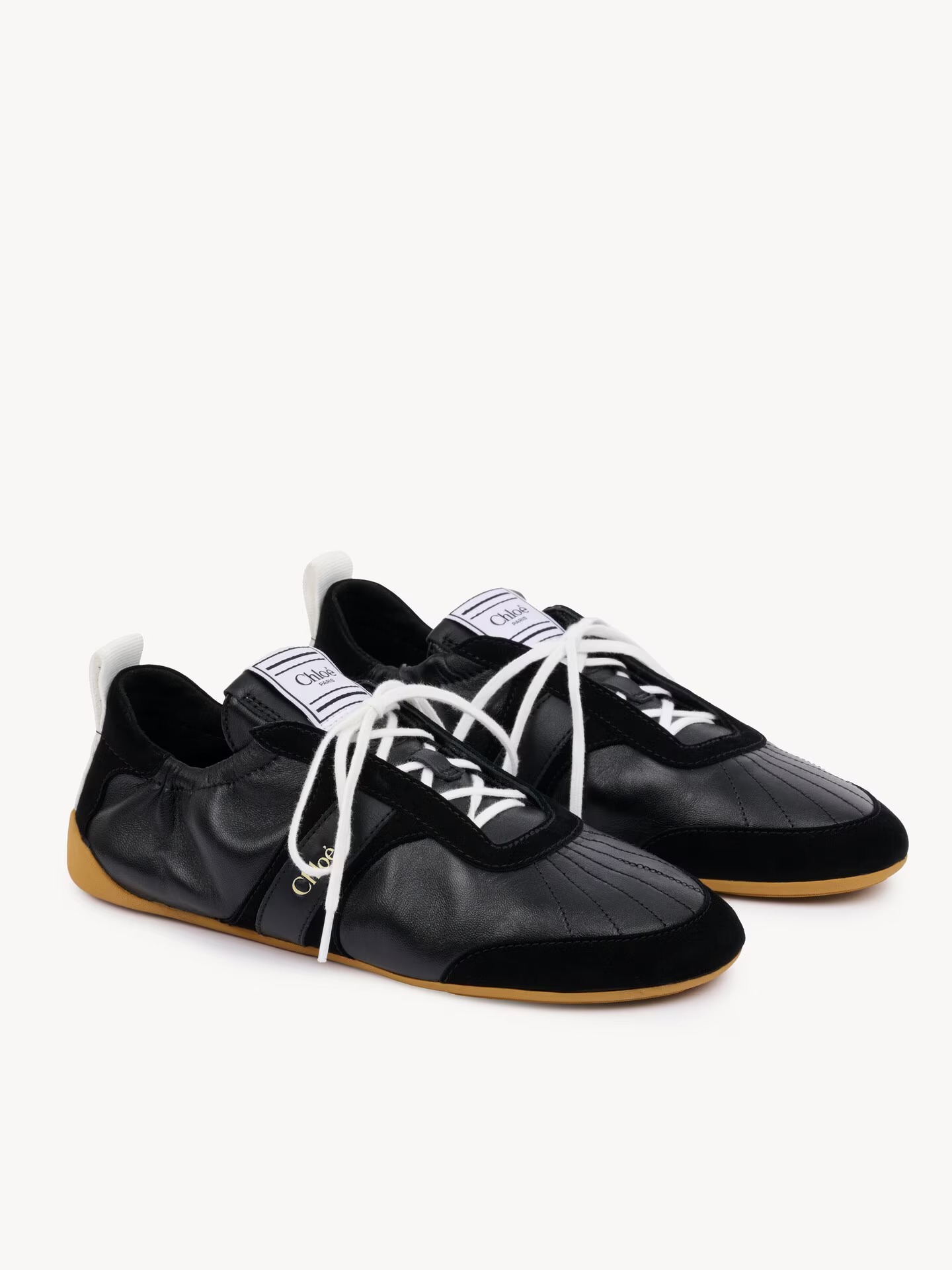 薄底鞋當道外,混血鞋也是好受歡迎,Chloé 這款運動鞋以芭蕾舞和拳擊為靈感,採用柔軟的羊皮與麂皮打造,呈現極致輕盈的輪廓,搭配再生橡膠鞋底,營造出薄底貼合感。鞋側與後跟拉環印有 Chloé 標誌,鞋舌則綴以拳擊風格的 Chloé 標籤,休閒率性又不失優雅,簡單搭個牛仔褲就很好看。