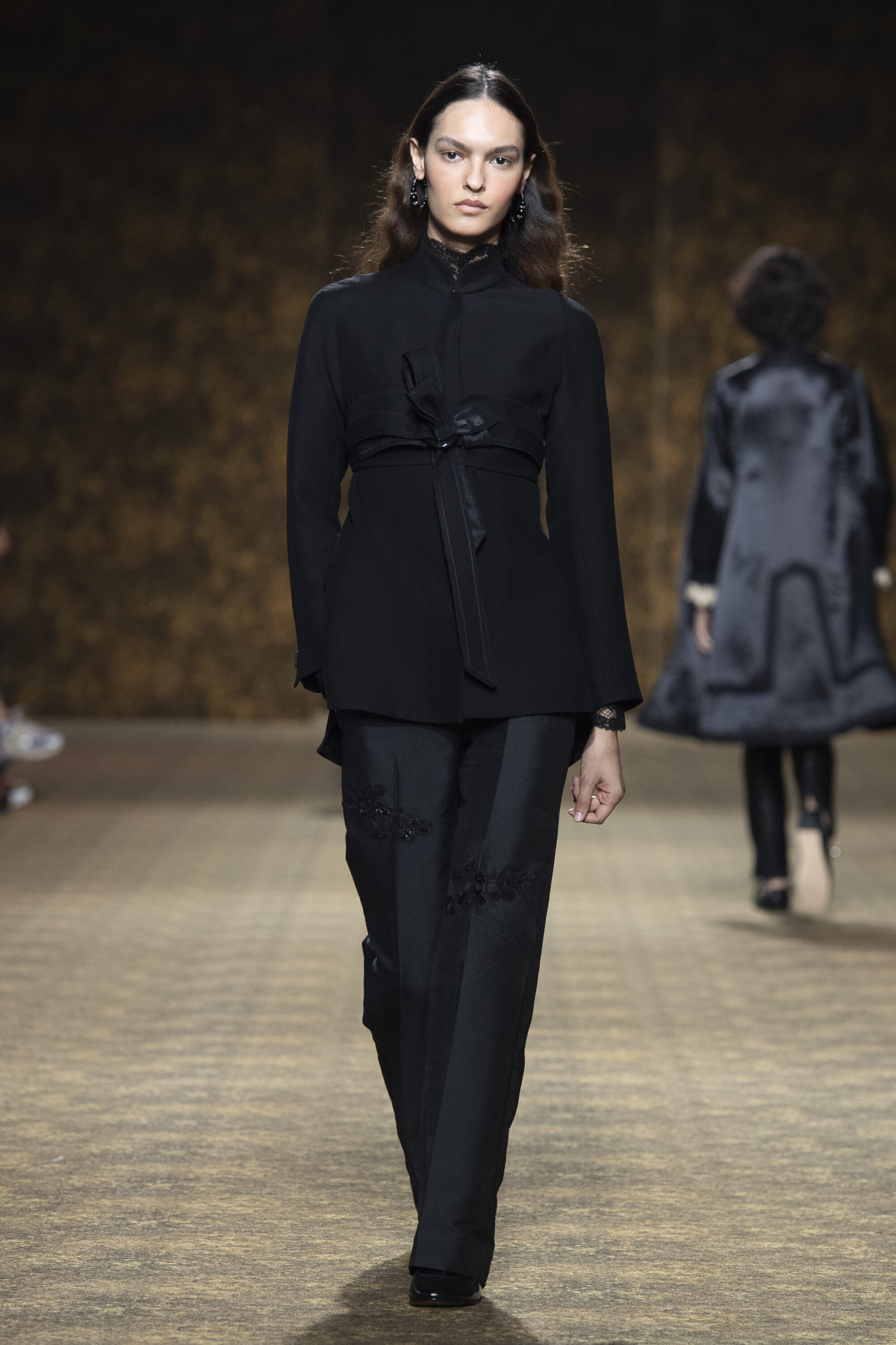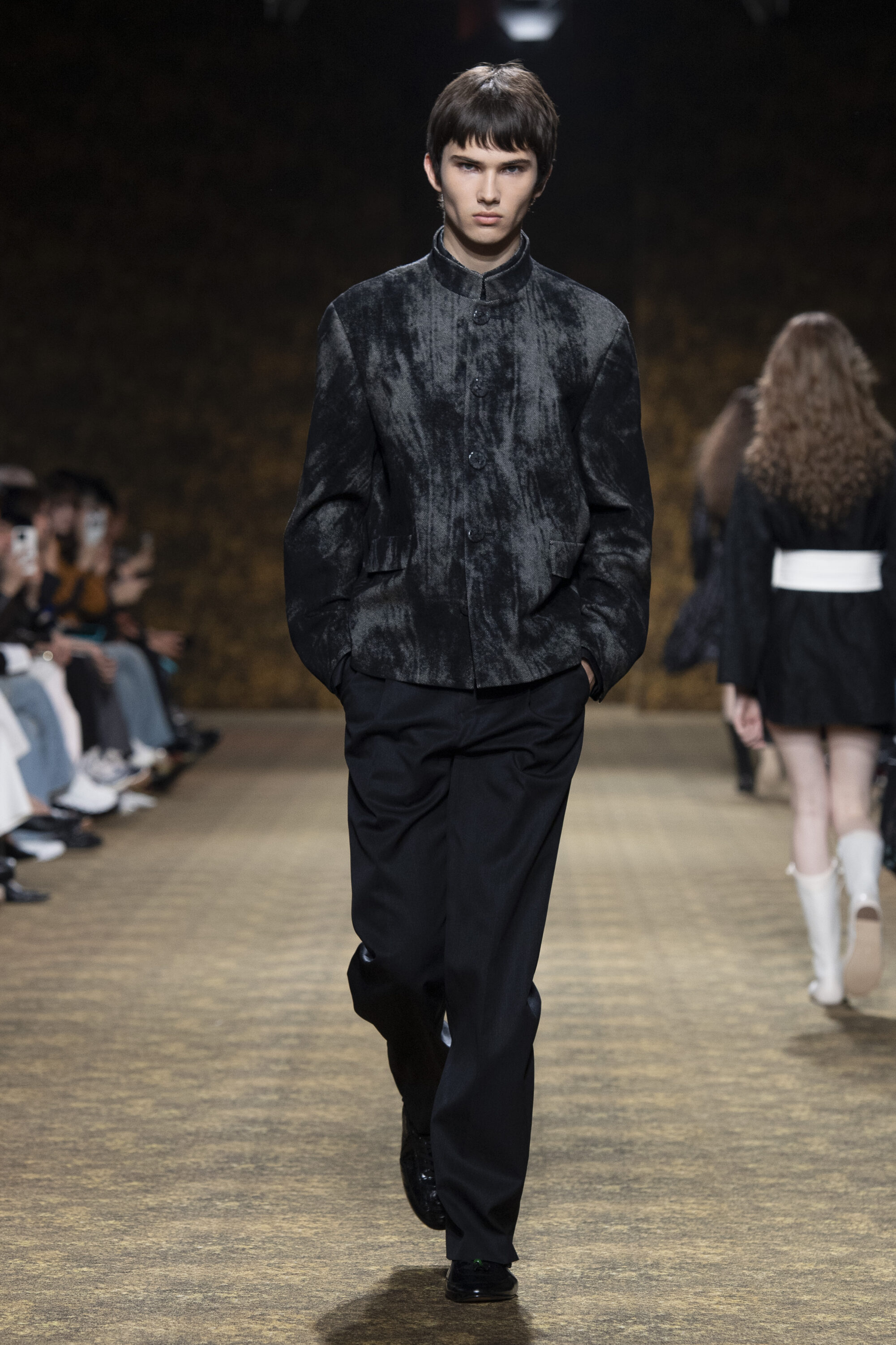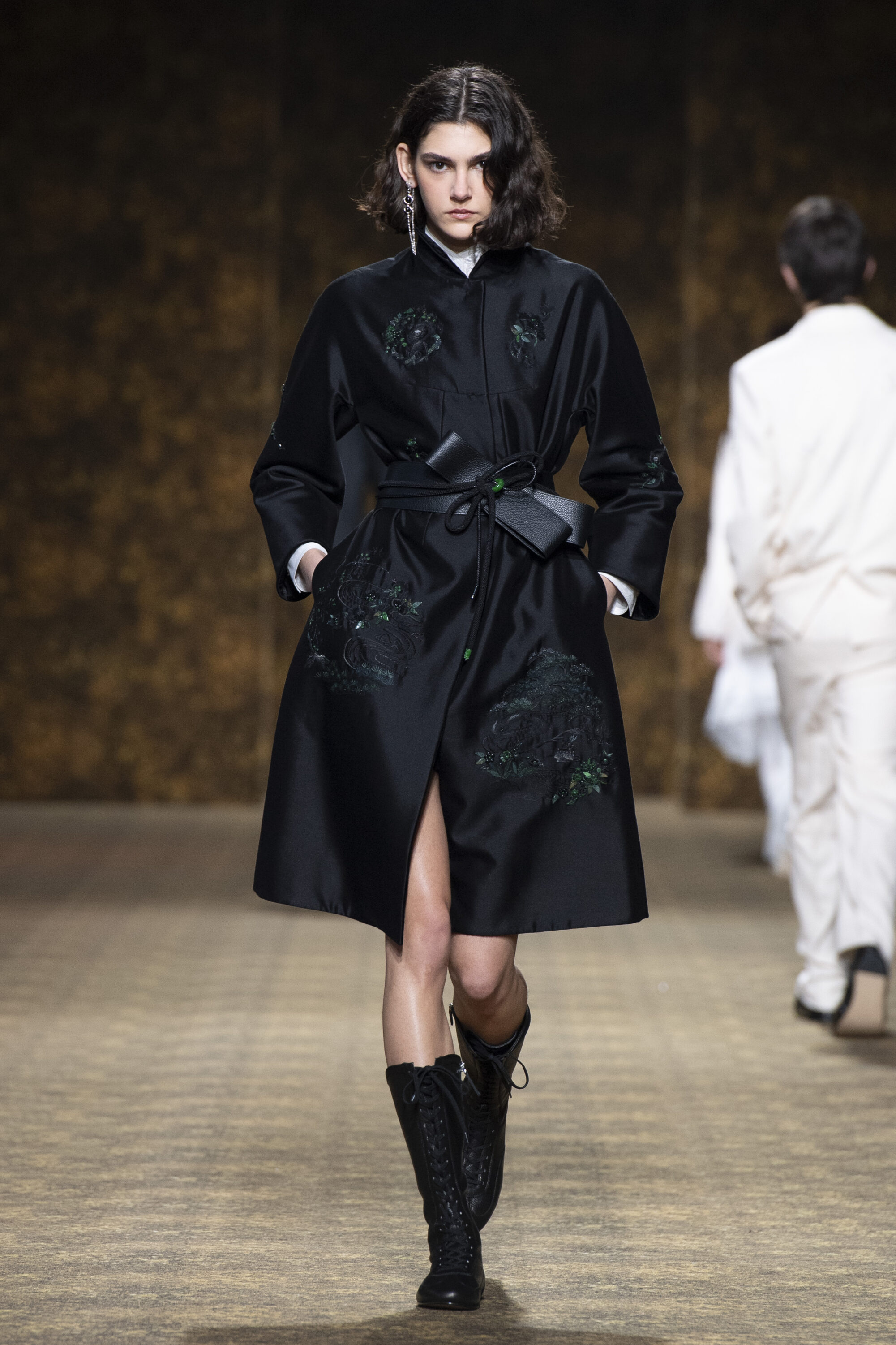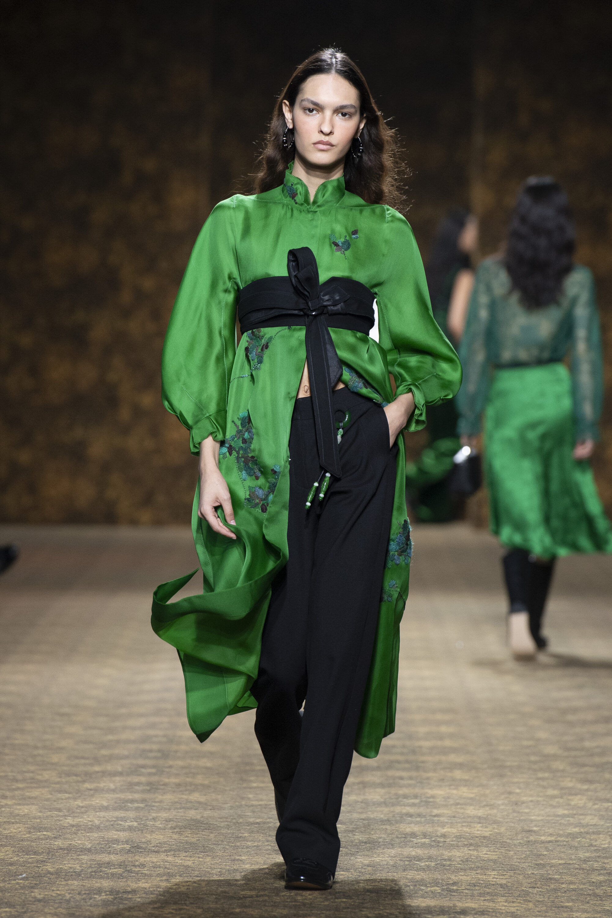 男裝延續盛世的飽和能量,透過陰刻刺繡與仿舊處理讓時間在布料留下痕跡。其中西裝外繫腰封、方形連袖與中式鑲邊口袋,構築剛勁而內斂的細節,細小玉石裝飾與毛料點綴領口袖口,營造如壁畫般的質地,在歷史感與當代剪裁間取得精準平衡。
