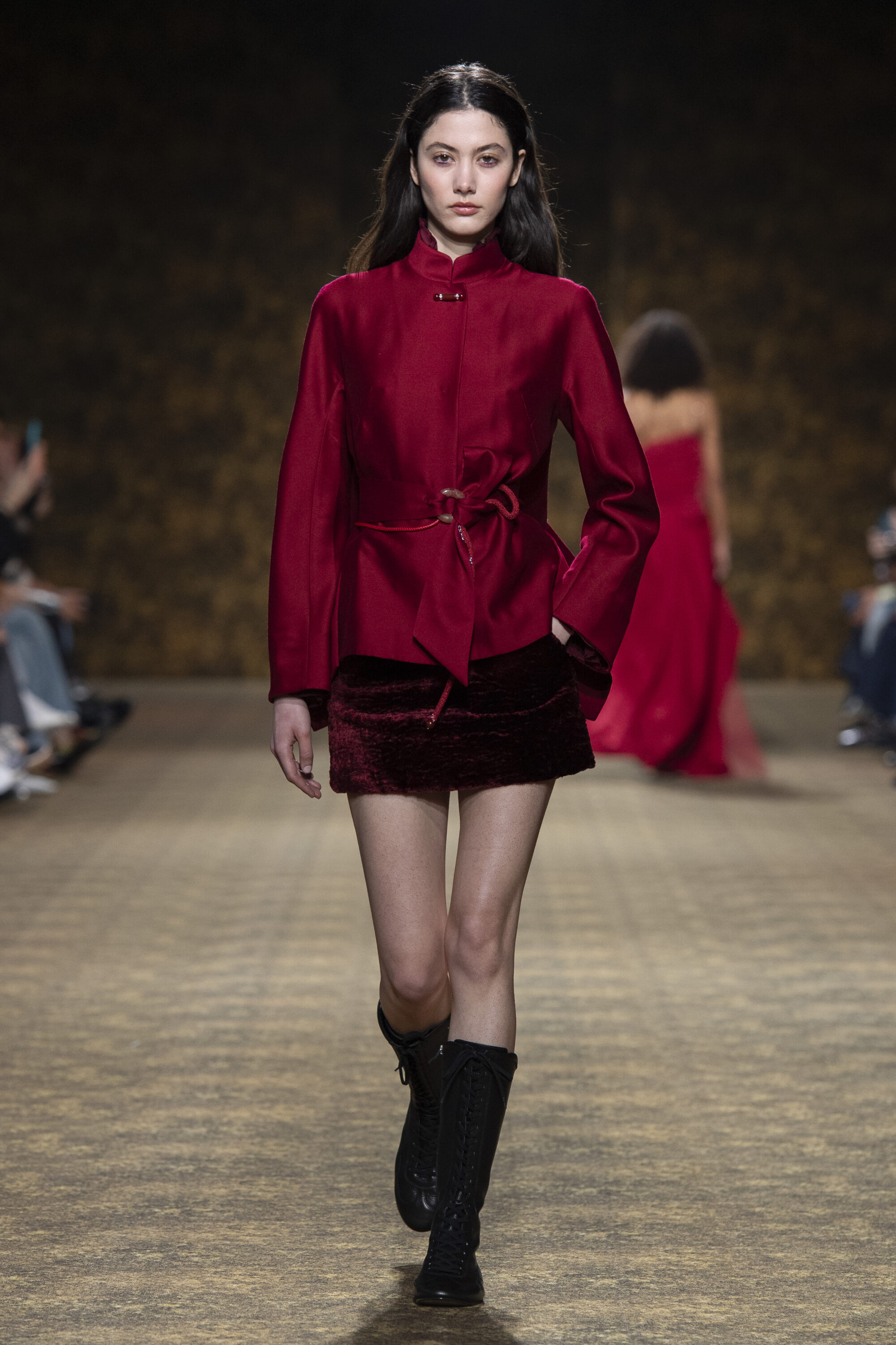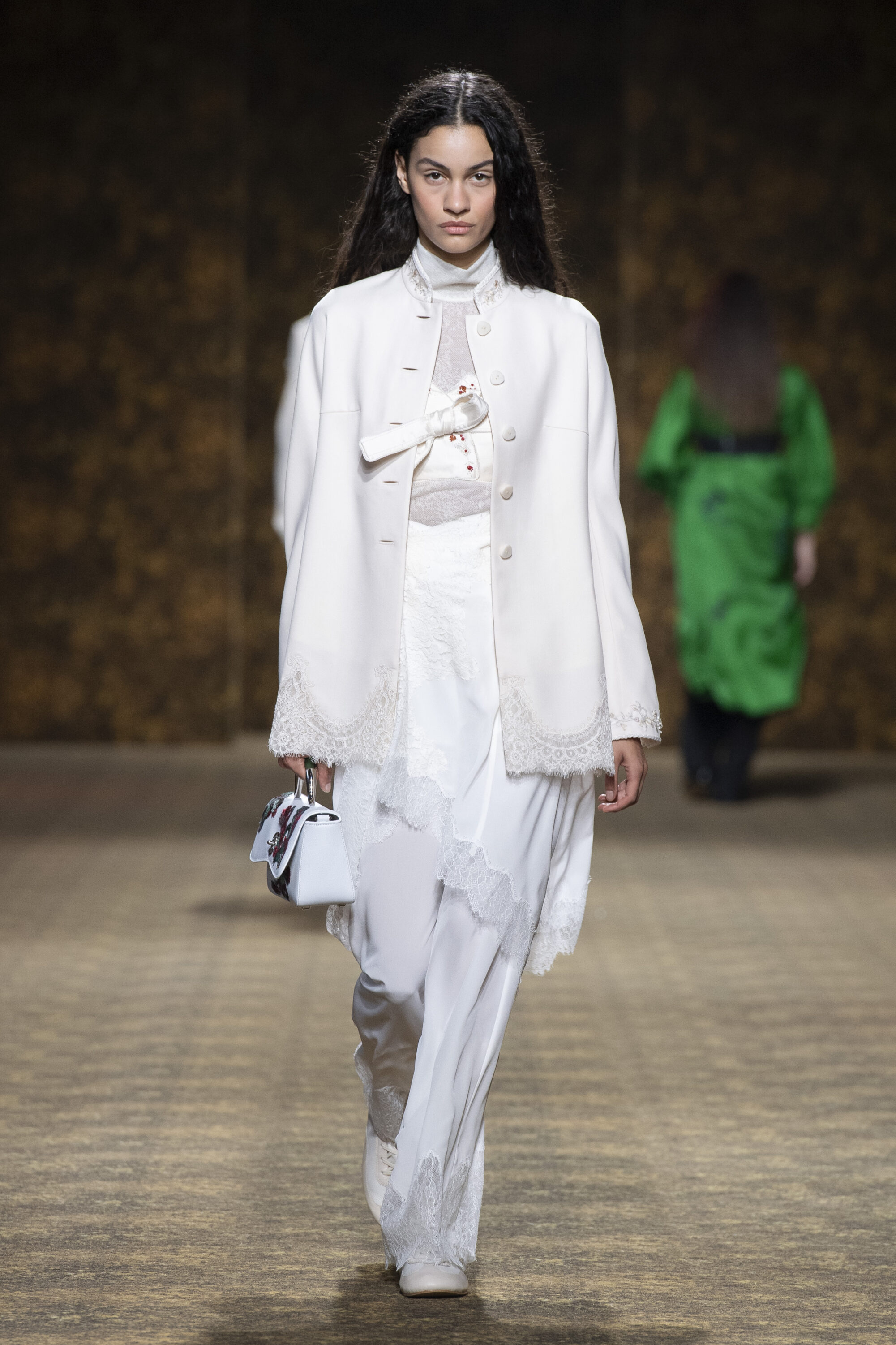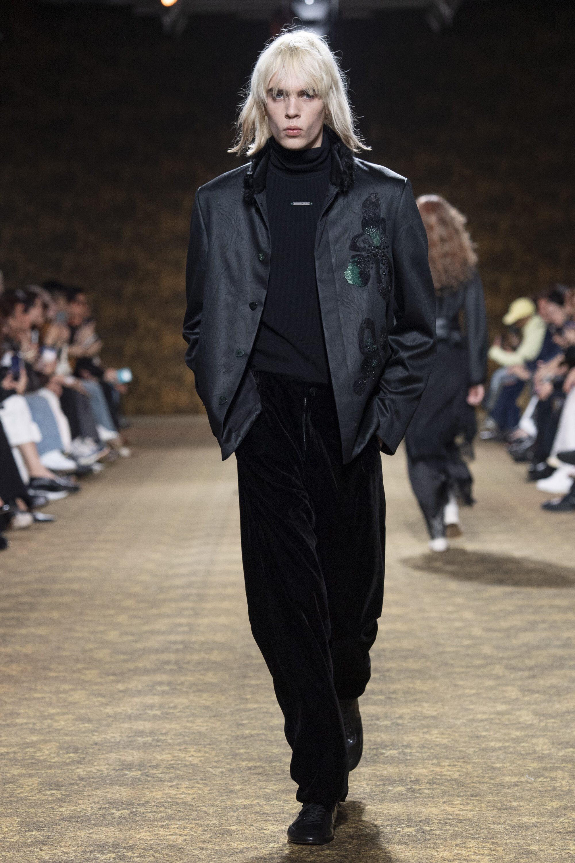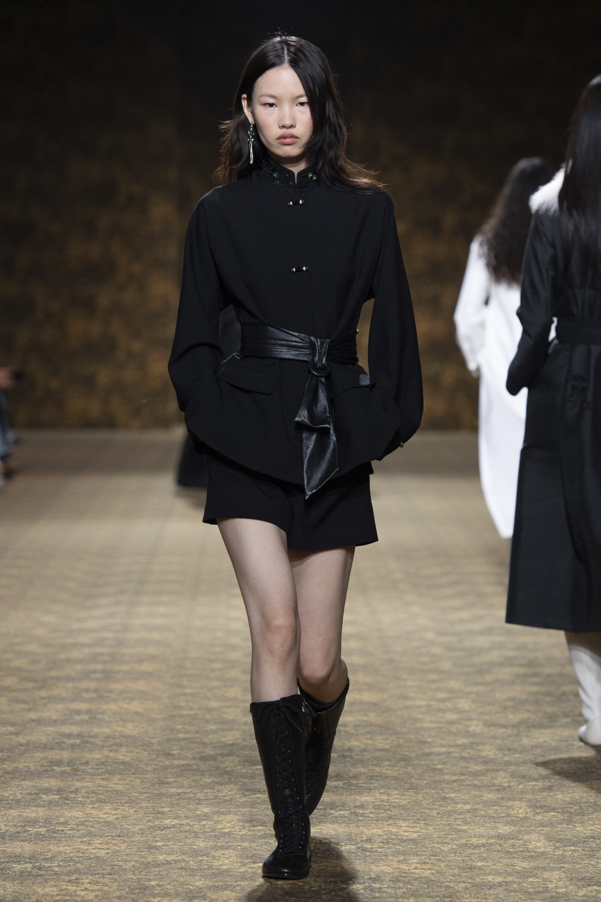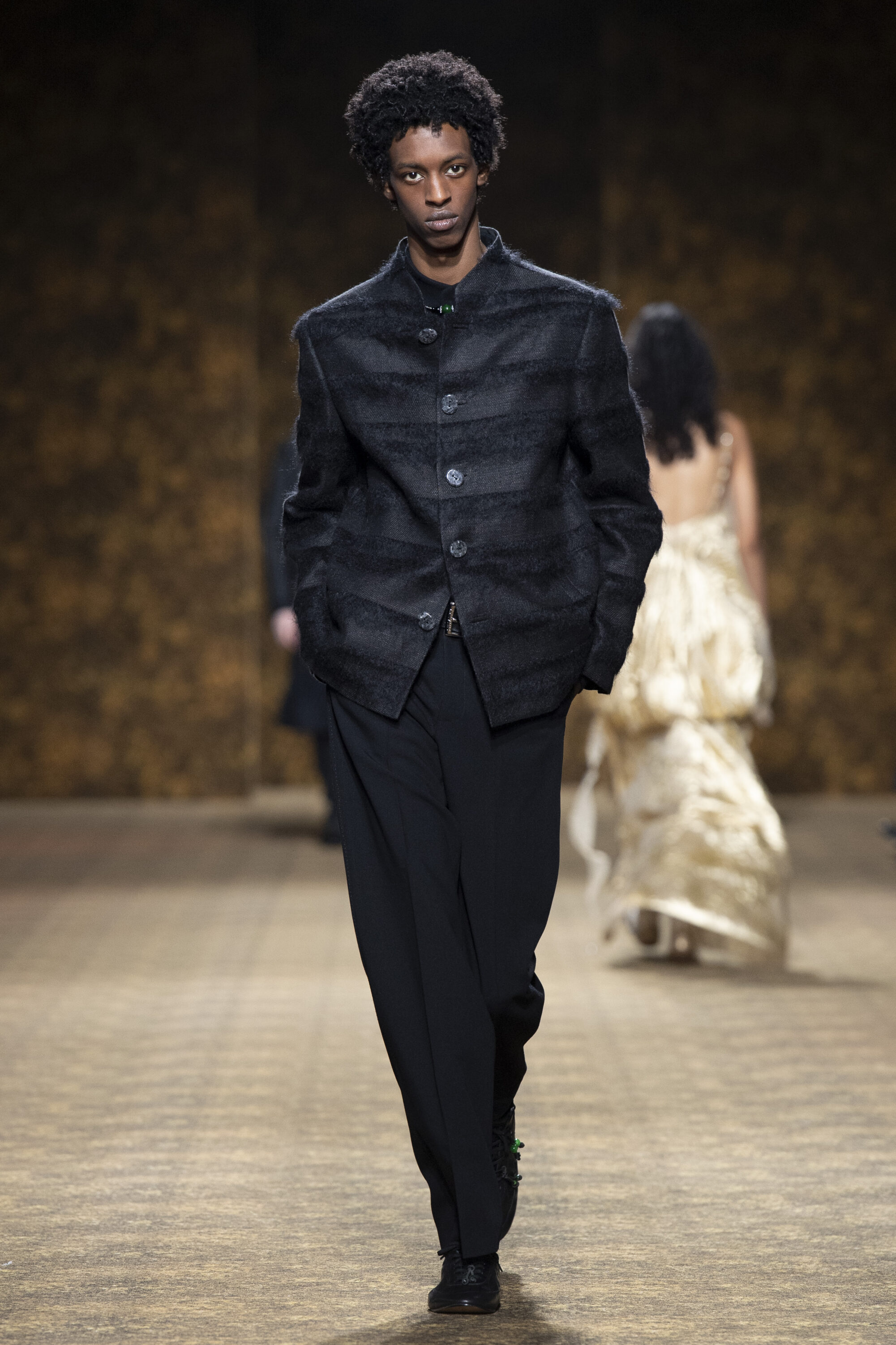 男裝延續盛世的飽和能量,透過陰刻刺繡與仿舊處理讓時間在布料留下痕跡。其中西裝外繫腰封、方形連袖與中式鑲邊口袋,構築剛勁而內斂的細節,細小玉石裝飾與毛料點綴領口袖口,營造如壁畫般的質地,在歷史感與當代剪裁間取得精準平衡。