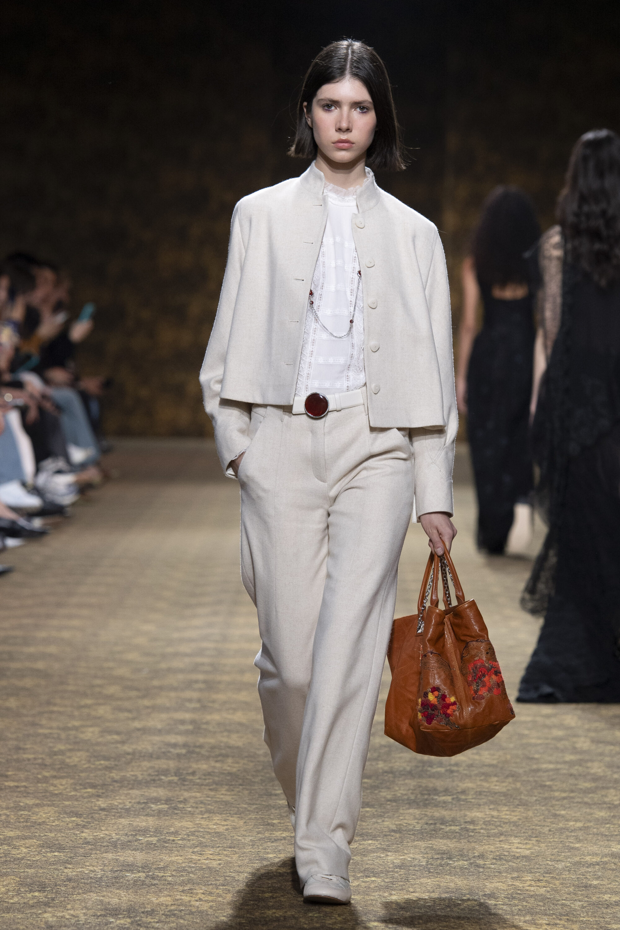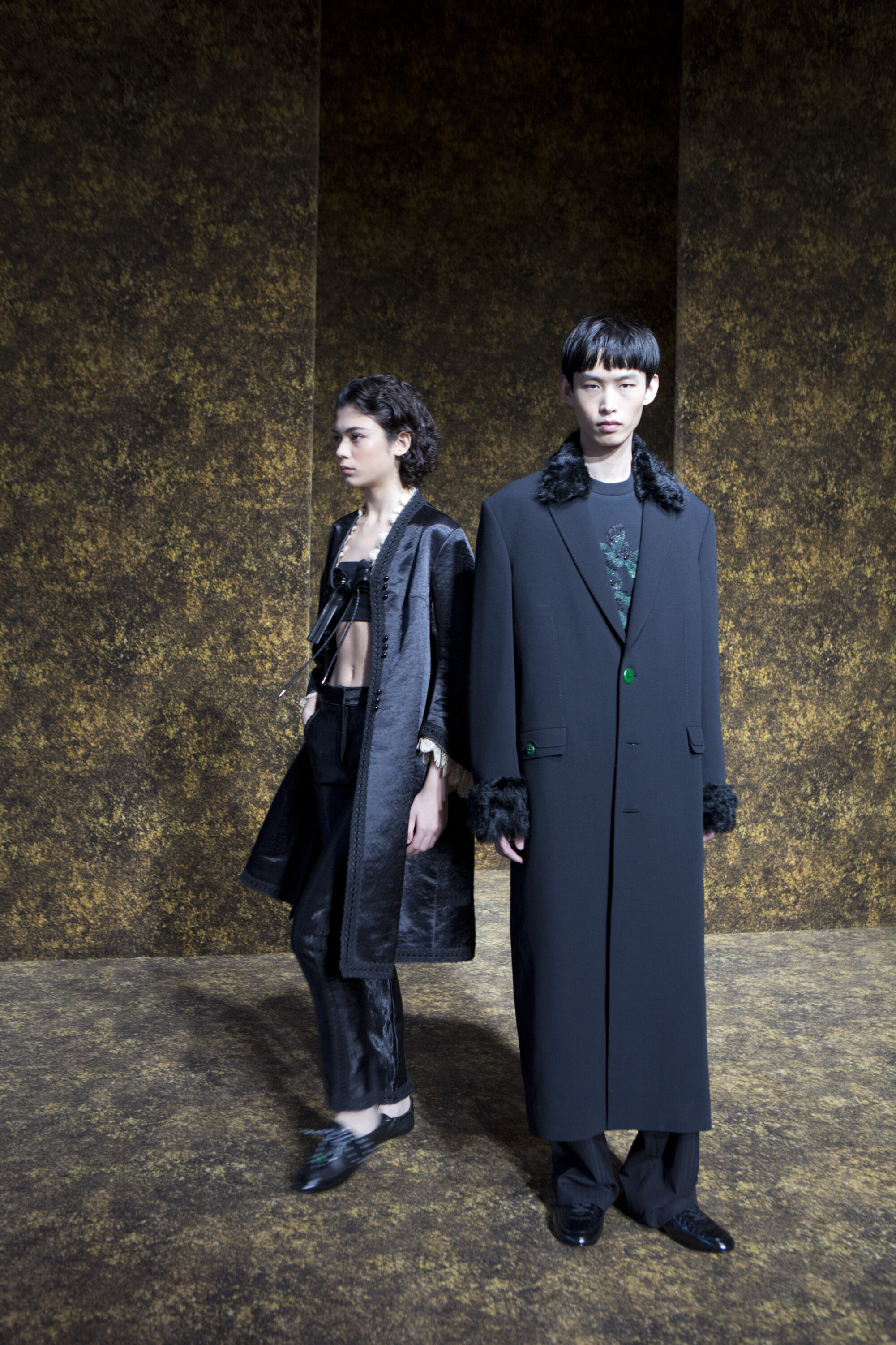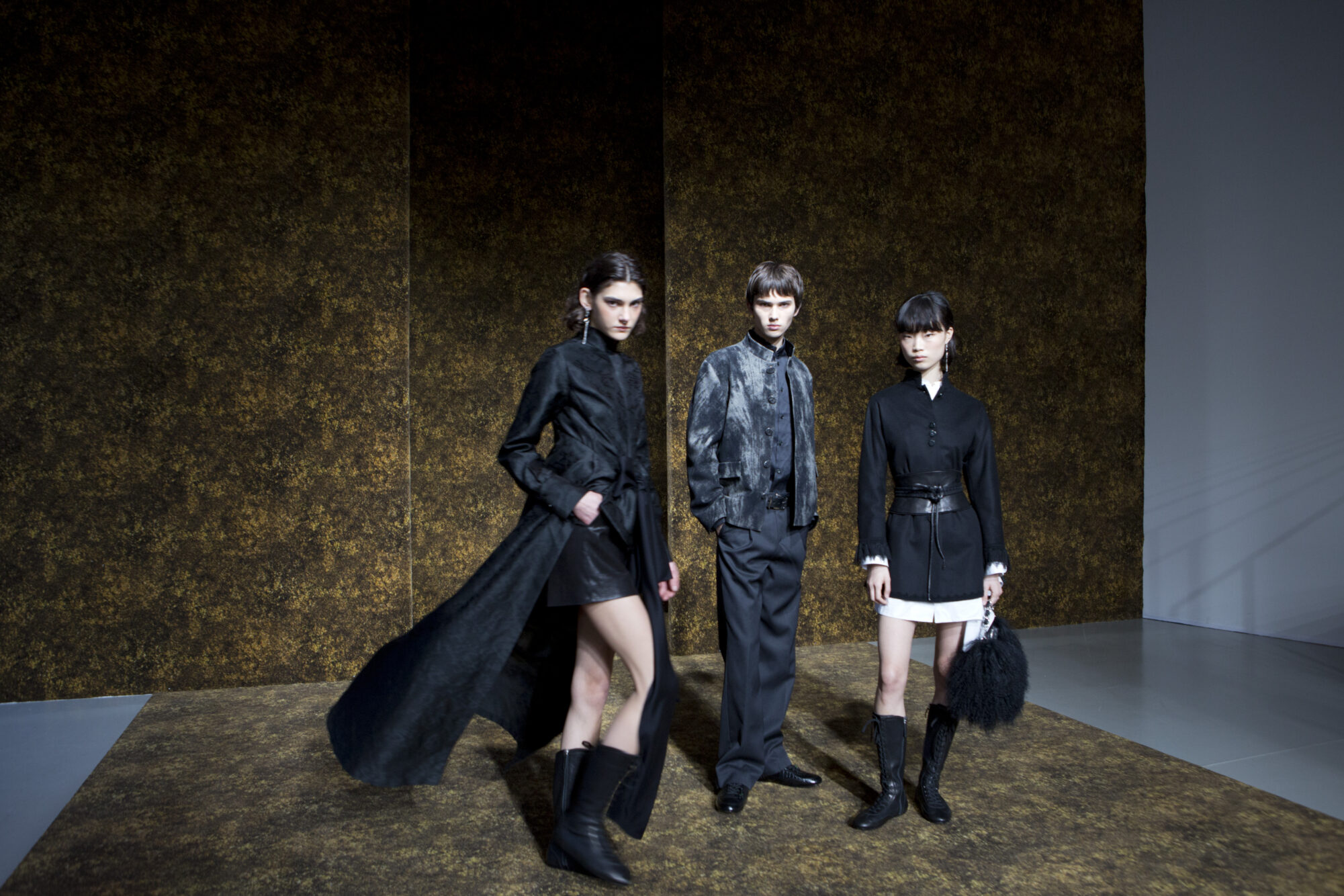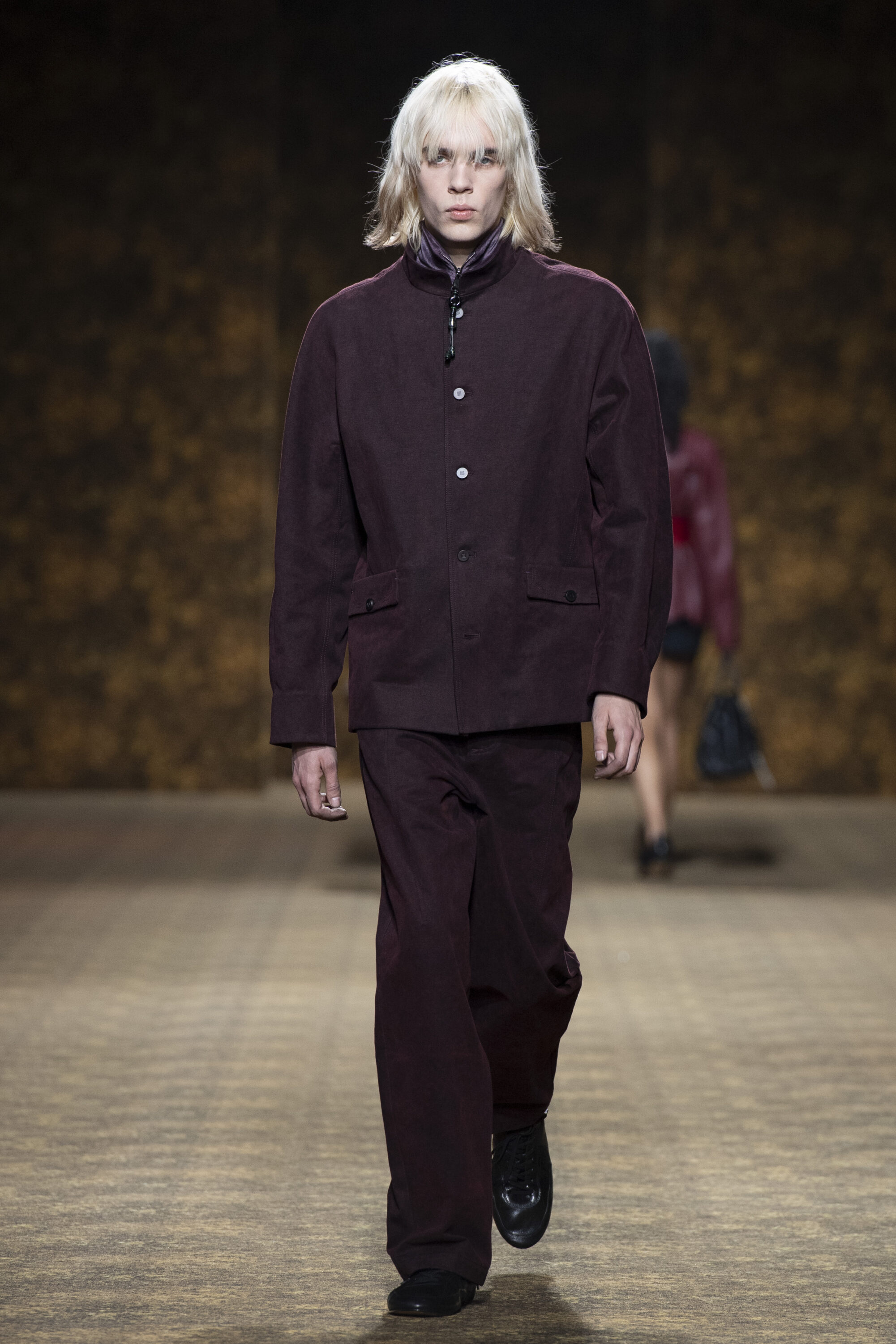 男裝延續盛世的飽和能量,透過陰刻刺繡與仿舊處理讓時間在布料留下痕跡。其中西裝外繫腰封、方形連袖與中式鑲邊口袋,構築剛勁而內斂的細節,細小玉石裝飾與毛料點綴領口袖口,營造如壁畫般的質地,在歷史感與當代剪裁間取得精準平衡。