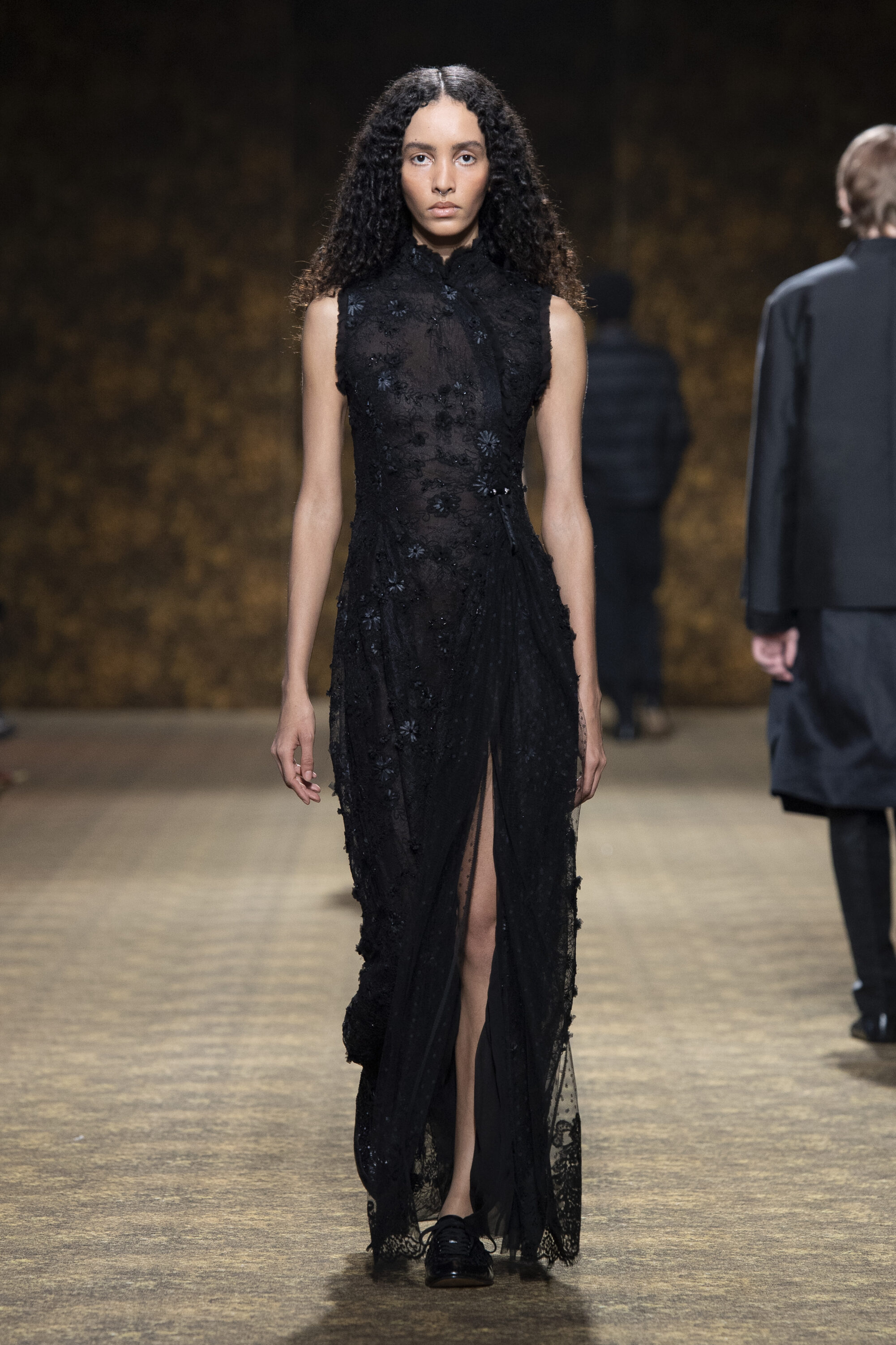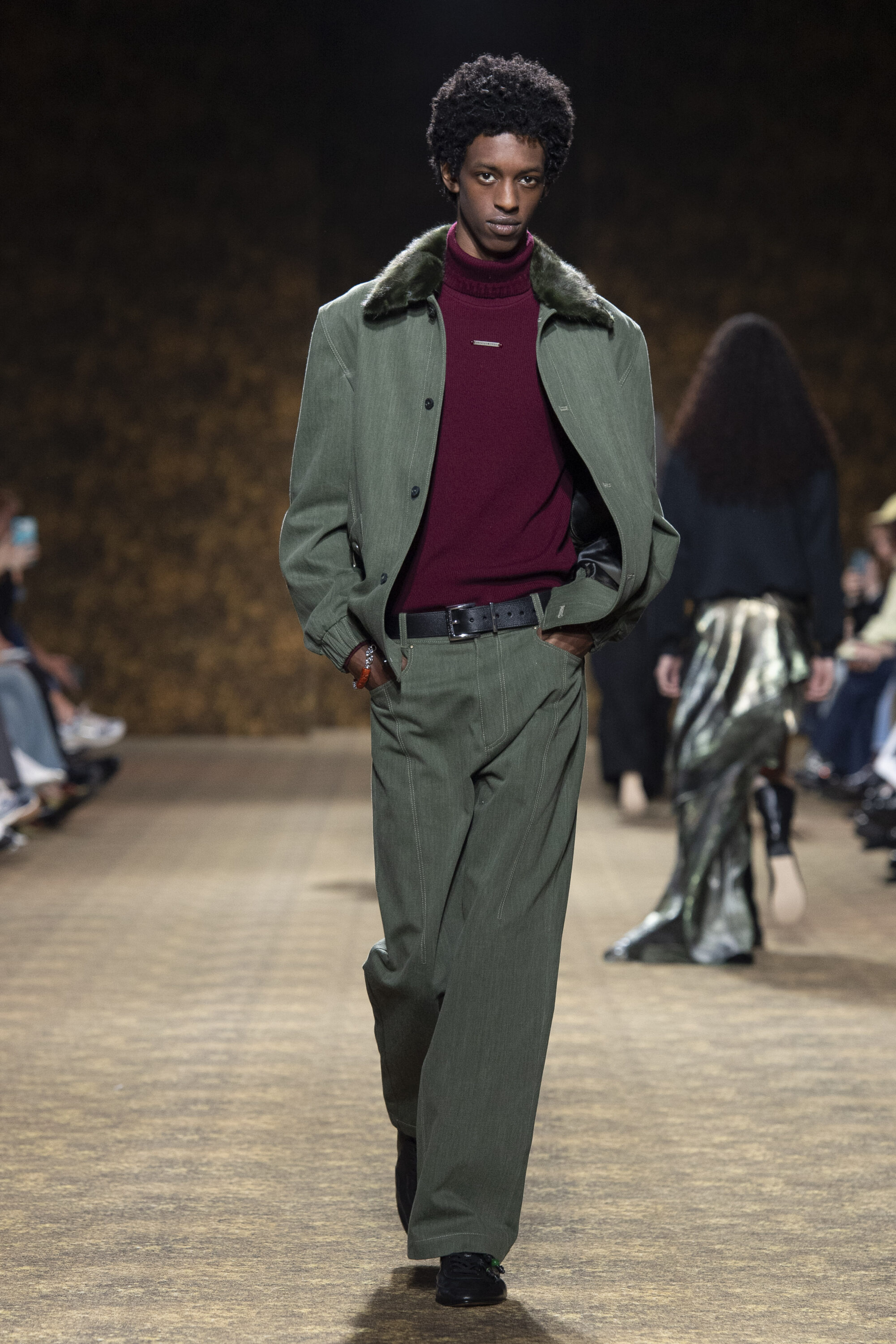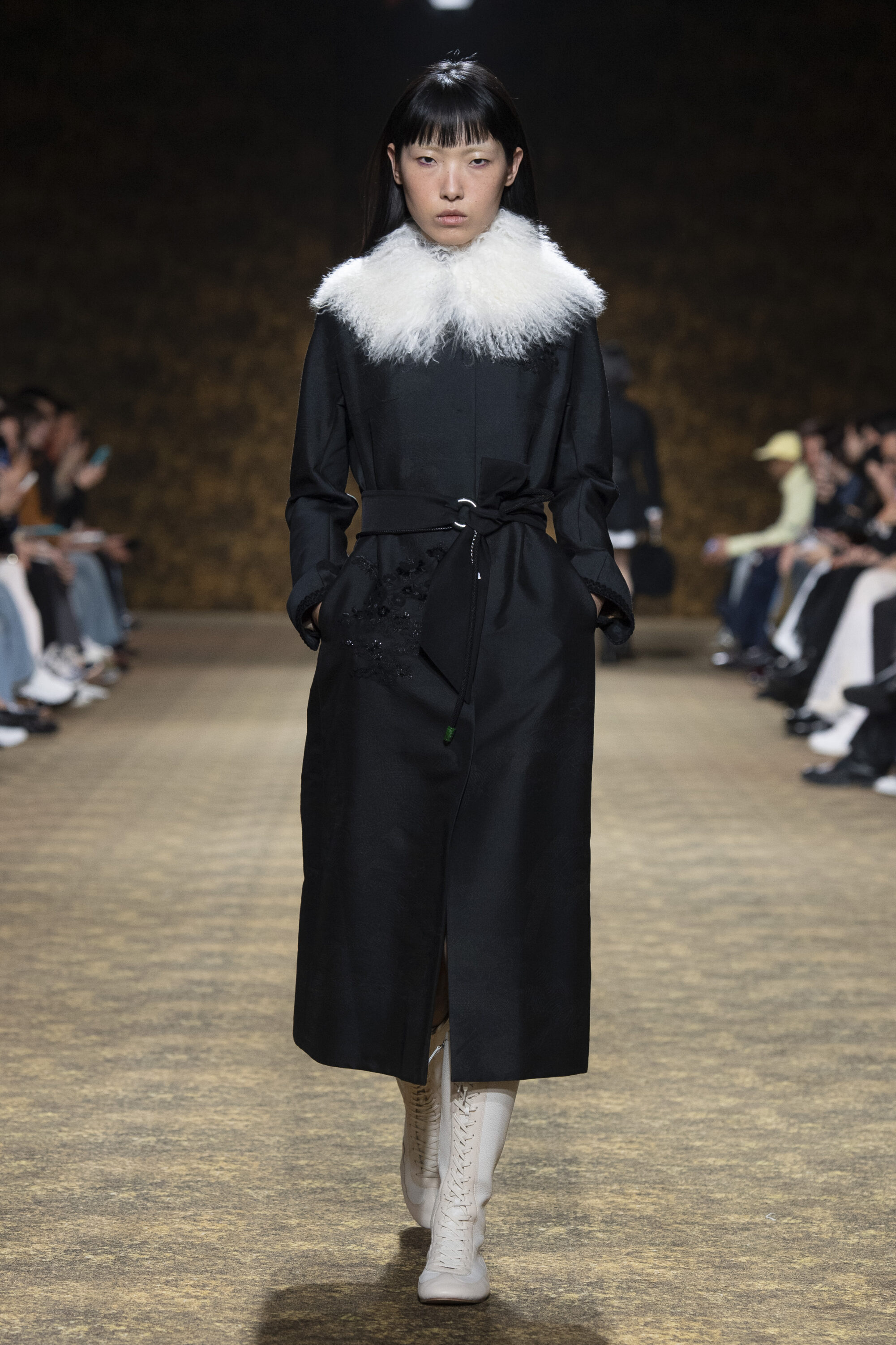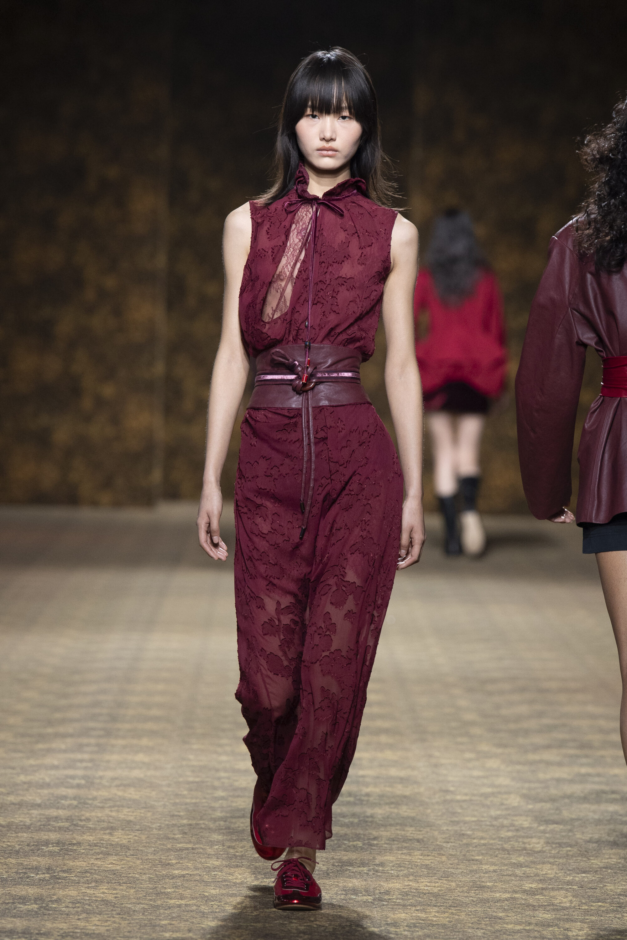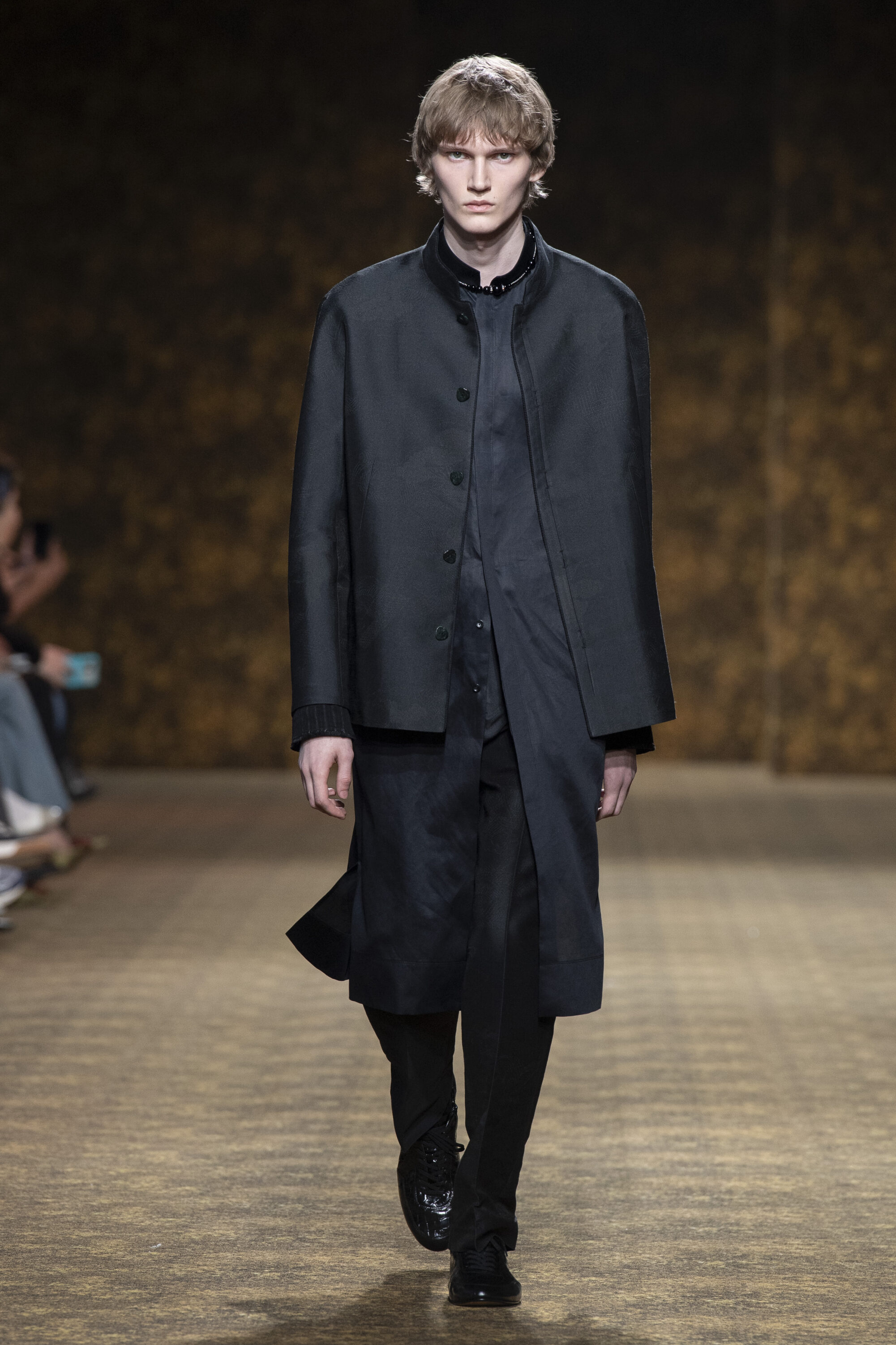男裝延續盛世的飽和能量,透過陰刻刺繡與仿舊處理讓時間在布料留下痕跡。其中西裝外繫腰封、方形連袖與中式鑲邊口袋,構築剛勁而內斂的細節,細小玉石裝飾與毛料點綴領口袖口,營造如壁畫般的質地,在歷史感與當代剪裁間取得精準平衡。